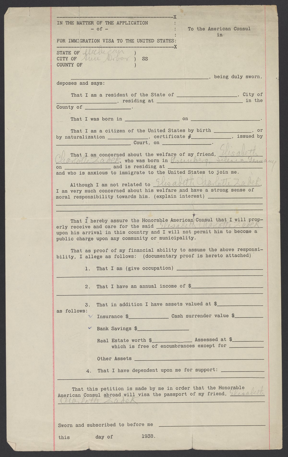 Bredig, Max Albert. “Application for Immigration Visa for Elizabeth Charlotte Zadek,” 1938. Papers of Georg and Max Bredig, Box 7, Folder 19. Science History Institute. Philadelphia. https://digital.sciencehistory.org/works/41t7f07.