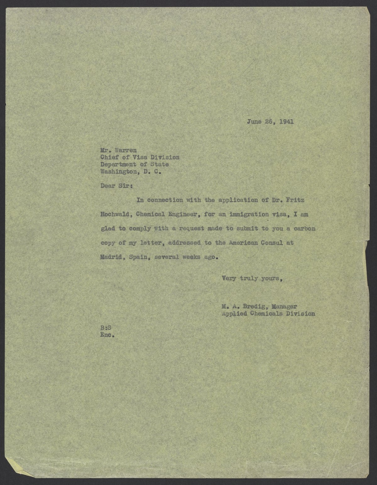Letter from Max Bredig to Mr. Warren, June 26, 1941