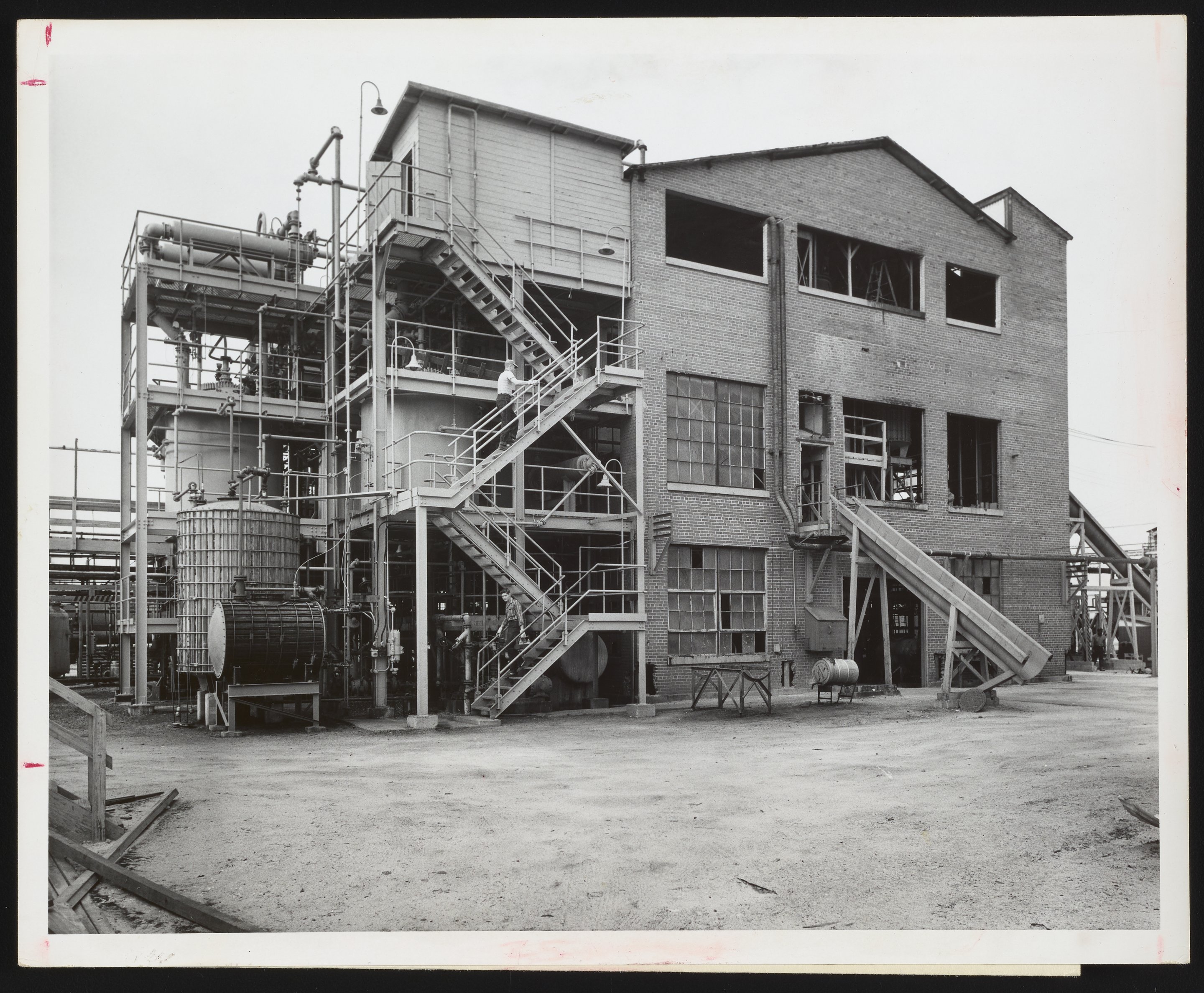 General view of the exterior of the manufacturing facilities for Toxaphene, an insecticide concentrate, at the Hercules Powder Company plant in Brunswick, Georgia. One of two Hercules plants specializing in naval stores, the Brunswick plant extracted rosin, turpentine, and pine oil from pine tree stumps in order to produce a range of chemicals used in the manufacture of varnishes, paints, adhesives, insecticides, textiles, and other industrial products. The employees visible on the stairs are identified as Homer Brogden (top) and Tommy Beasley.