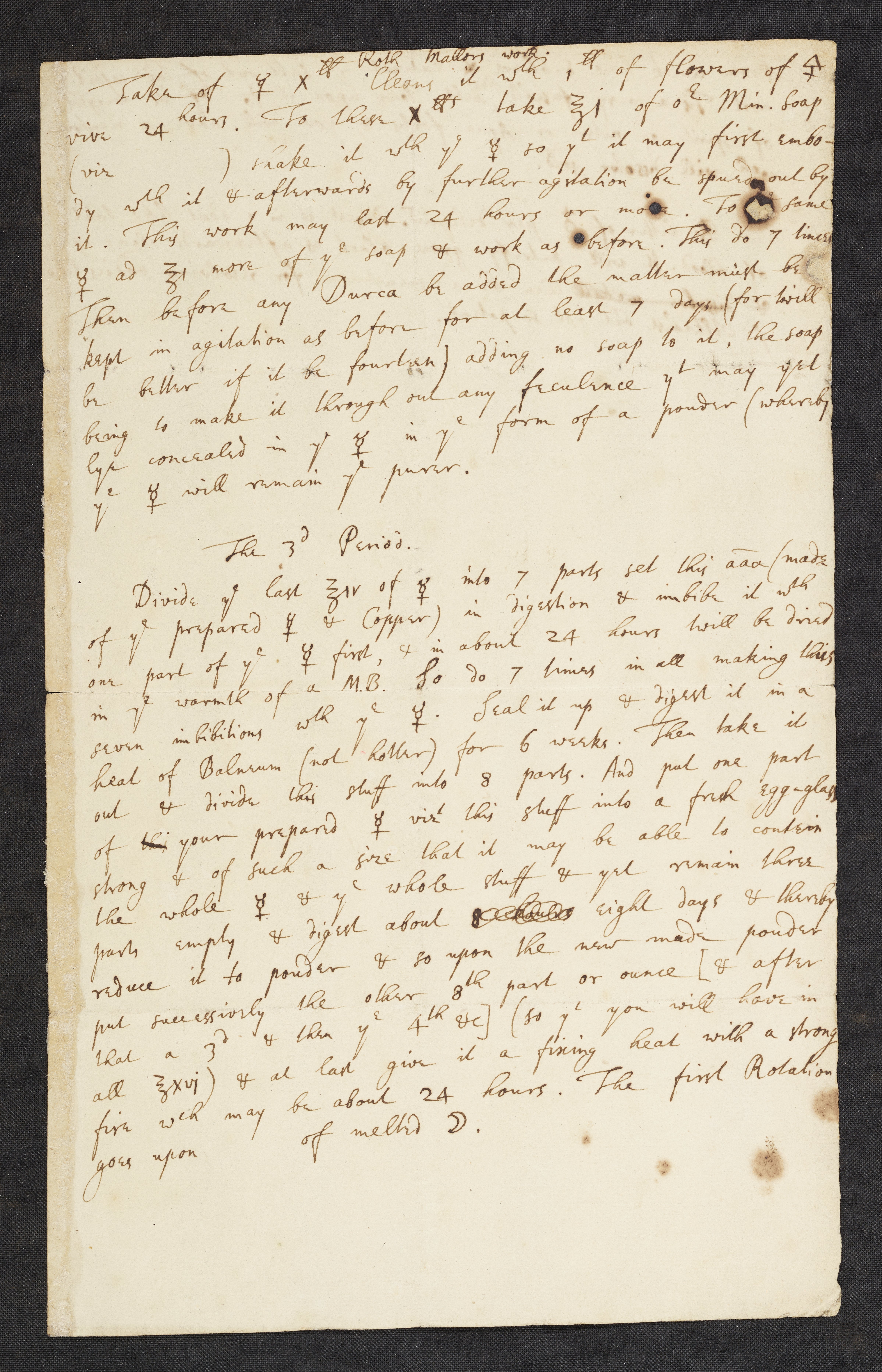 This manuscript sheds light on a story involving three prominent thinkers of late-17th-century England: Isaac Newton (1643-1727), John Locke (1632-1704), and Robert Boyle (1627-1691). After Boyle's death, Newton, with the help of Locke, pursued Boyle's collection of alchemical processes to uncover the secret of metallic transmutation. This manuscript, written by Newton, contains the first and third period of the transmutation process drawn from a manuscript tract sent to Boyle by Erasmus Rothmaler. It serves to prove Newton's and Locke's interest in alchemical transmutation and their collaboration. A diary entry of Locke's dated May 10, 1692 contains the third-period recipe verbatim, except in Latin rather than English, along with the recipe found on the verso of the manuscript.