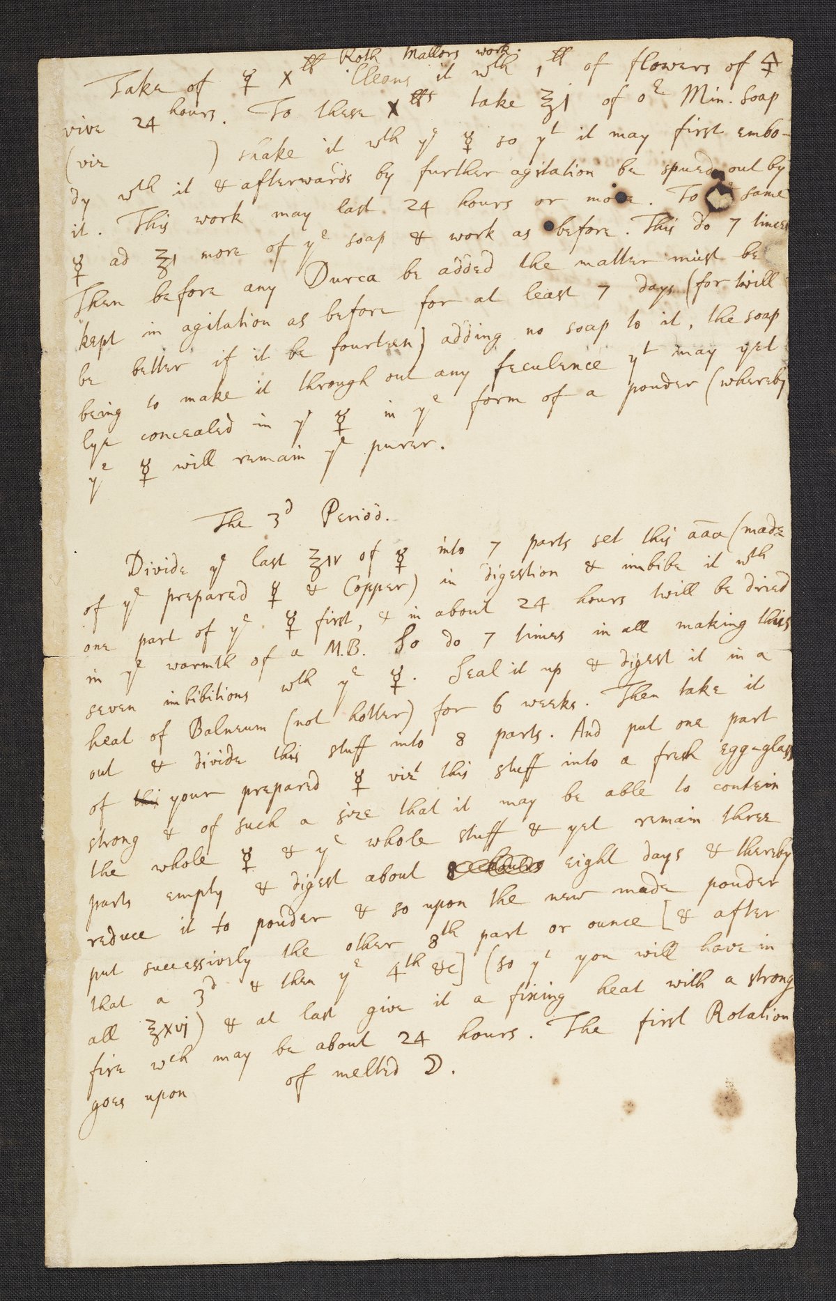 Small JPG1200 x 1867px — 421 KBLarge JPG2880 x 4482px — 2.2 MBFull-sized JPG4795 x 7462px — 5.6 MBOriginal fileTIFF — 4795 x 7462px — 102 MBWritten in Isaac Newton's hand, Roth Mallor’s Work consists of extracts from the work of Erasmus Rothmaler, a German alchemist about whom essentially nothing is known. Text found on verso is two unrelated chemical recipes for "a menstruum that will disolve gold" and "a menstruum for resolving bodies like the Alkahest but not so potent."