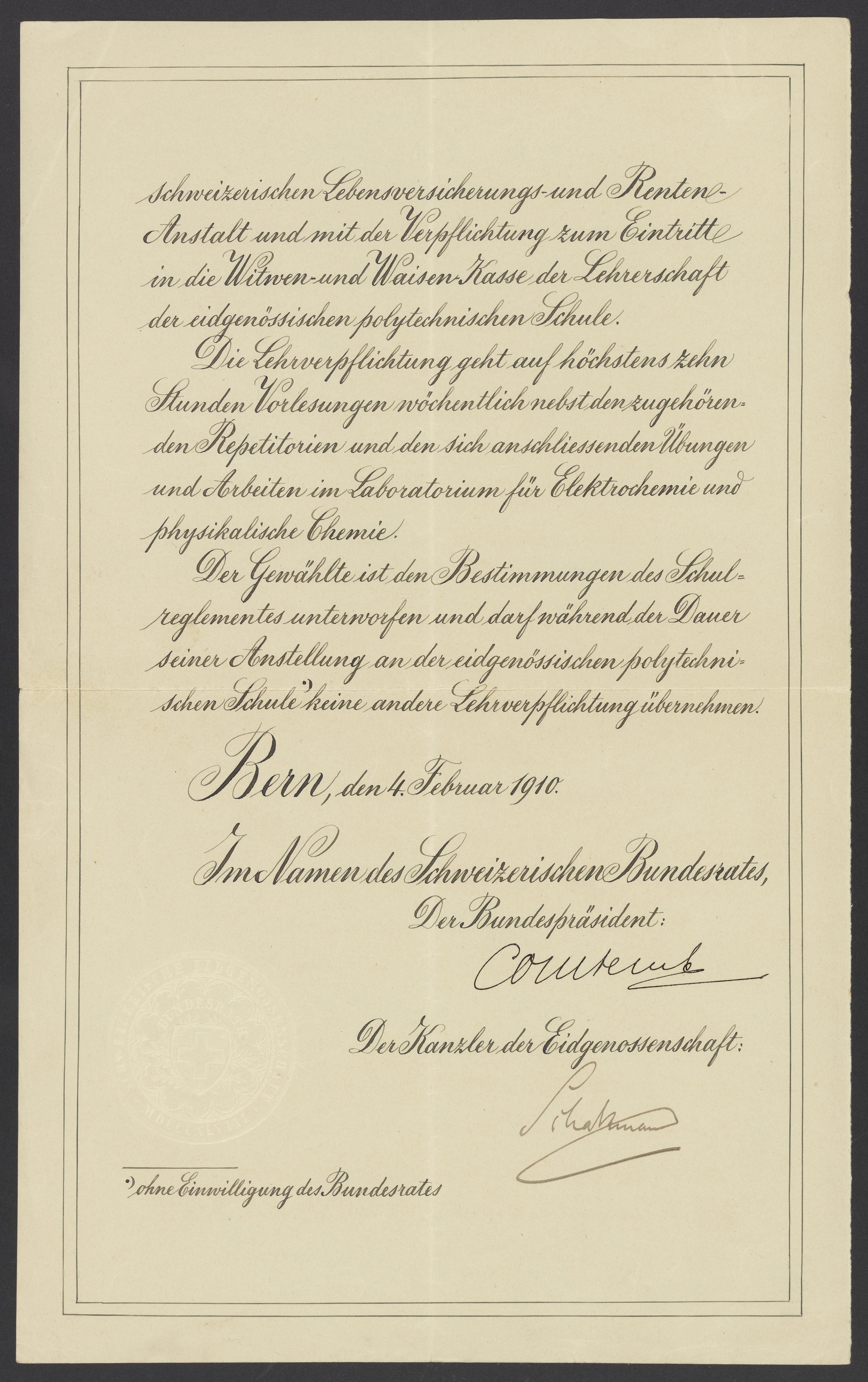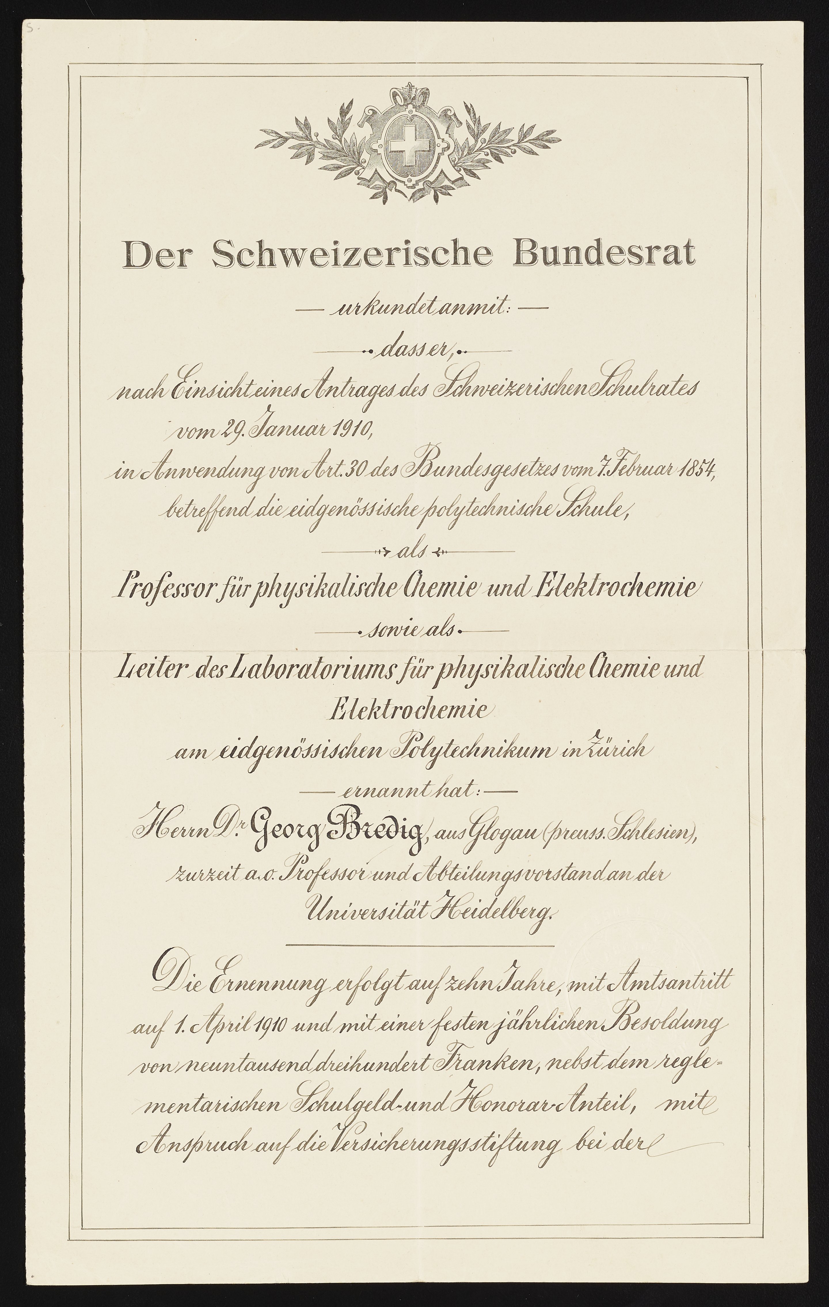 Small JPG1200 x 1890px — 319 KBLarge JPG2880 x 4537px — 1.4 MBFull-sized JPG3390 x 5340px — 1.8 MBOriginal fileTIFF — 3390 x 5340px — 51.8 MBA deed granting Georg Bredig (1868-1944) a position as professor and head of laboratories of physical chemistry and electrochemistry at the Eidgenössische Technische Hochschule Zürich (ETH Zürich). The ten-year appointment included a fixed salary of ninety-three hundred francs per year and benefits.