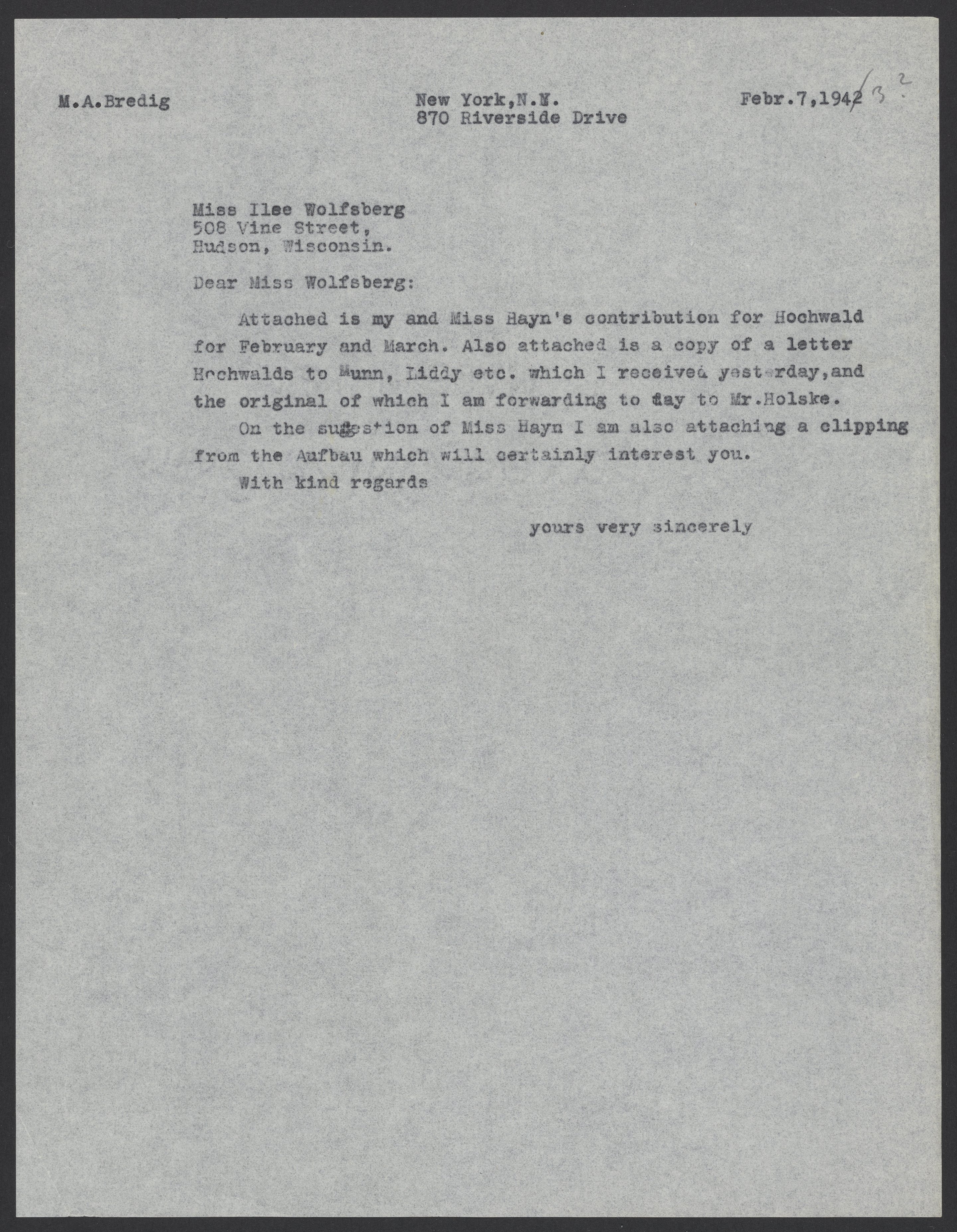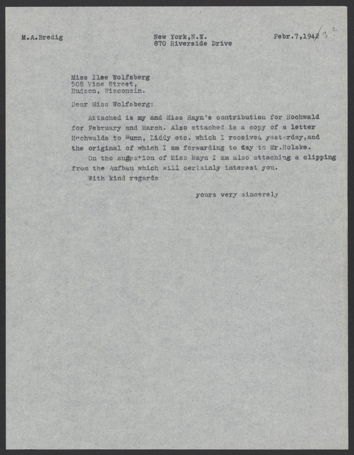 Letter from Max Bredig to Ilse Wolfsberg, February 7, 1942