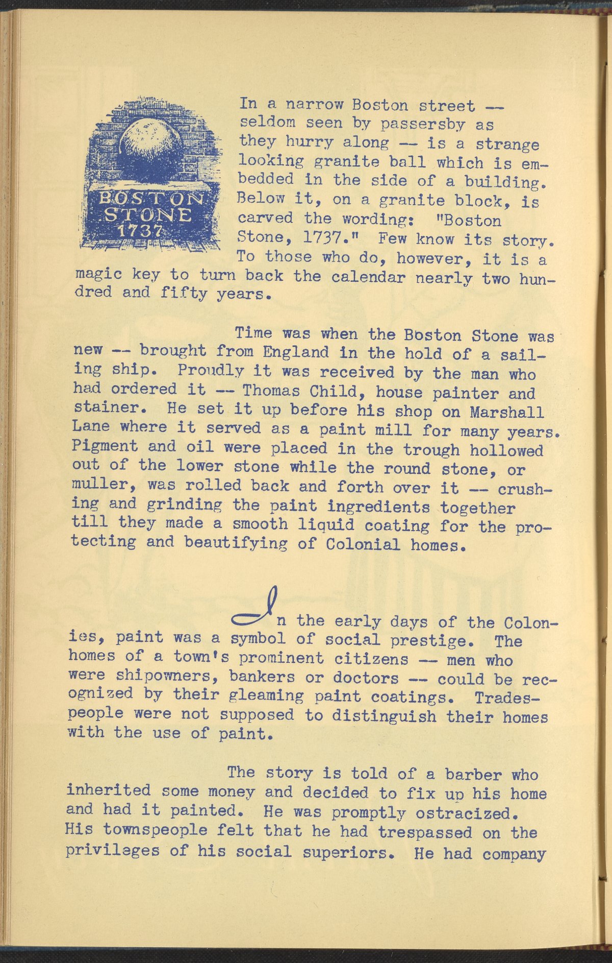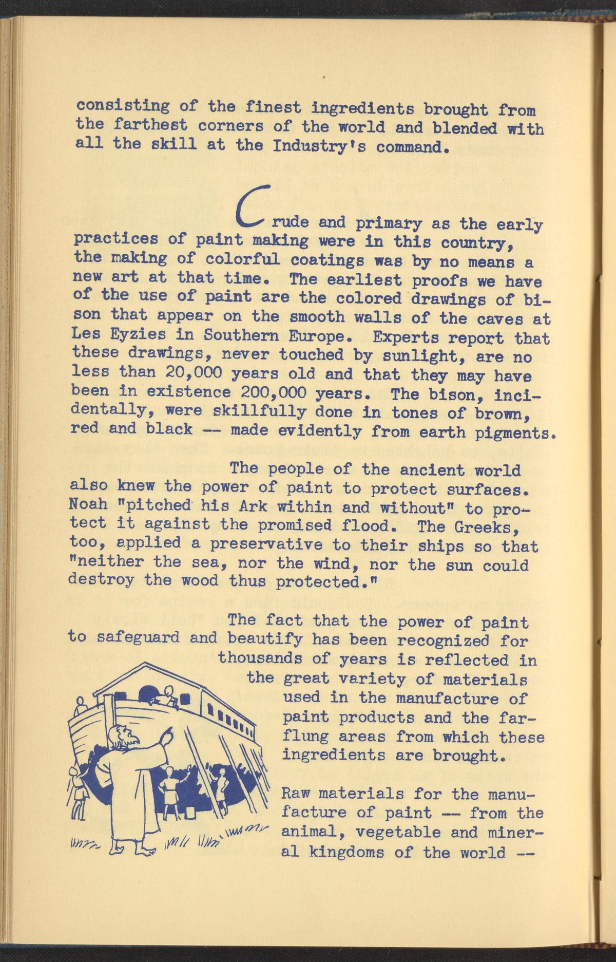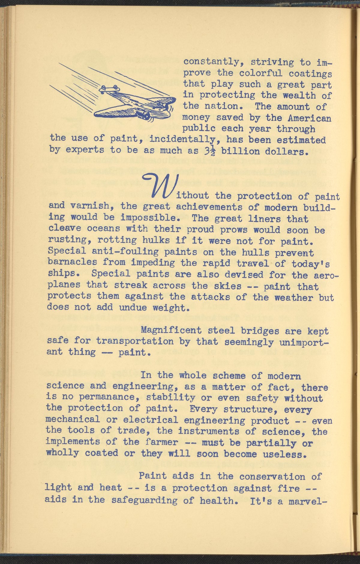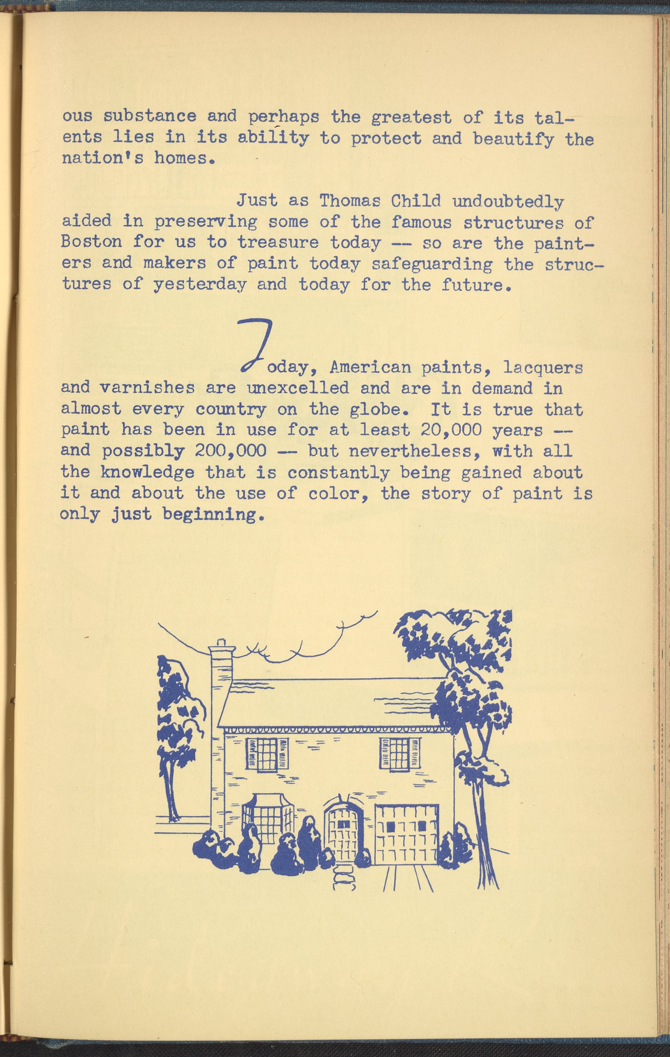Booklet corresponding to a radio broadcast program created by the National Paint, Varnish, and Lacquer Association. The booklet begins by discussing the history and use of paint and color during the colonial period of the United States. Describes paint-making practices, then, lists sources of paint products such as the animal kingdom or mineral kingdom. For example, beeswax from bees, or chalk from the Chalk Cliffs of Dover. Finally, describes how modern construction is made possible by the protection of paint and varnish products. Includes small stylized illustrations throughout and decorated covers.