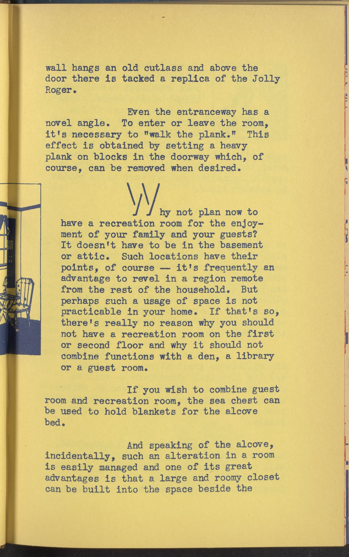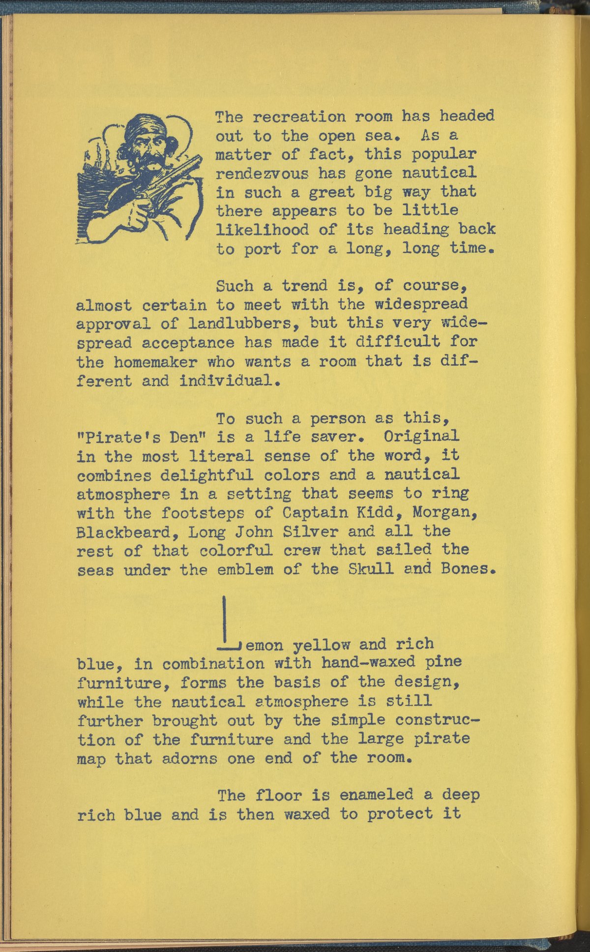 Booklet corresponding to a radio broadcast program created by the National Paint, Varnish, and Lacquer Association. The booklet describes a recreation room decorated with a nautical theme called the Pirate's Den. Provides inspiration for homeowners seeking to decorate a recreational space in their home. Includes small stylized illustrations throughout and decorated covers.