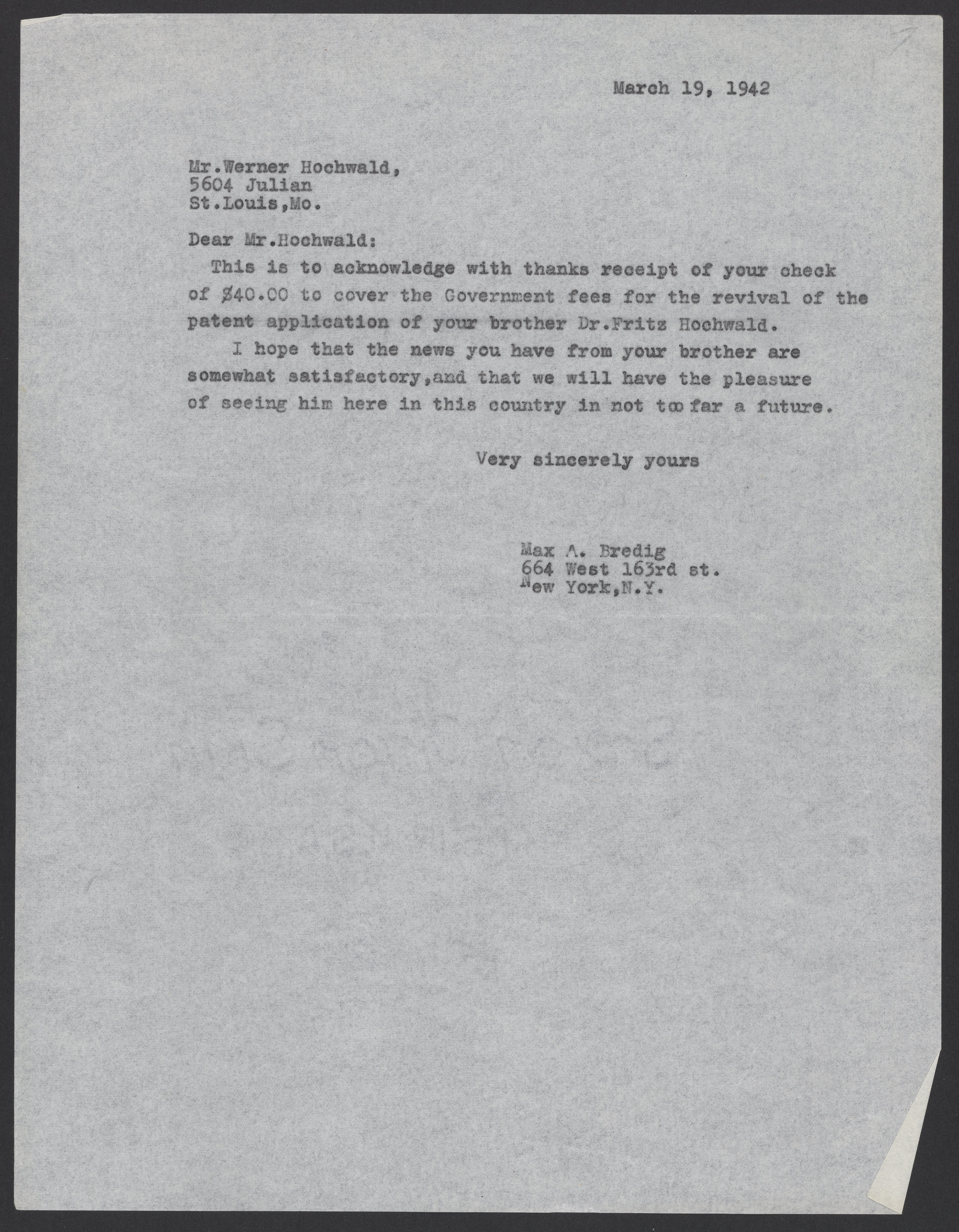 Max Bredig (1902-1977) acknowledges his receipt of $40 from Werner Hochwald (1910-1989) who has sent Bredig funds for his brother, Fritz Hochwald's (1897-1968) patent application.