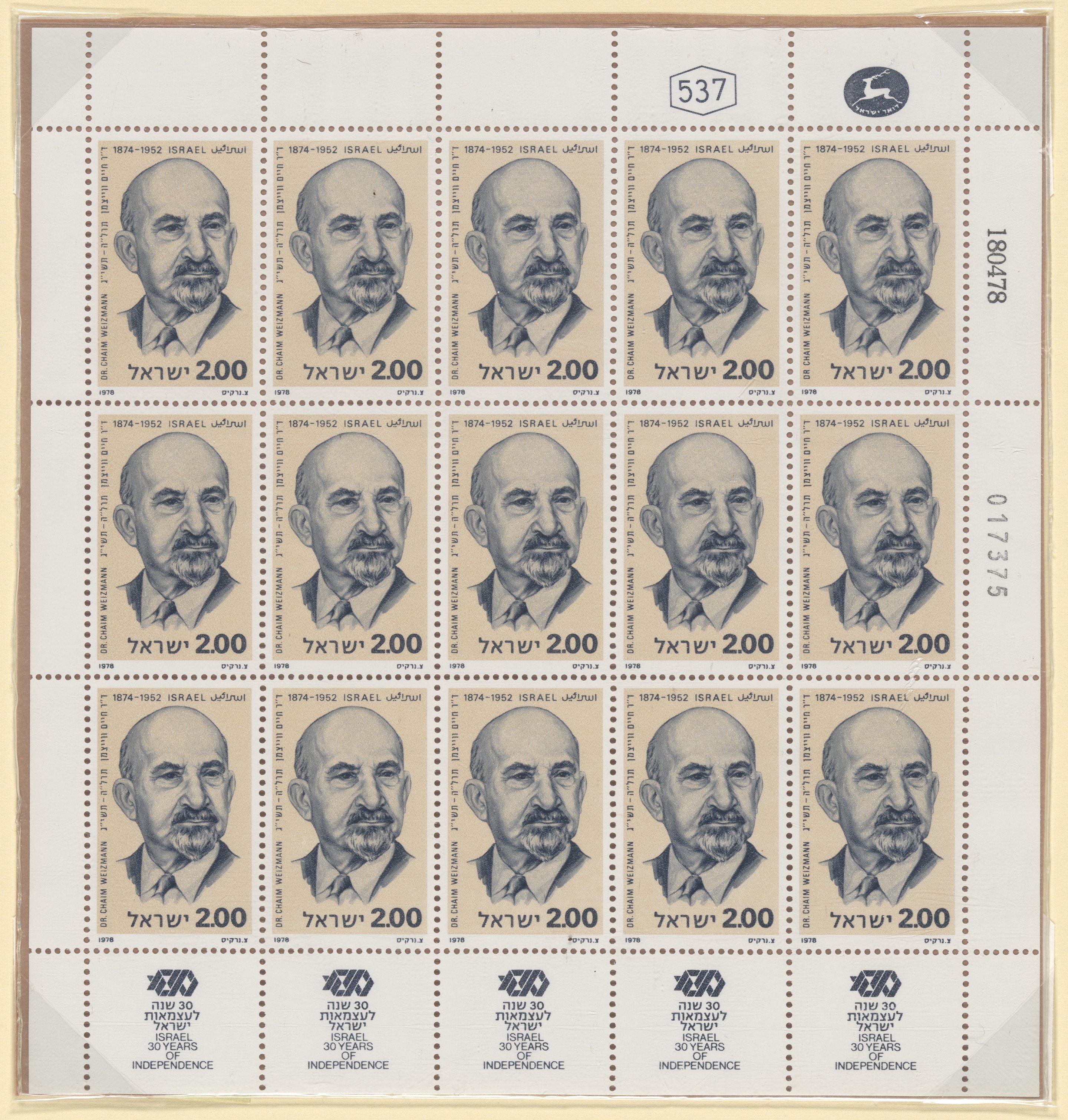 “Sheet of Stamps Depicting Chaim Weizmann,” 1978. Witco Stamp Collection, Box 1. Science History Institute. Philadelphia. https://digital.sciencehistory.org/works/4ec2f9x.