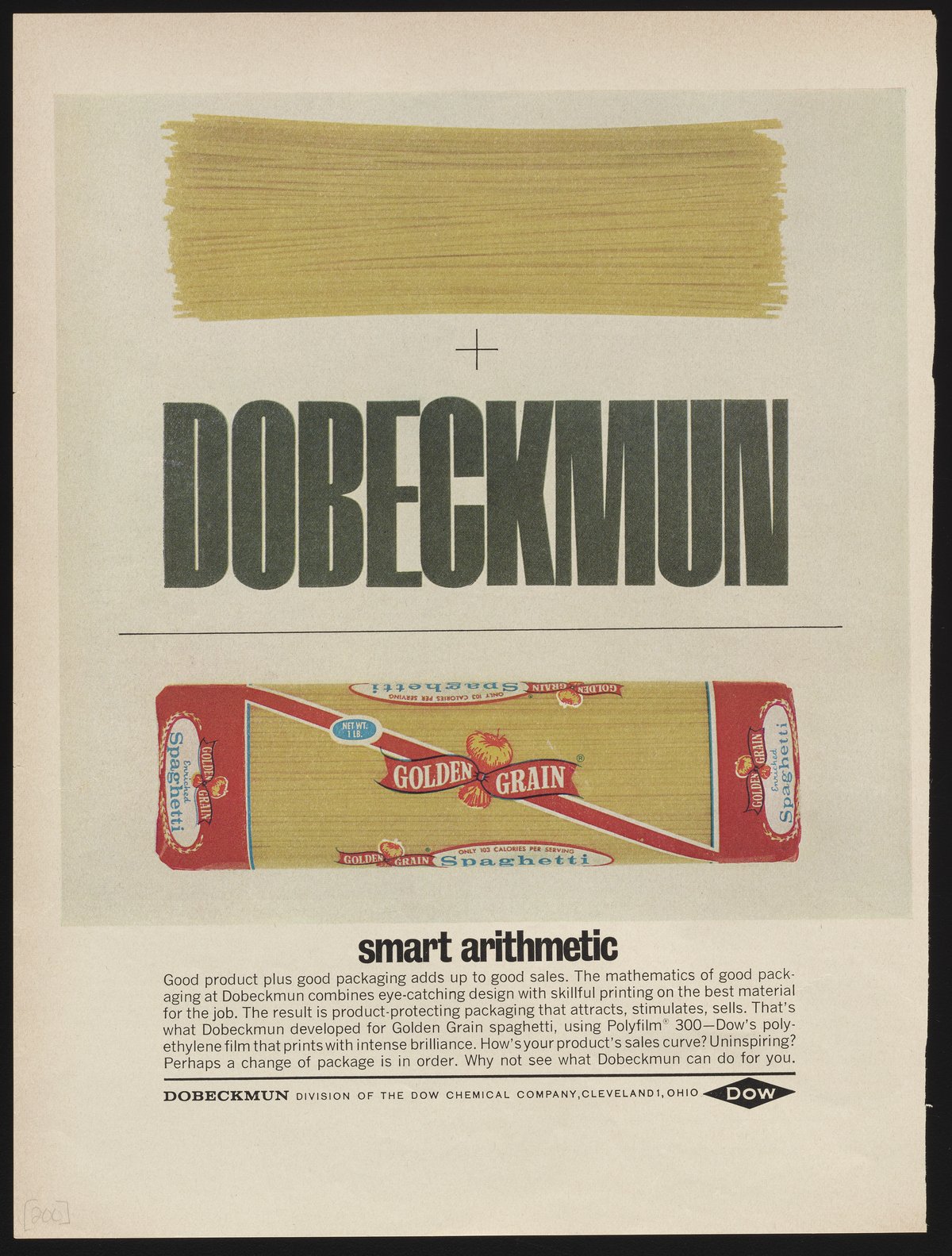 Color print advertisement for polyethylene film manufactured and sold by the Dobeckmun Company, a division of the Dow Chemical Company based in Cleveland, Ohio. The advertisement features a package of Golden Grain spaghetti wrapped in Dobeckmun Polyfilm, with accompanying text detailing the packaging's "eye-catching design" in order to underscore the packaging's ability to attract and stimulate sales.