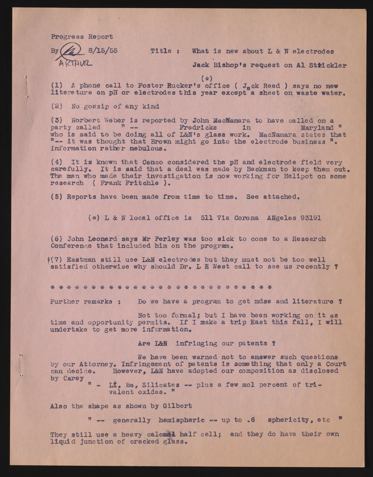 Arthur, Edwin P. “Progress Report on Glass Electrodes,” August 15, 1955. Beckman Historical Collection, Box 19, Folder 16. Science History Institute. Philadelphia. https://digital.sciencehistory.org/works/4f16c371f.