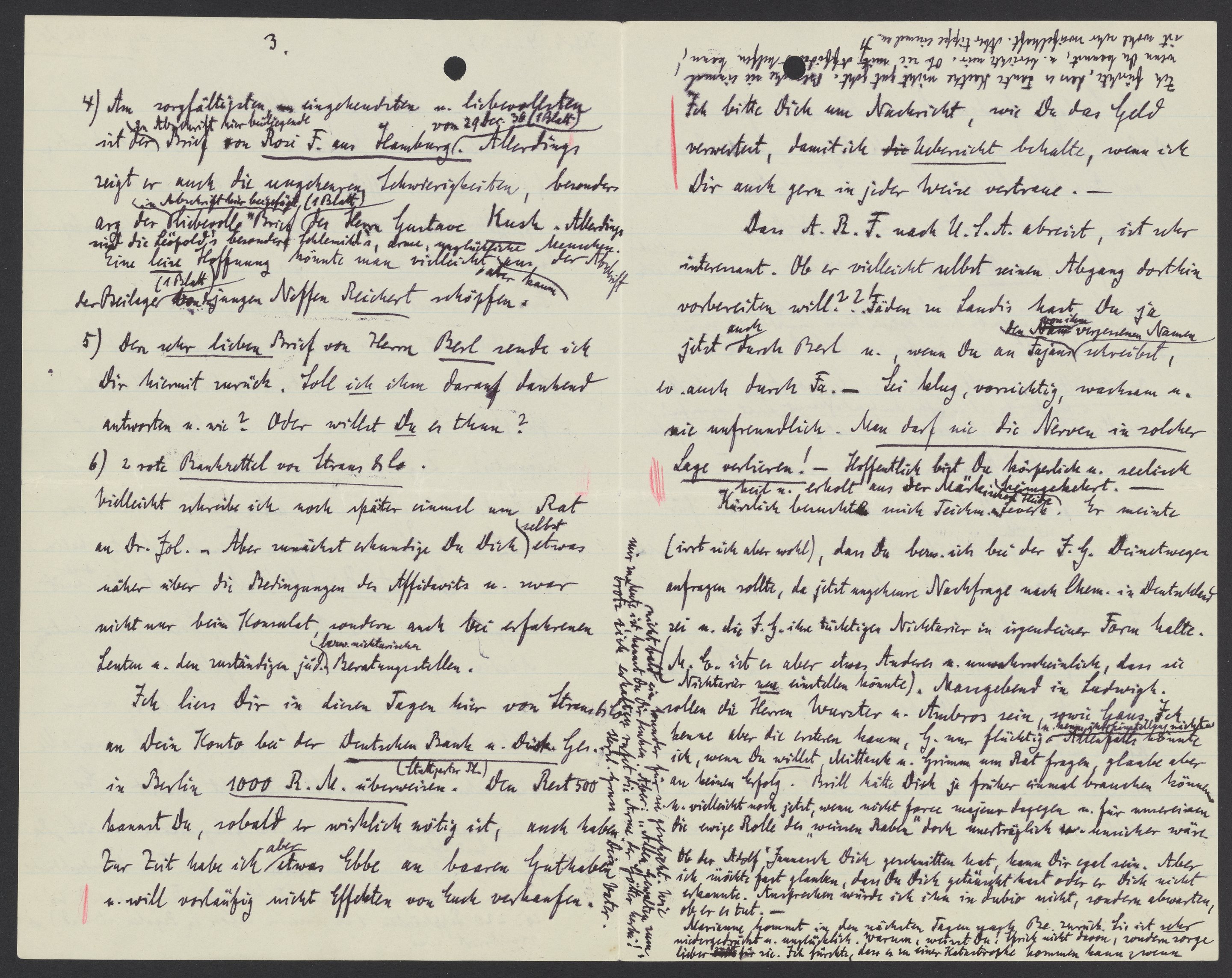 Small JPG1200 x 1797px — 368 KBLarge JPG2880 x 4313px — 1.8 MBFull-sized JPG3676 x 5505px — 2.8 MBOriginal fileTIFF — 3676 x 5505px — 58.0 MBGeorg Bredig (1868-1944) writes to his son, Max Bredig (1902-1977), to discuss personal, professional, and financial matters. He updates Max on immigration affidavit inquiries and mentions several items of correspondence that he has enclosed for Max to peruse for employment purposes. Georg also informs Max about a money transfer and mentions possible positions for chemists at I.G Farbenindustrie. However, he expresses doubt that Jewish chemists would be hired.
