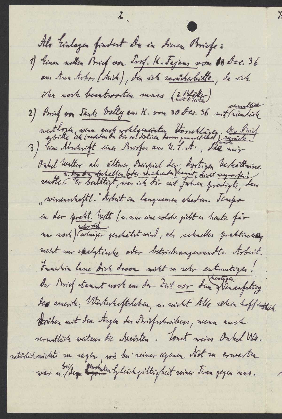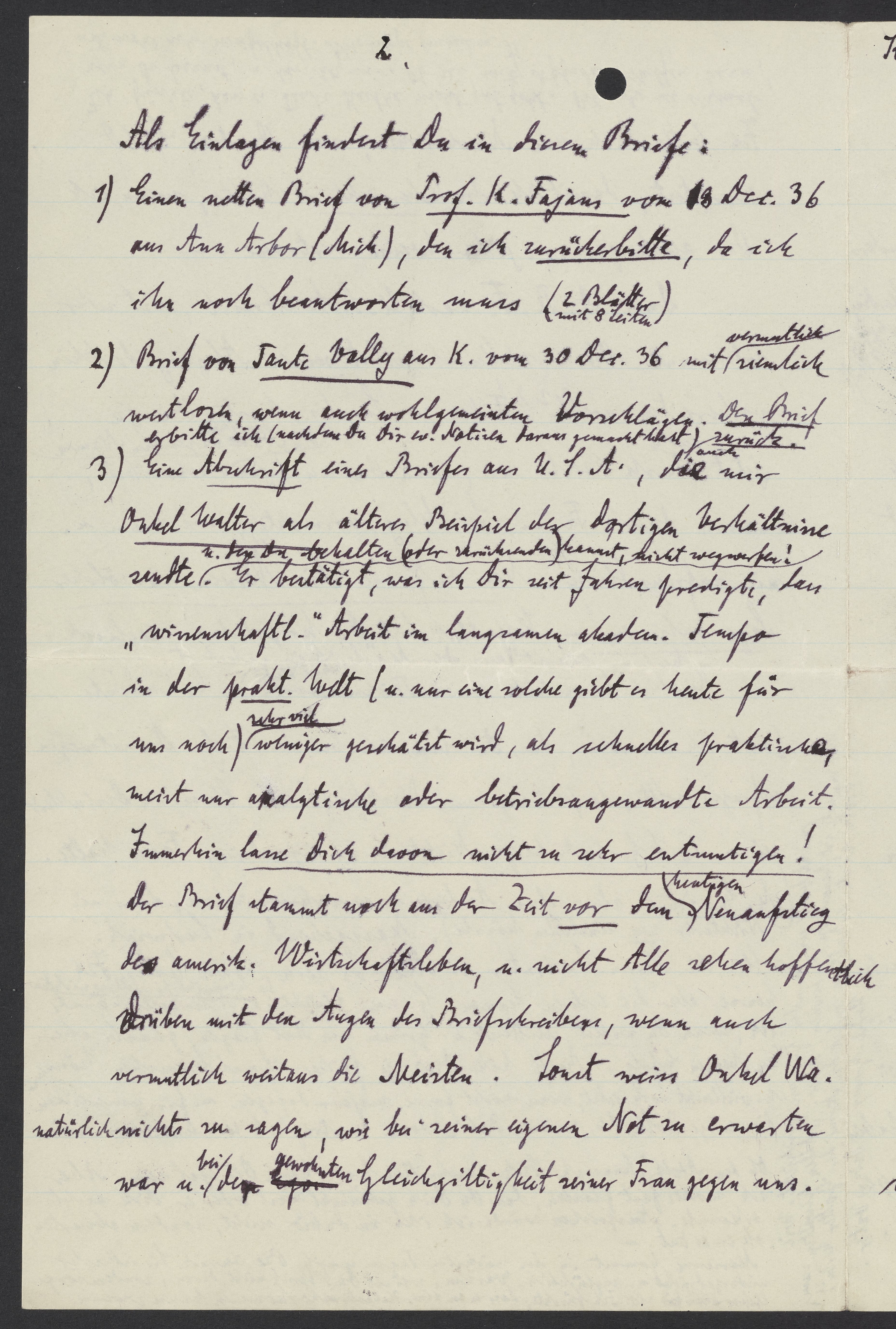 2) Brief von Tante Vally aus K. vom 30 Dec. 36 mit vermutlich ziemlich wertlosen, wenn auch wohlgemeinten Vorschlägen. Den Brief erbitte ich (nachdem Du Dir ev. Notizen daraus gemacht hast) auch zurück