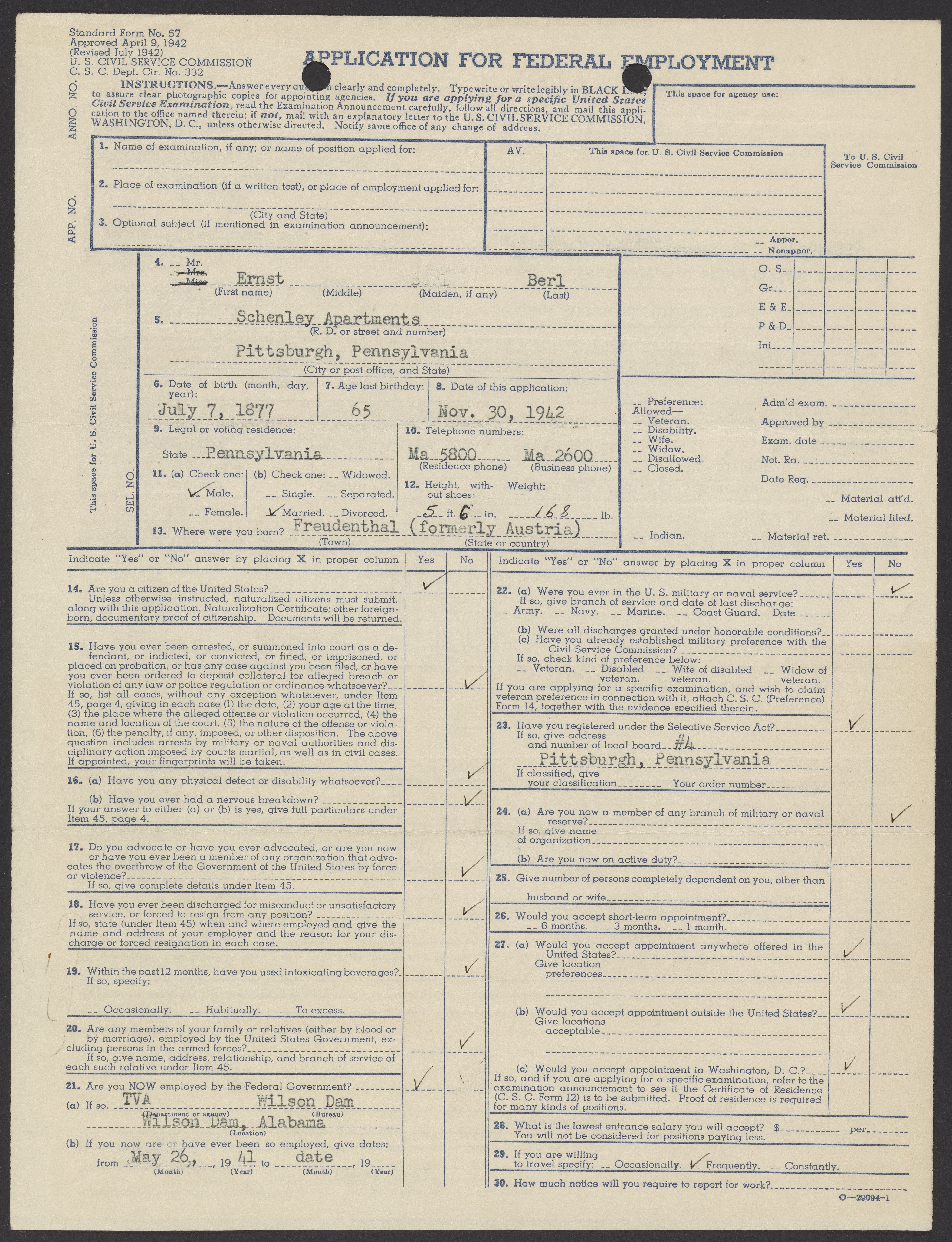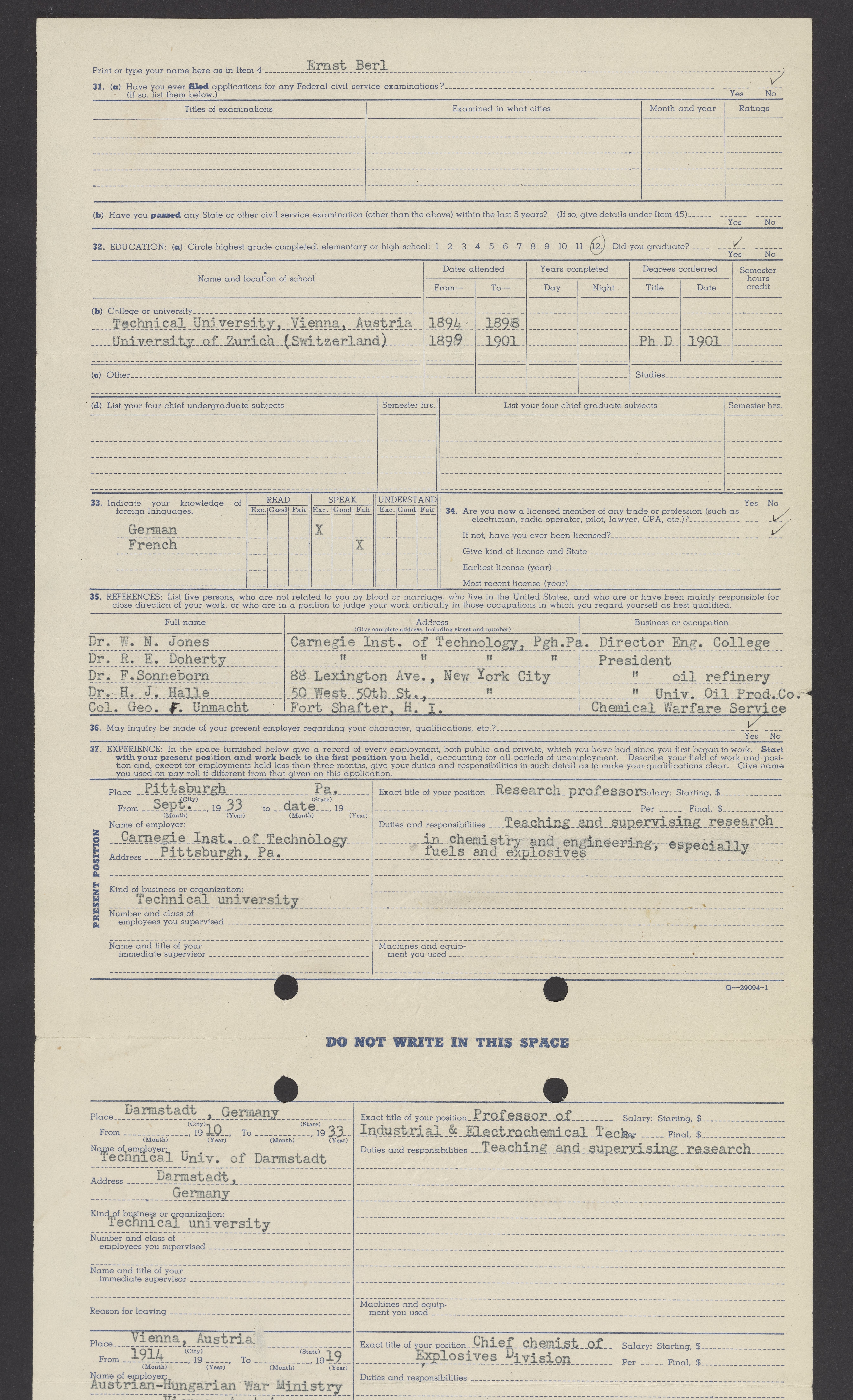 Small JPG1200 x 1565px — 434 KBLarge JPG2880 x 3756px — 2.2 MBFull-sized JPG5050 x 6586px — 6.3 MBOriginal fileTIFF — 5050 x 6586px — 95.2 MBErnst Berl's (1877-1946) application for federal employment, completed November 30, 1942, while Berl was living in Pittsburgh, Pennsylvania.