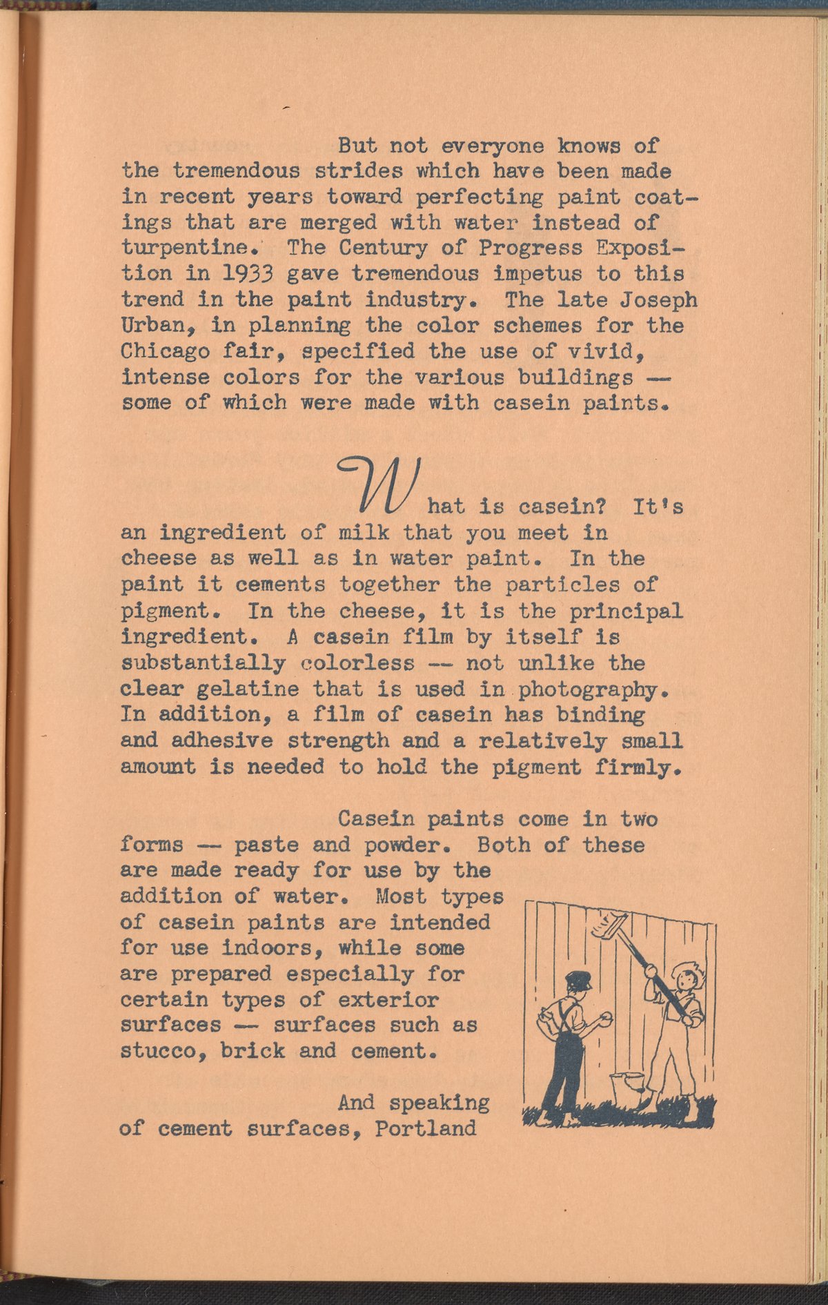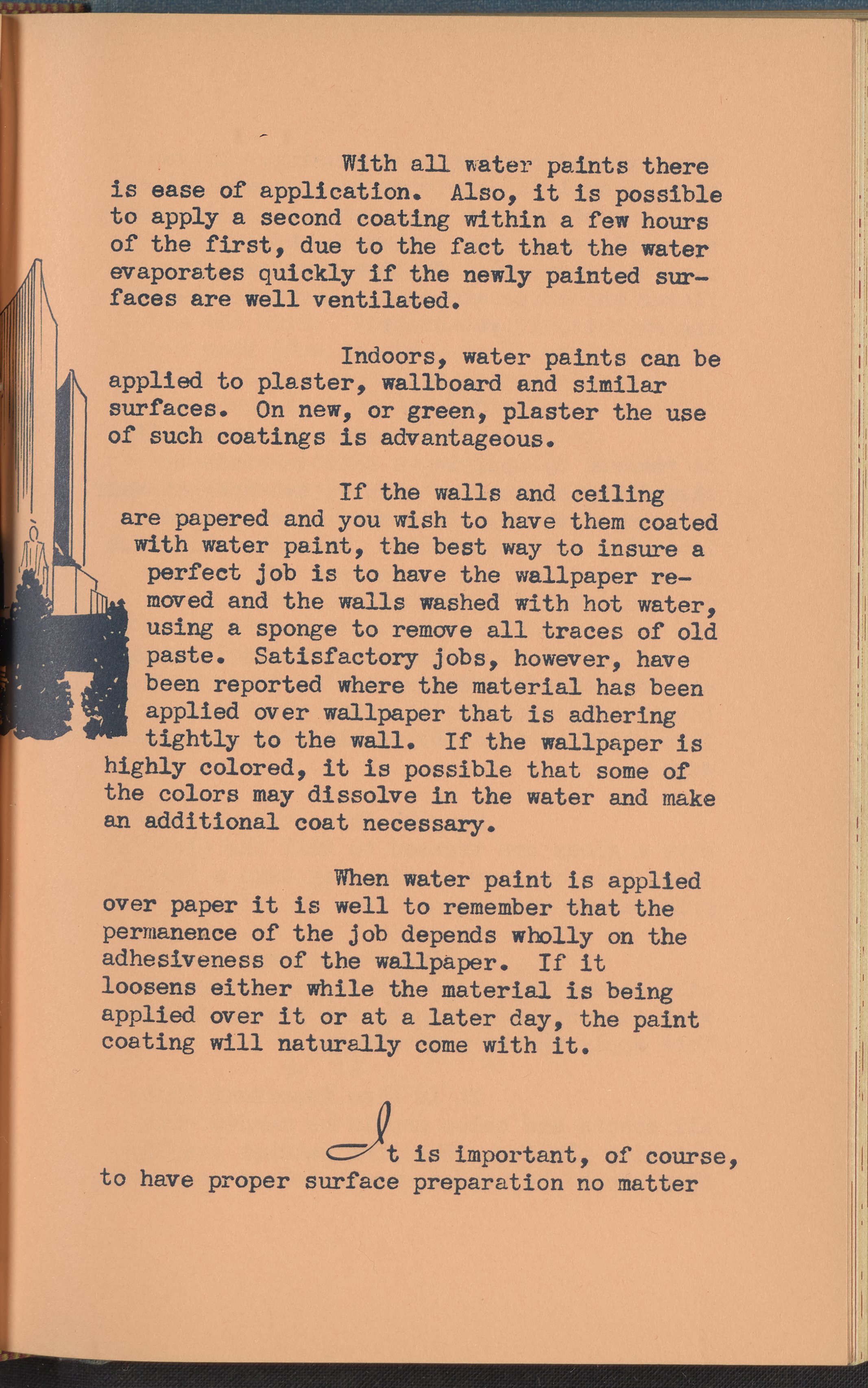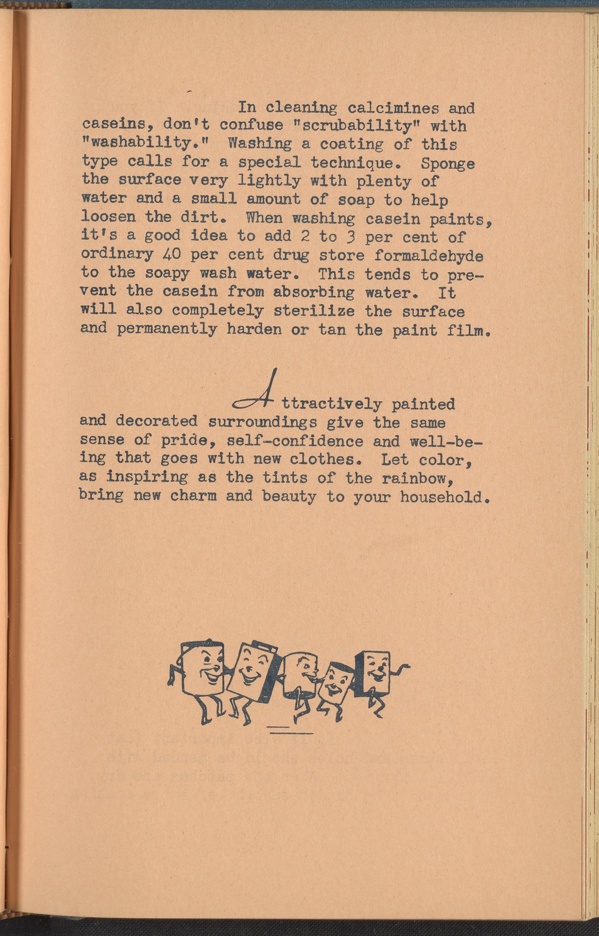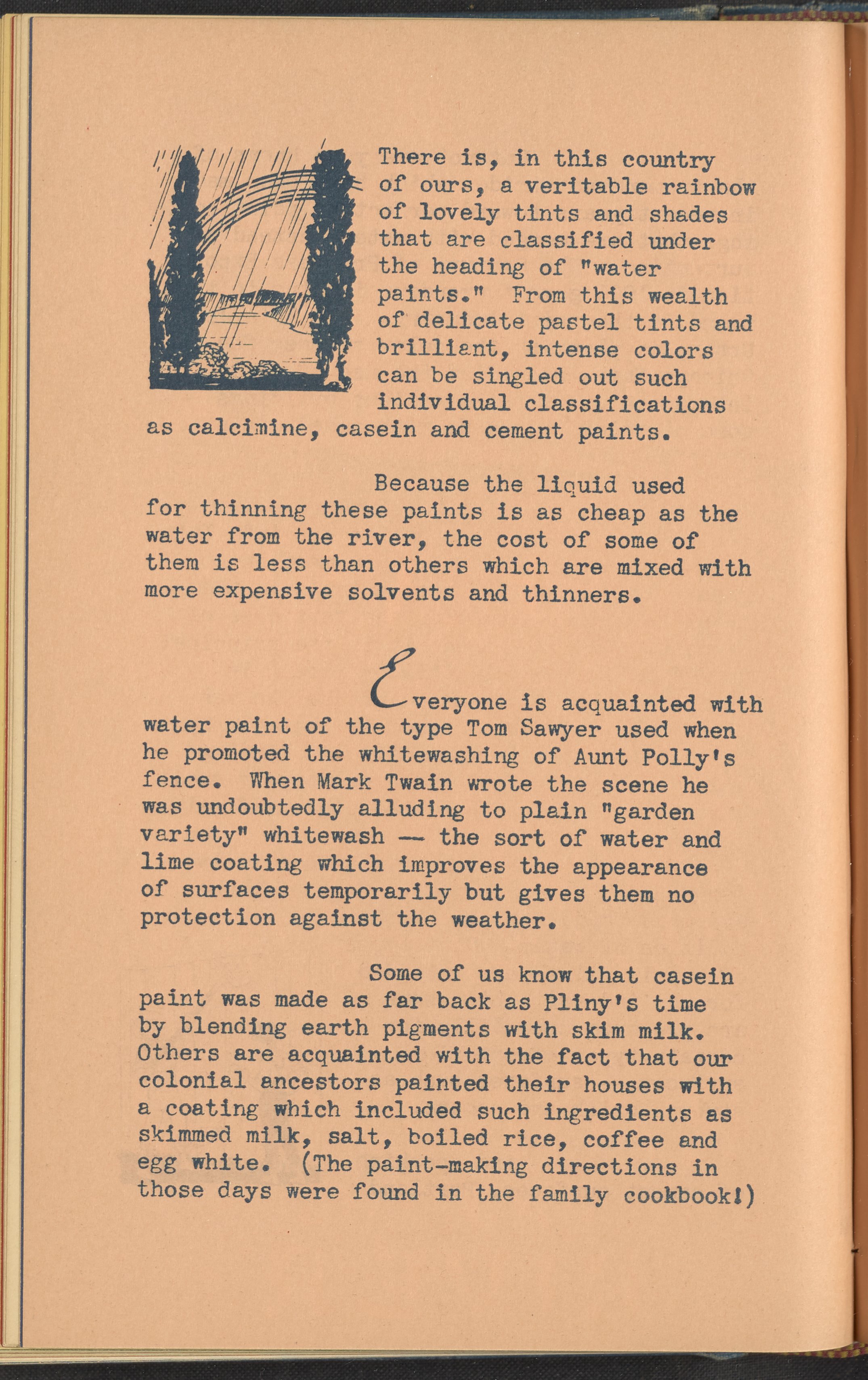 Booklet corresponding to a radio broadcast program created by the National Paint, Varnish, and Lacquer Association. The booklet discusses "water paints" or calcimine, casein, and cement paints. Describes the history, uses, and tips for the application of these water paint varieties. Includes small stylized illustrations throughout and decorated covers.