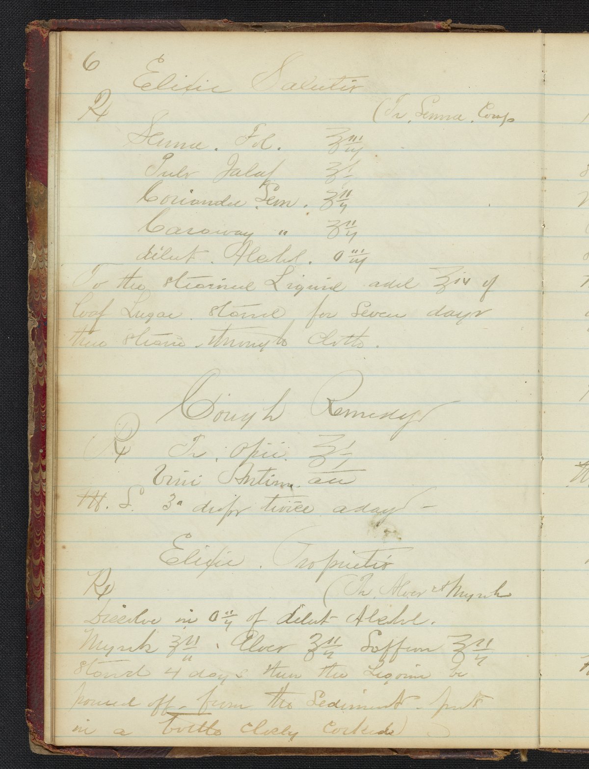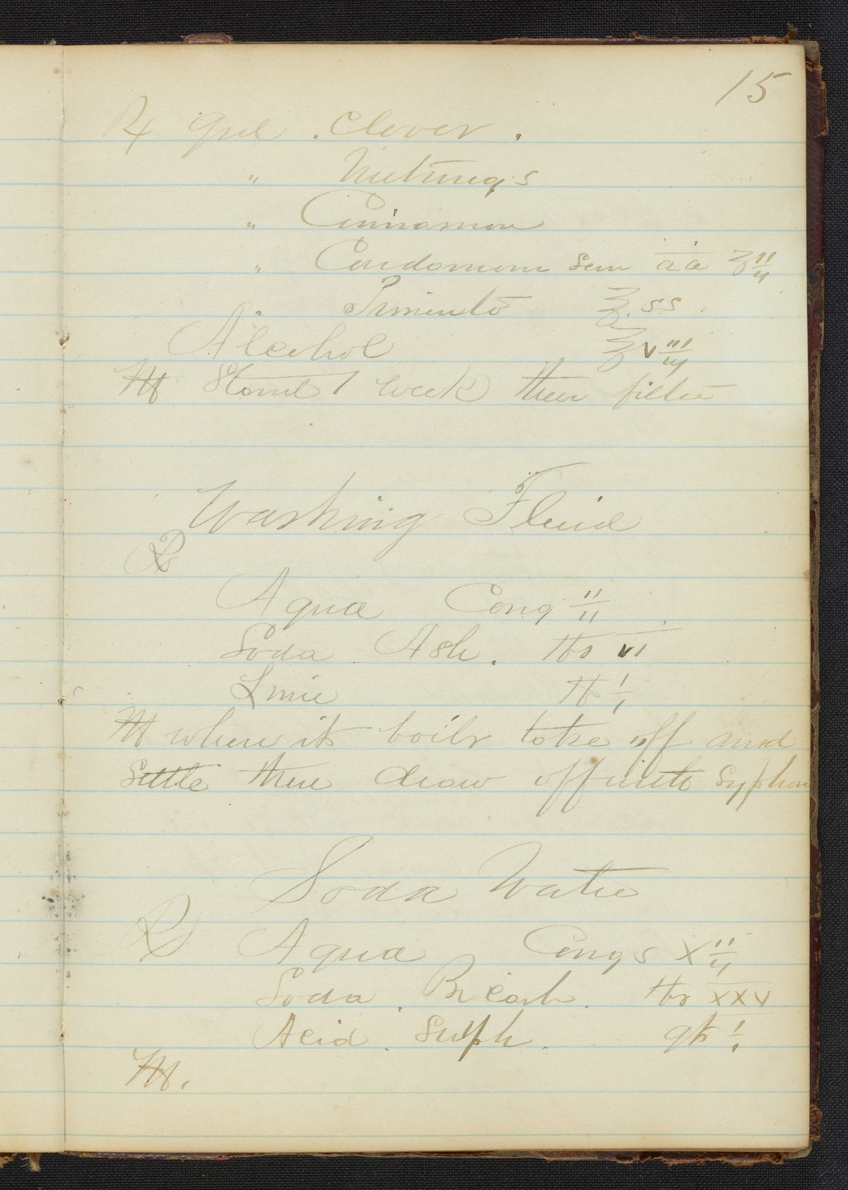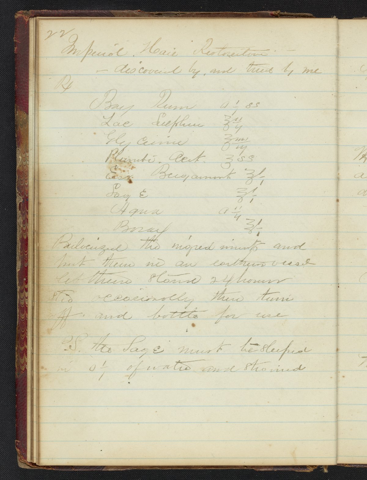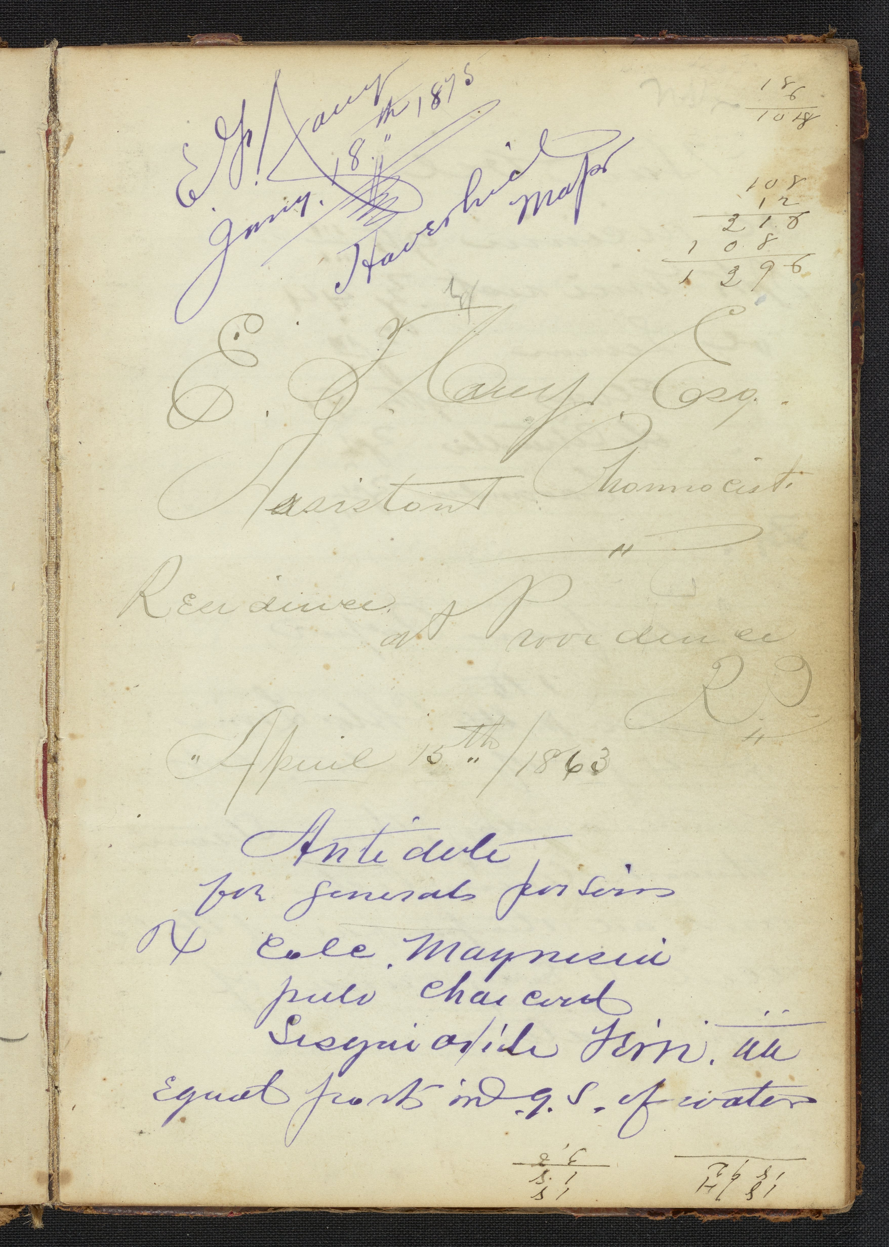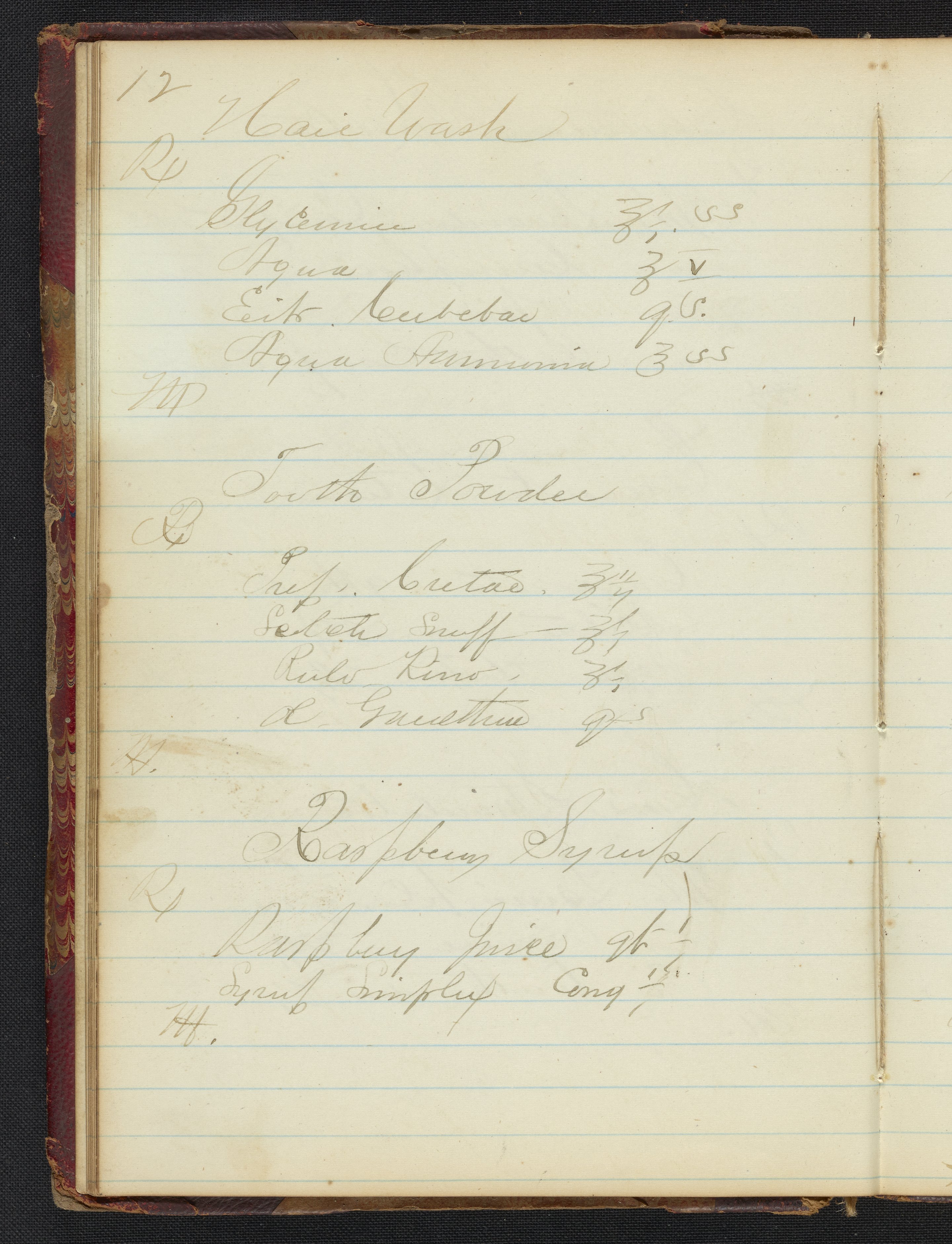 Small JPG1200 x 1633px — 472 KBLarge JPG2880 x 3920px — 2.5 MBFull-sized JPG3588 x 4884px — 3.6 MBOriginal fileTIFF — 3588 x 4884px — 50.2 MBThis notebook contains recipes and formulas developed or copied by E. F. Carey while working as an assistant pharmacist in Rhode Island and as the owner operator of a pharmacy in Massachusetts between 1863 and 1875. Includes recipes for hair wash and dye, cough syrup, writing ink, coloring billiard balls, rheumatism relief, and more.