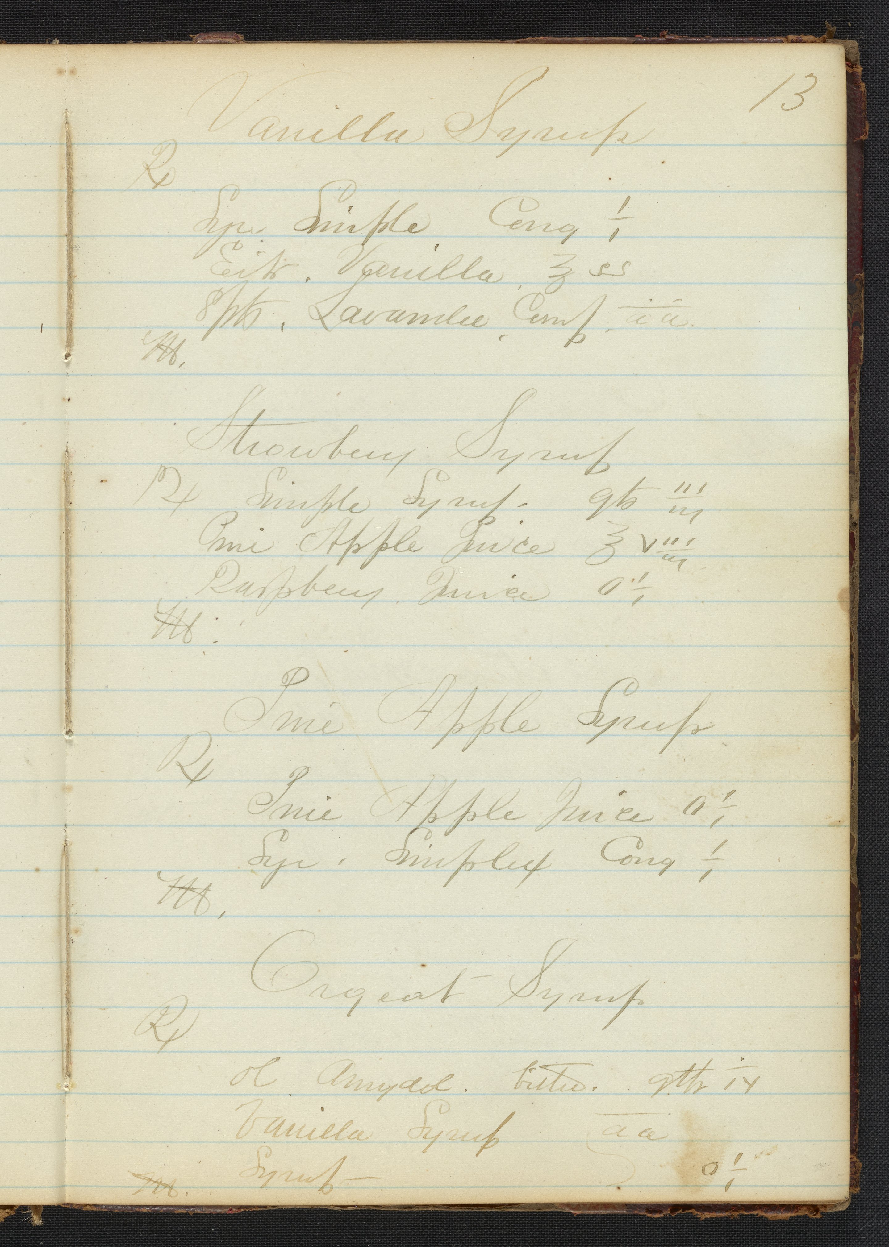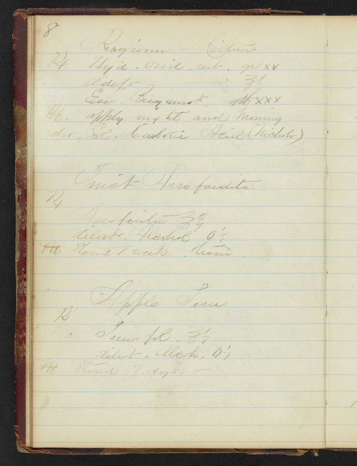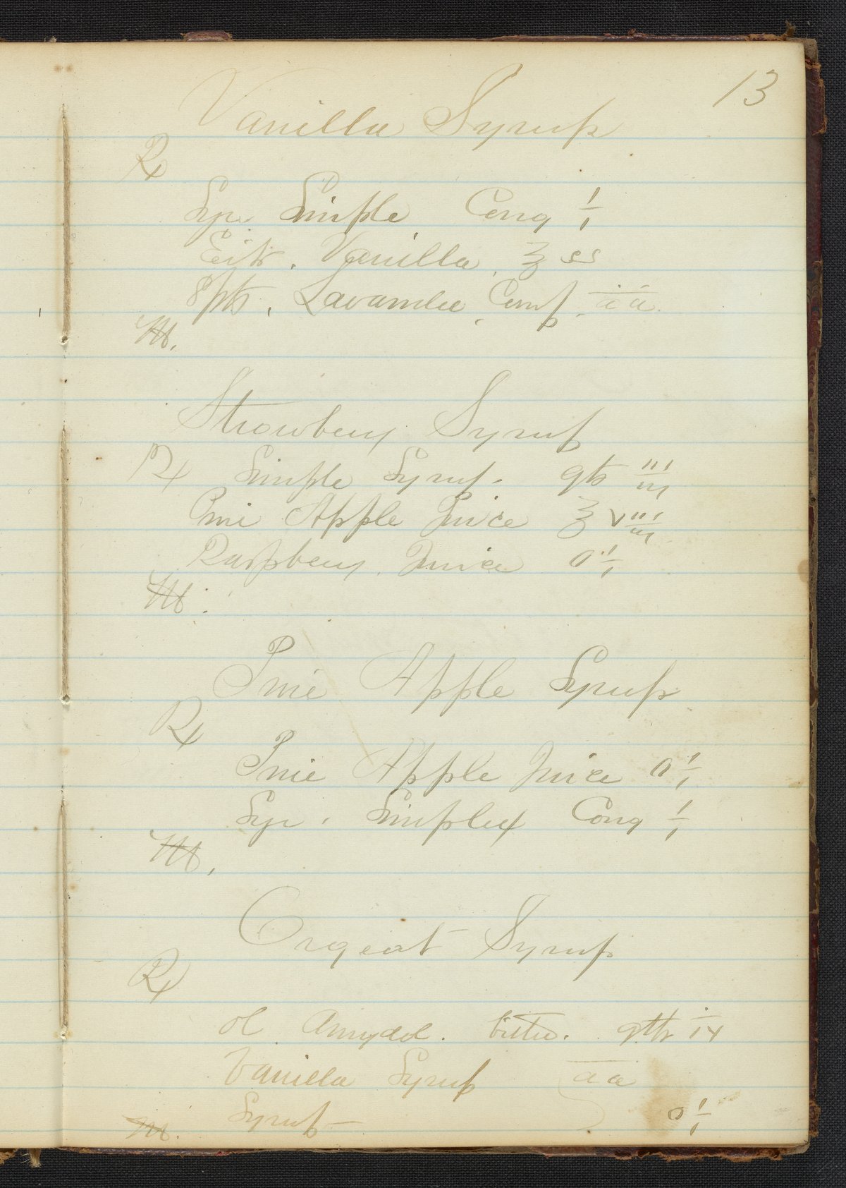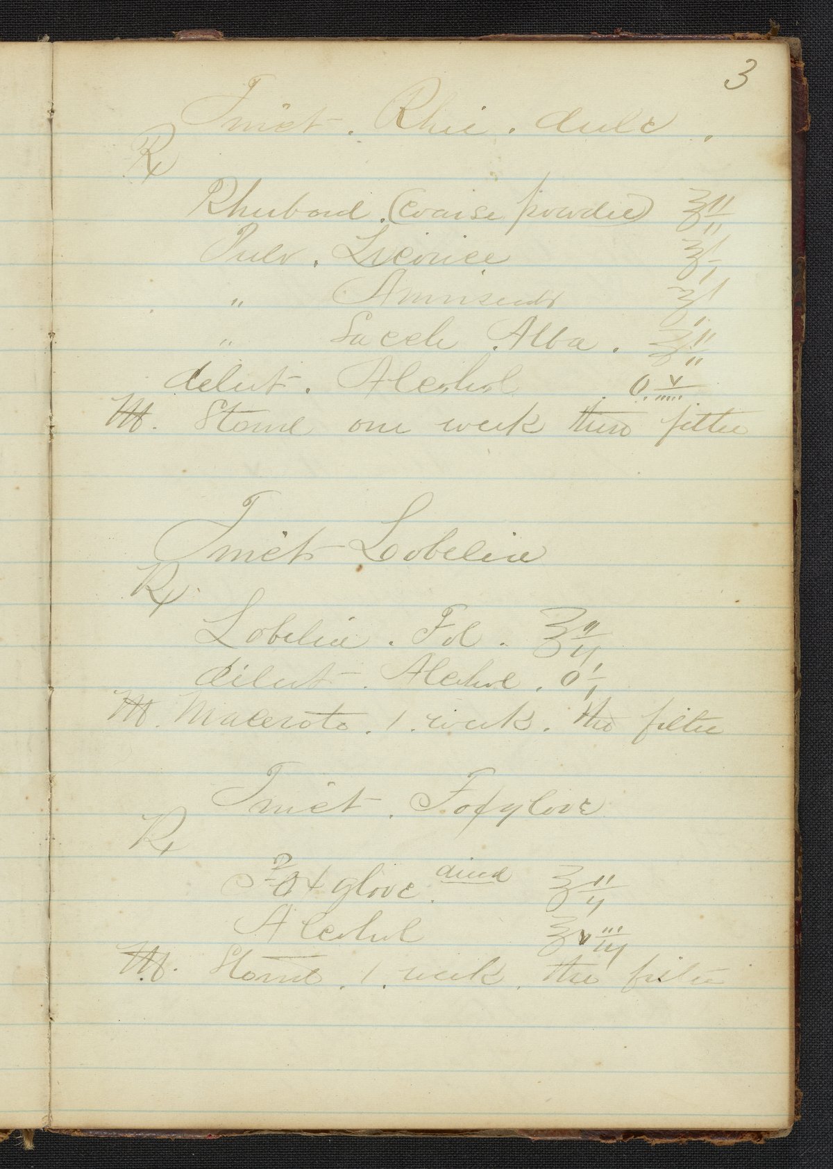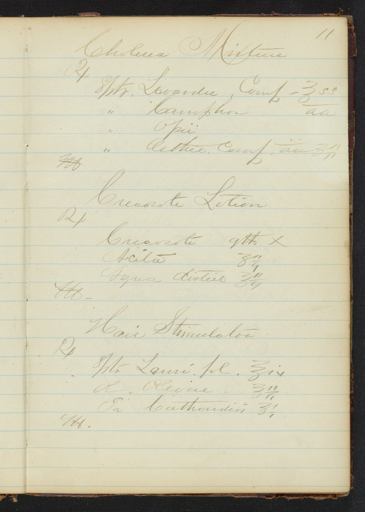 Small JPG1200 x 1633px — 472 KBLarge JPG2880 x 3920px — 2.5 MBFull-sized JPG3588 x 4884px — 3.6 MBOriginal fileTIFF — 3588 x 4884px — 50.2 MBThis notebook contains recipes and formulas developed or copied by E. F. Carey while working as an assistant pharmacist in Rhode Island and as the owner operator of a pharmacy in Massachusetts between 1863 and 1875. Includes recipes for hair wash and dye, cough syrup, writing ink, coloring billiard balls, rheumatism relief, and more.