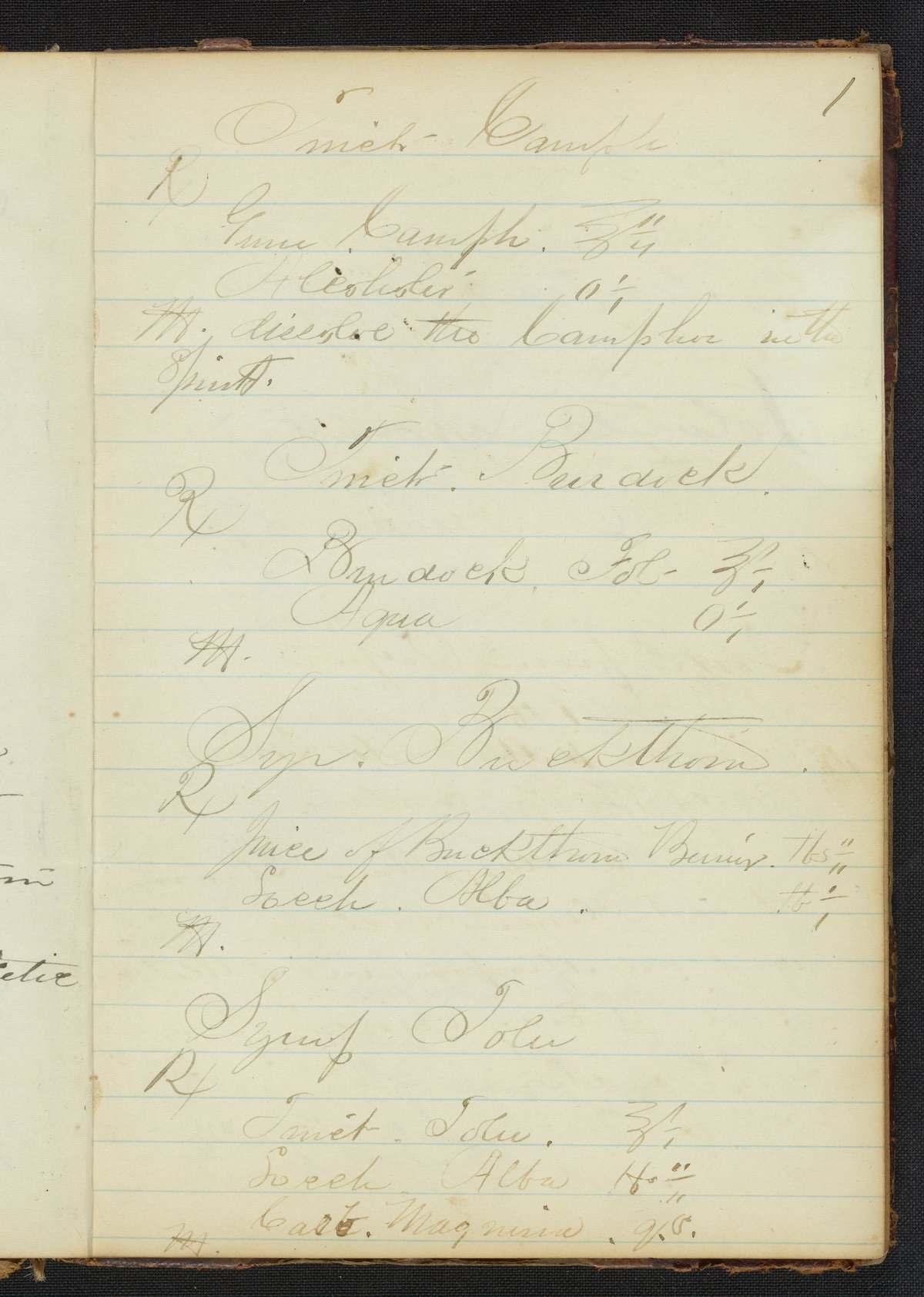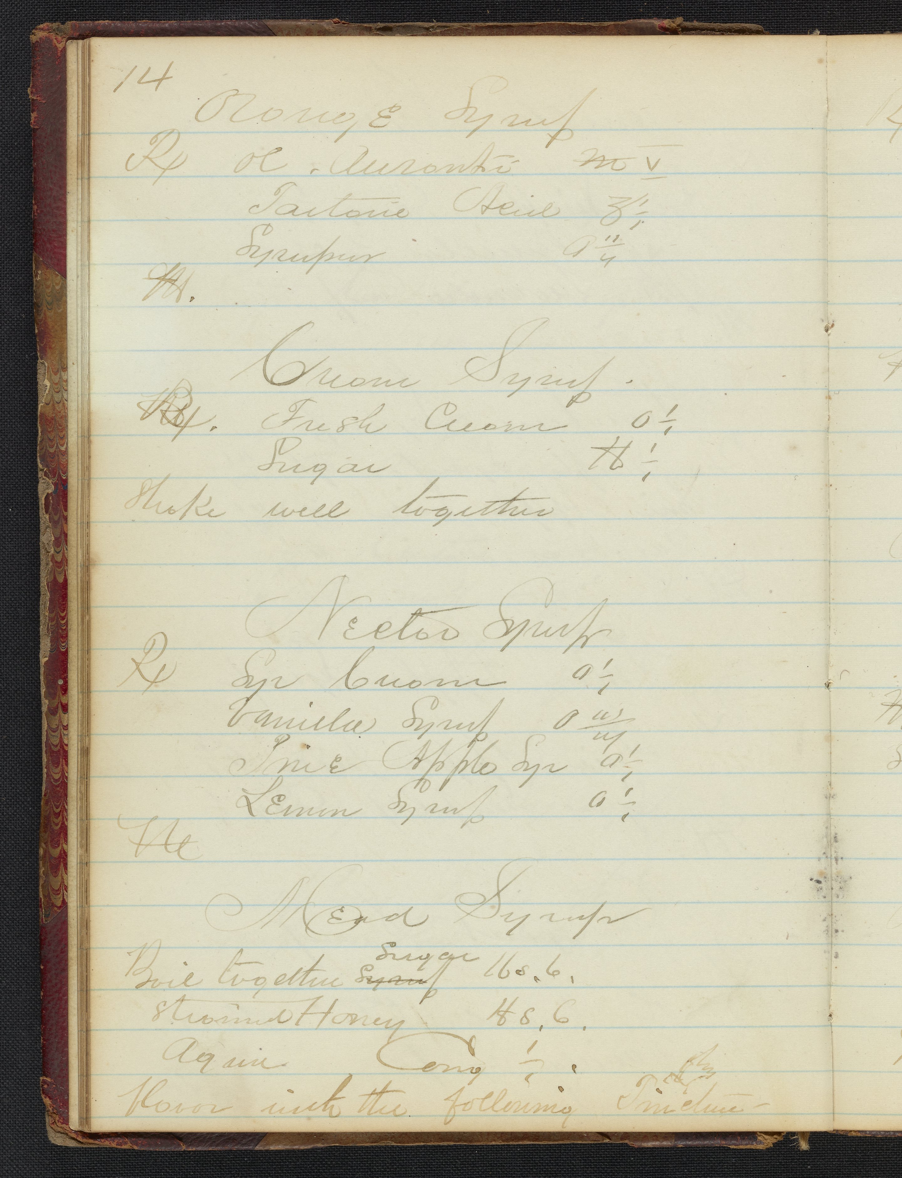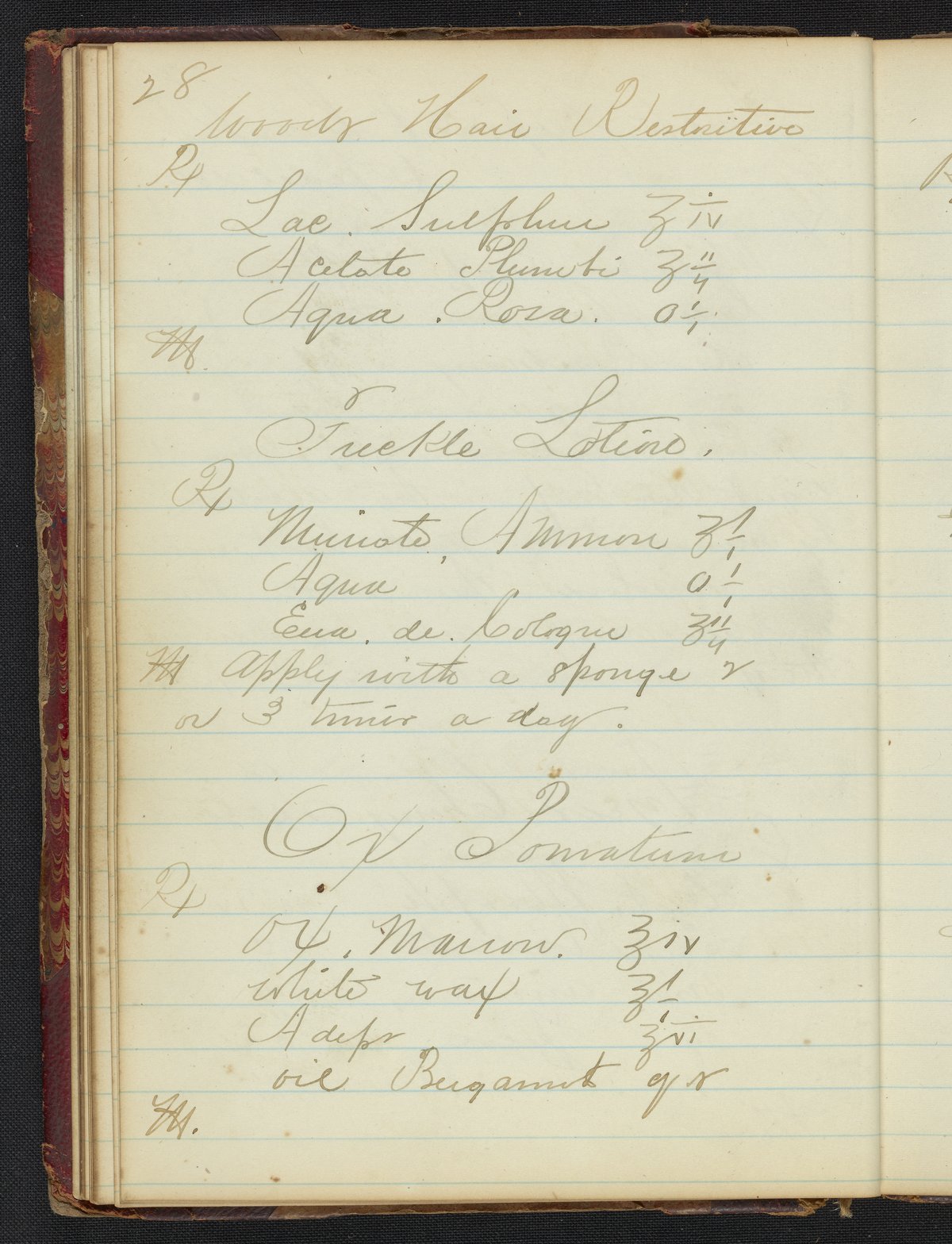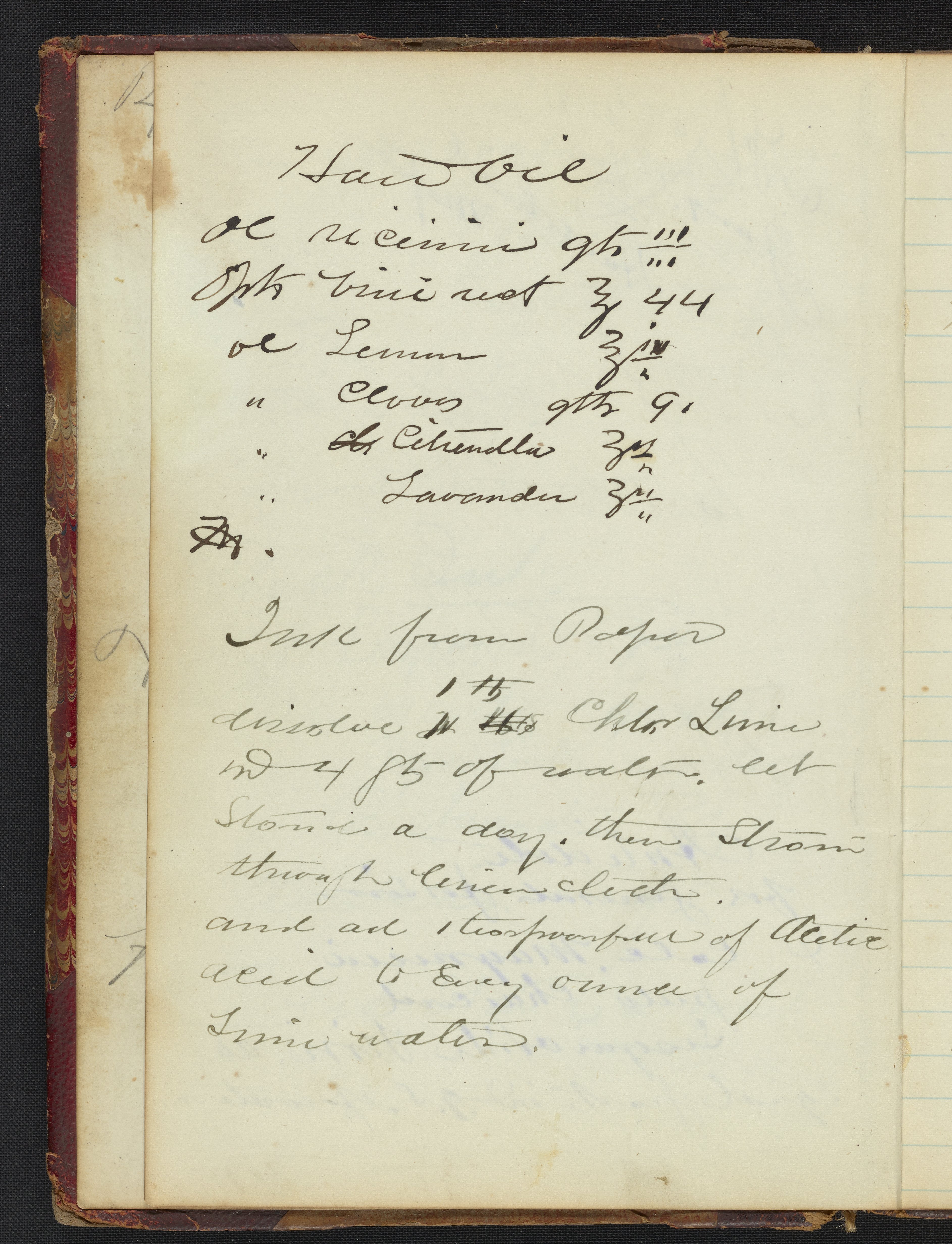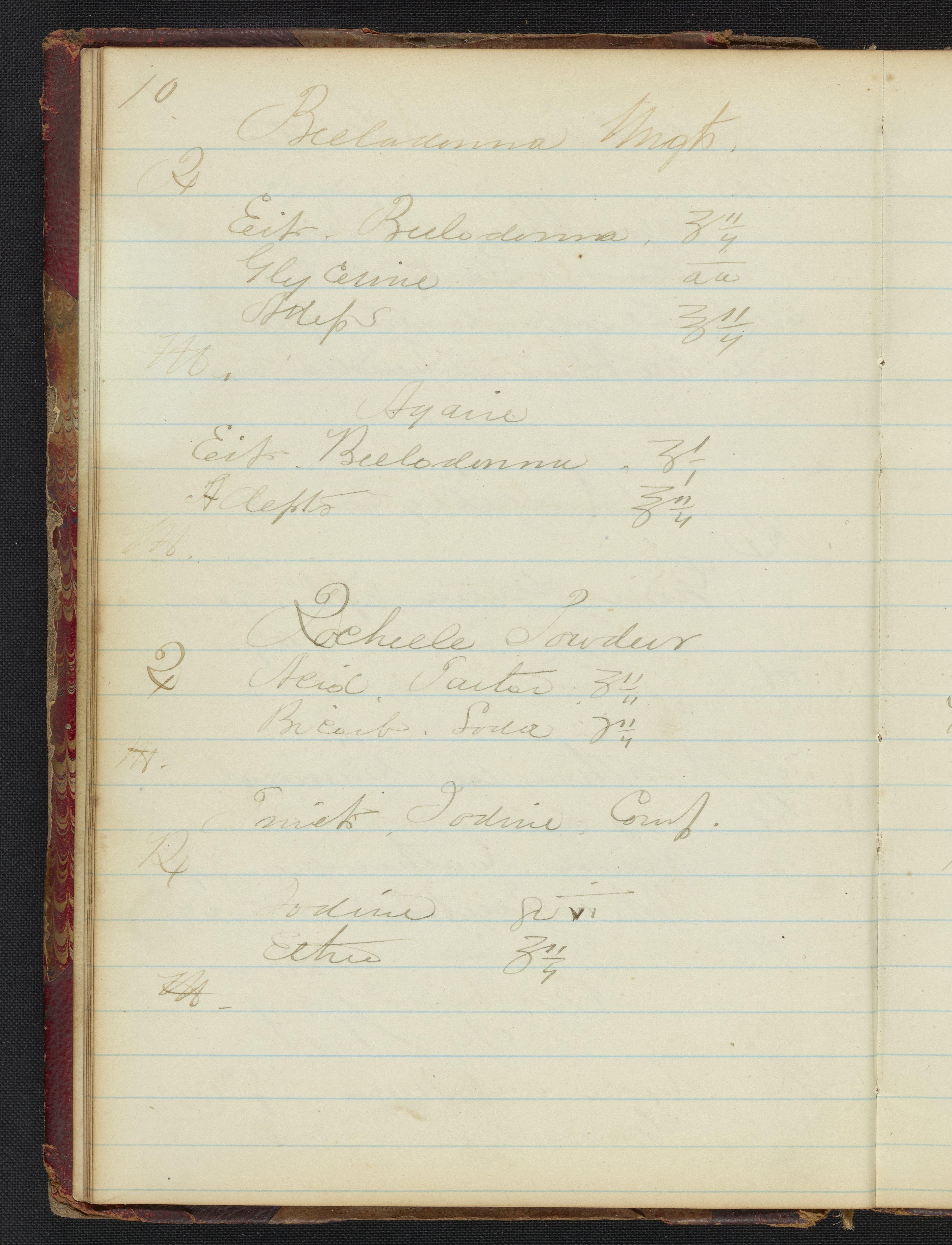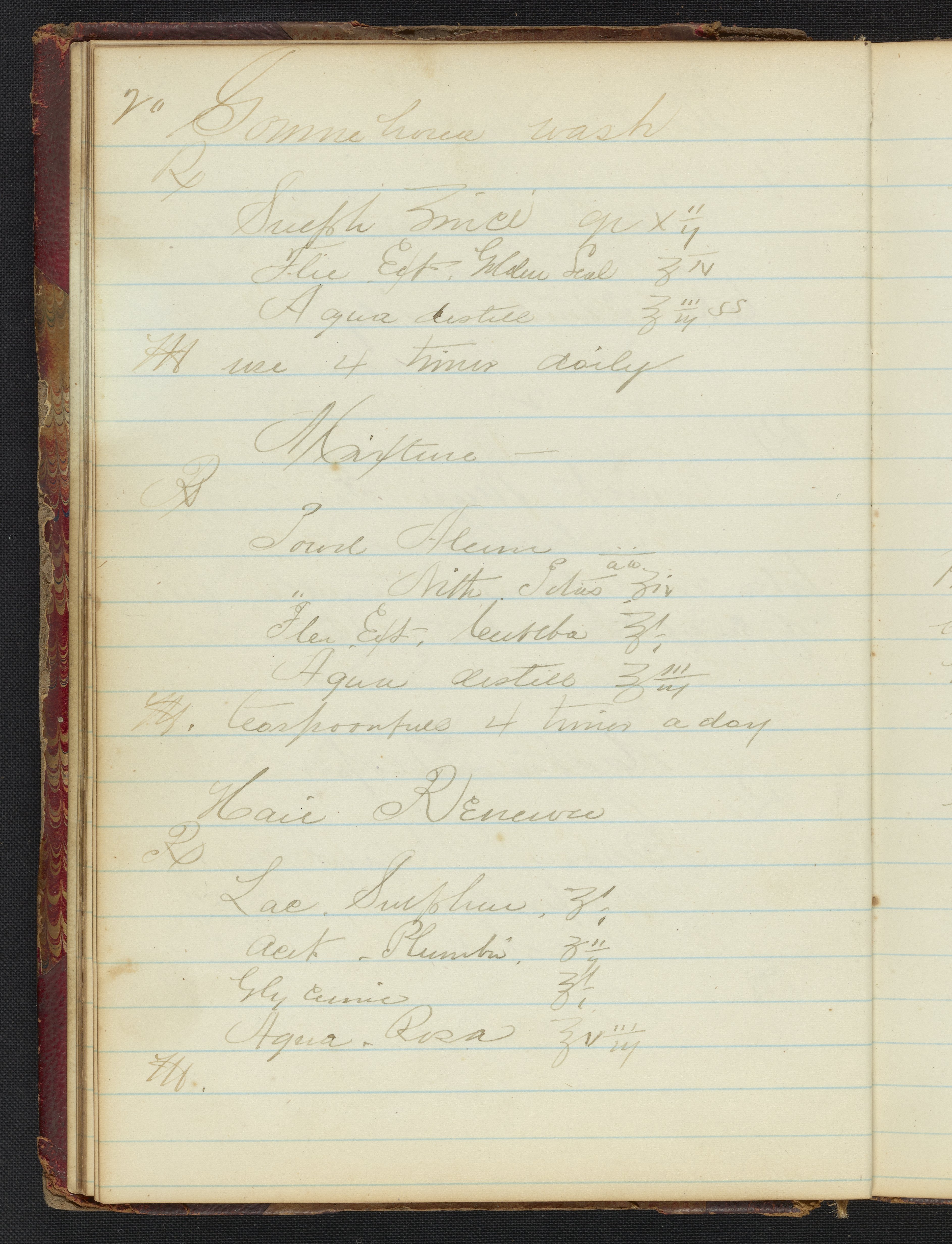 Small JPG1200 x 1633px — 472 KBLarge JPG2880 x 3920px — 2.5 MBFull-sized JPG3588 x 4884px — 3.6 MBOriginal fileTIFF — 3588 x 4884px — 50.2 MBThis notebook contains recipes and formulas developed or copied by E. F. Carey while working as an assistant pharmacist in Rhode Island and as the owner operator of a pharmacy in Massachusetts between 1863 and 1875. Includes recipes for hair wash and dye, cough syrup, writing ink, coloring billiard balls, rheumatism relief, and more.