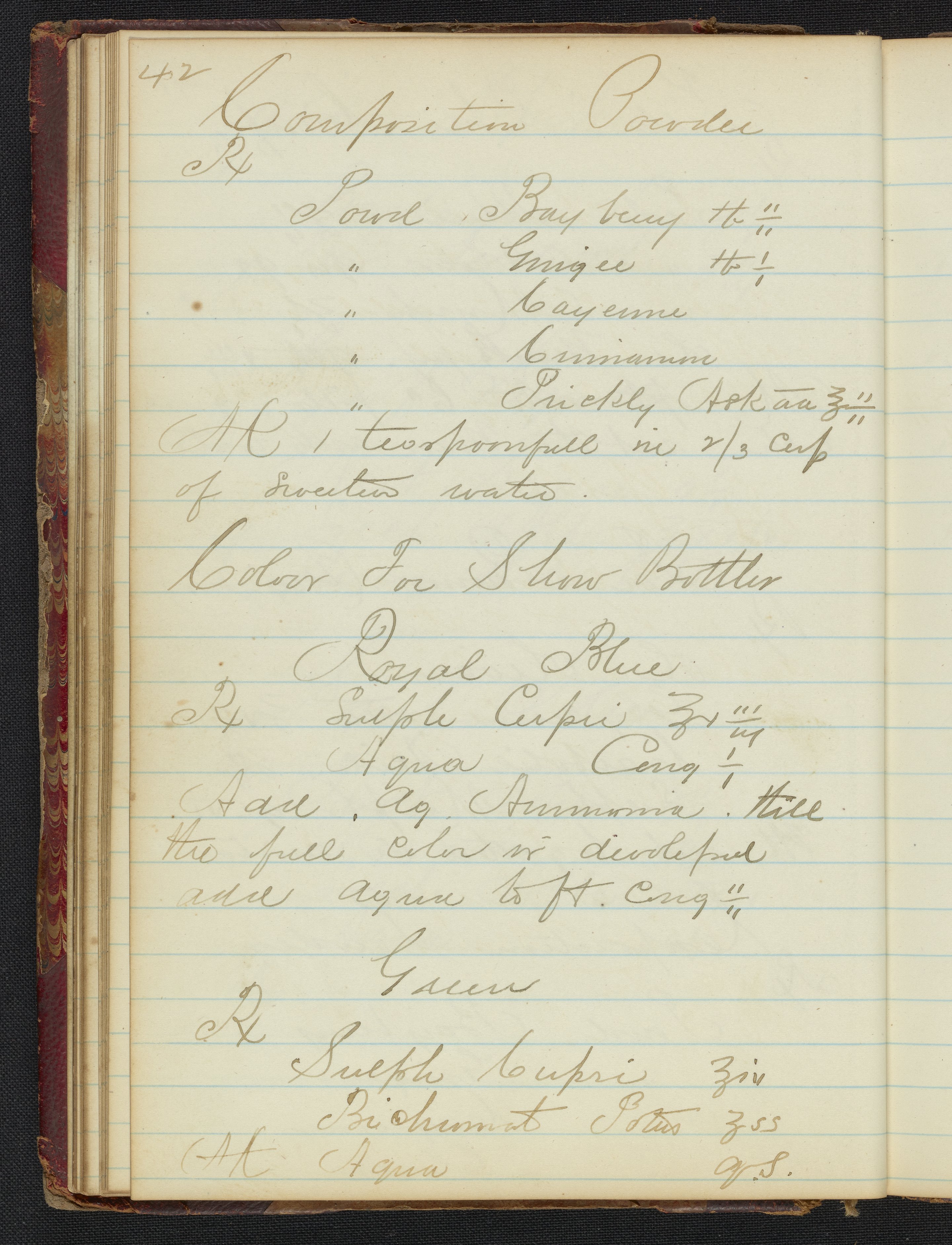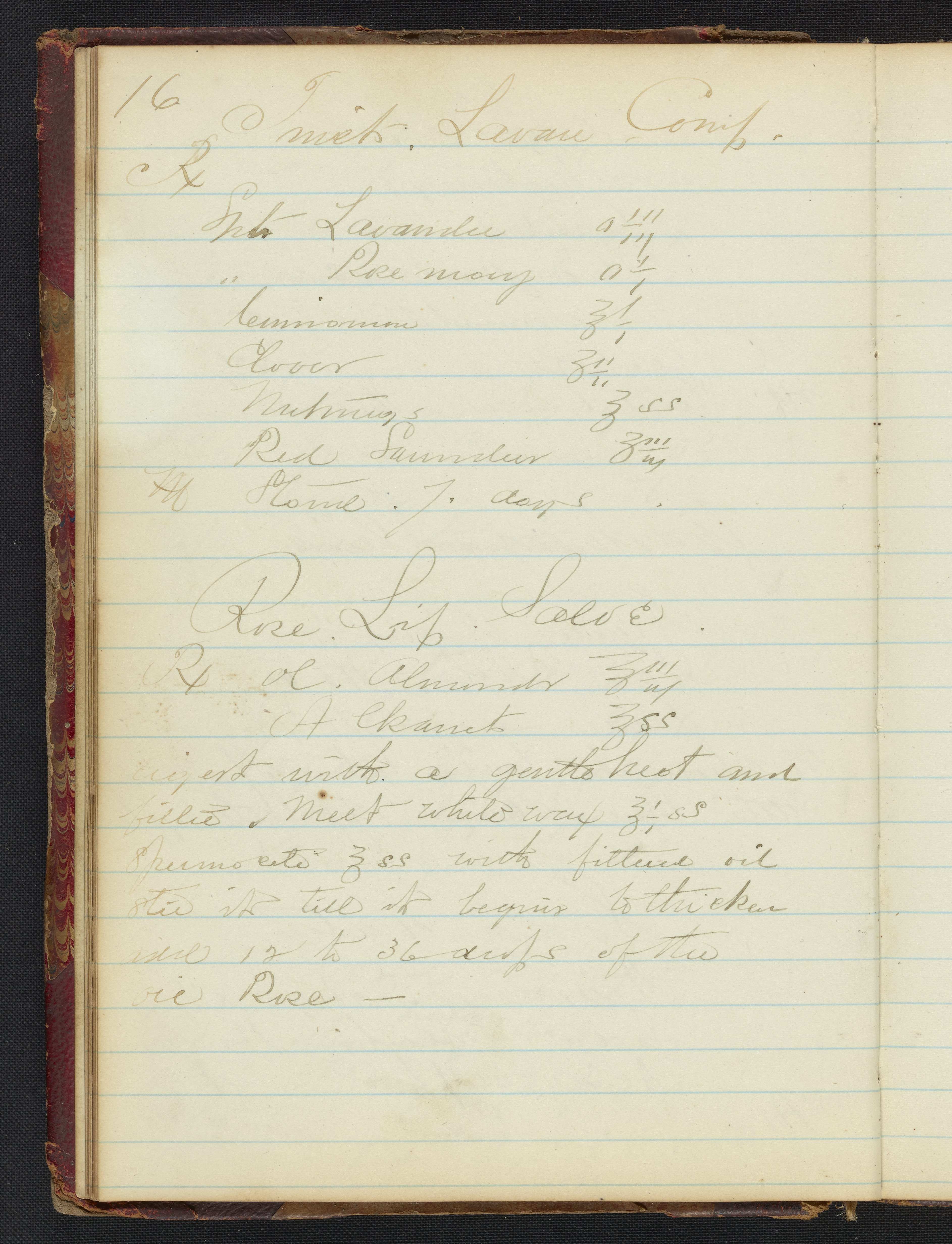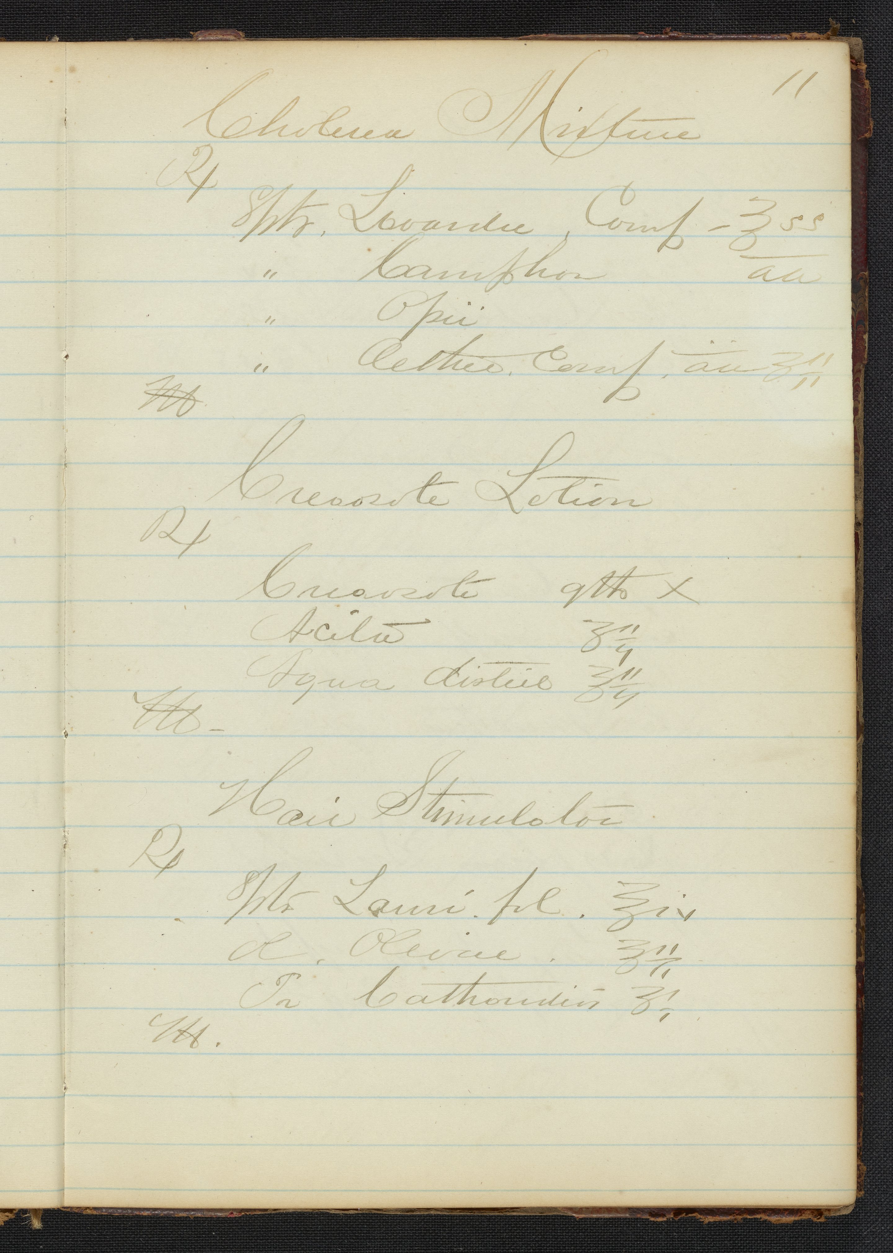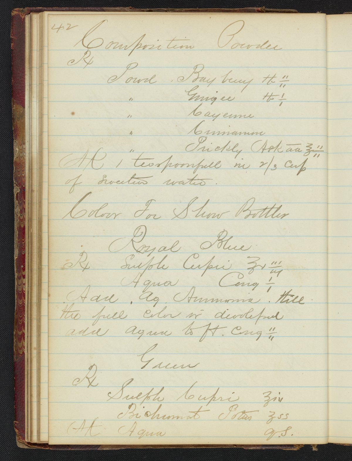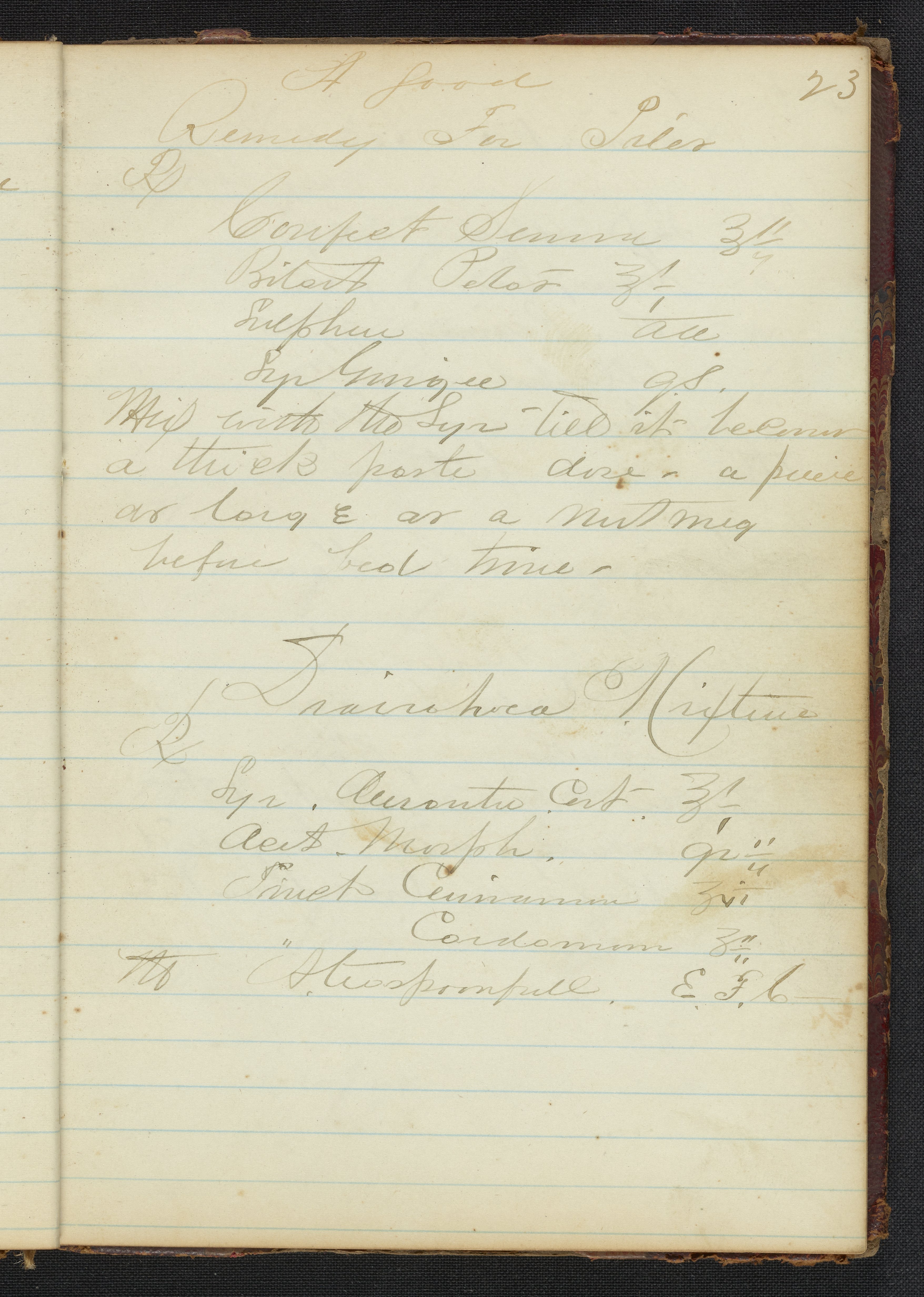 Small JPG1200 x 1633px — 472 KBLarge JPG2880 x 3920px — 2.5 MBFull-sized JPG3588 x 4884px — 3.6 MBOriginal fileTIFF — 3588 x 4884px — 50.2 MBThis notebook contains recipes and formulas developed or copied by E. F. Carey while working as an assistant pharmacist in Rhode Island and as the owner operator of a pharmacy in Massachusetts between 1863 and 1875. Includes recipes for hair wash and dye, cough syrup, writing ink, coloring billiard balls, rheumatism relief, and more.