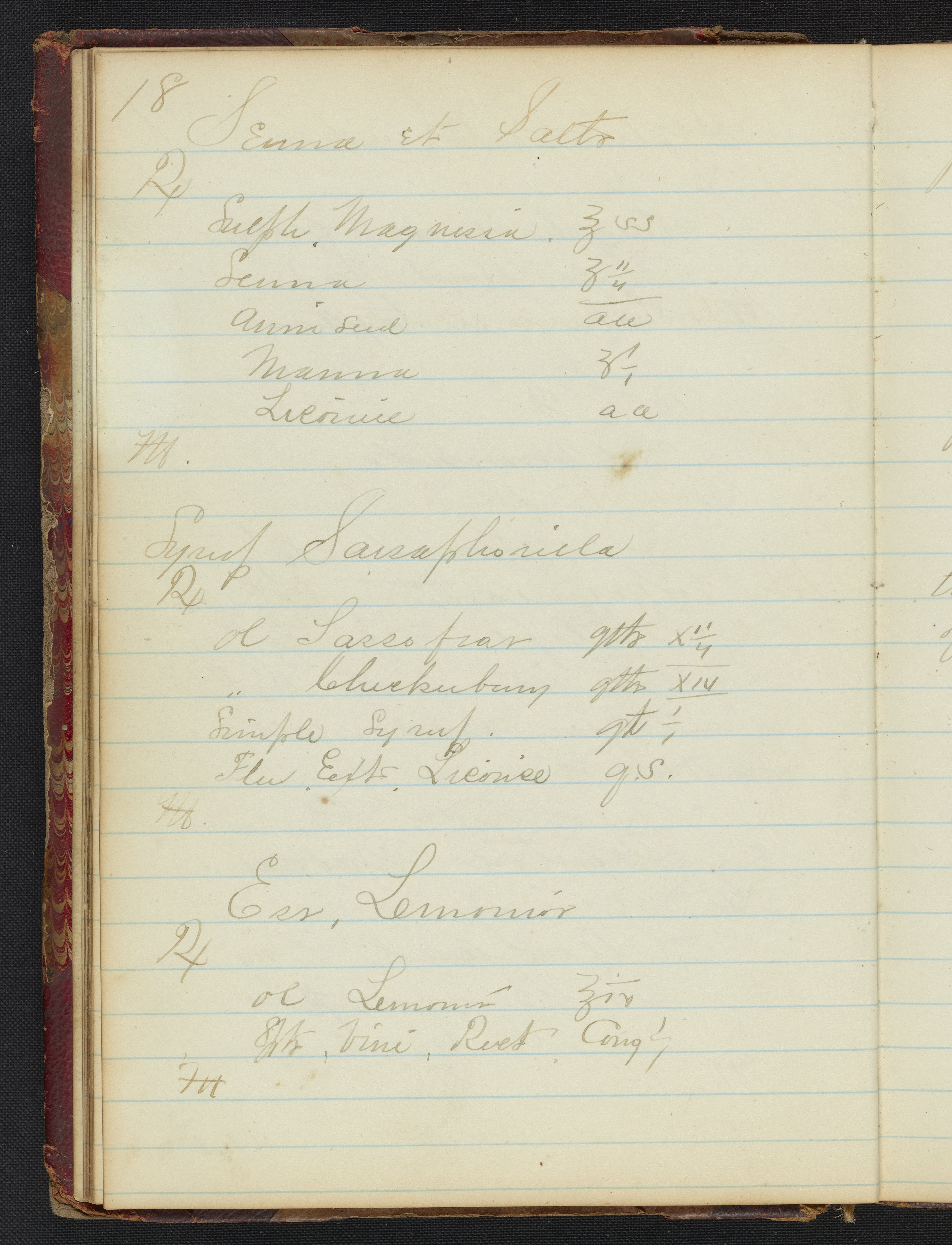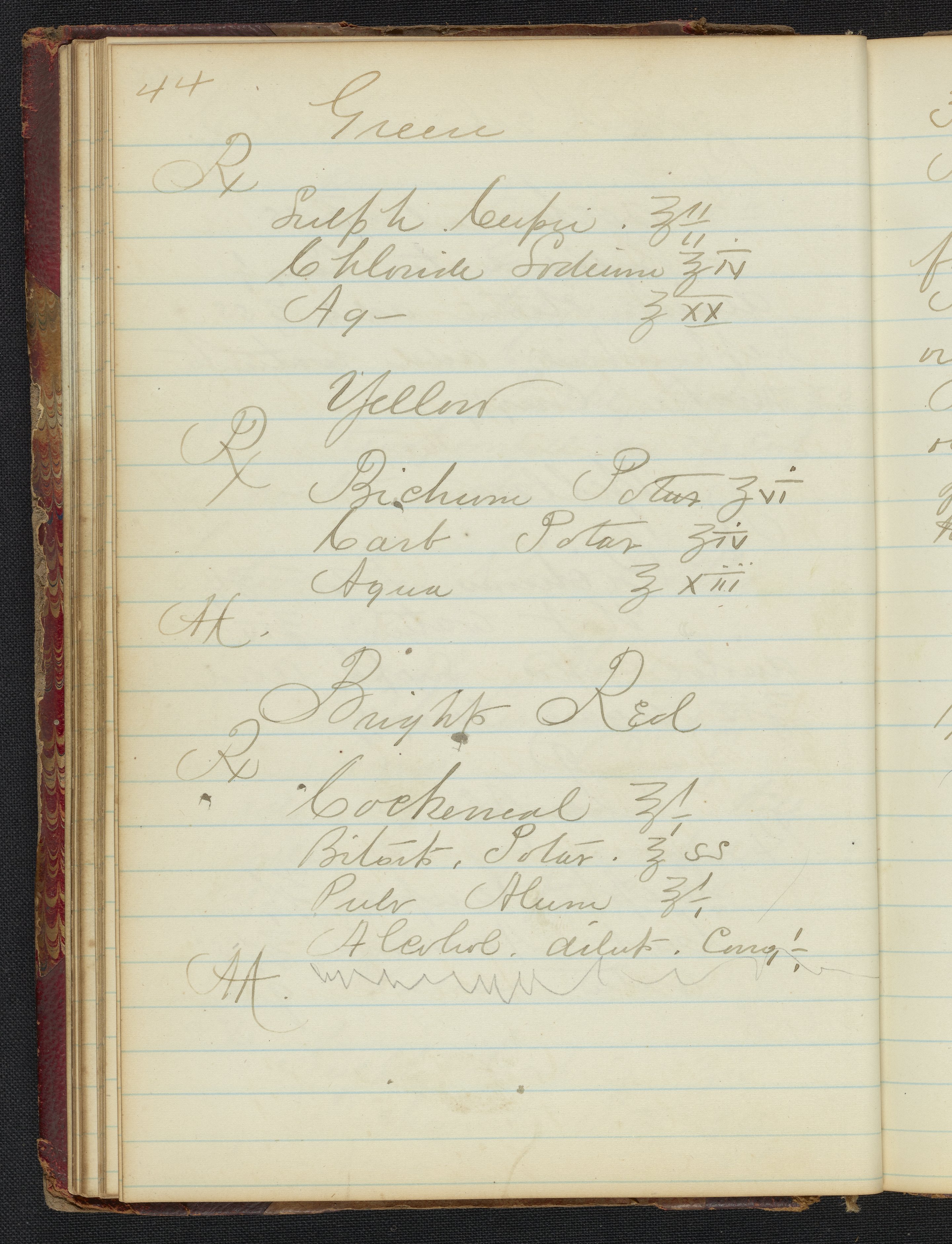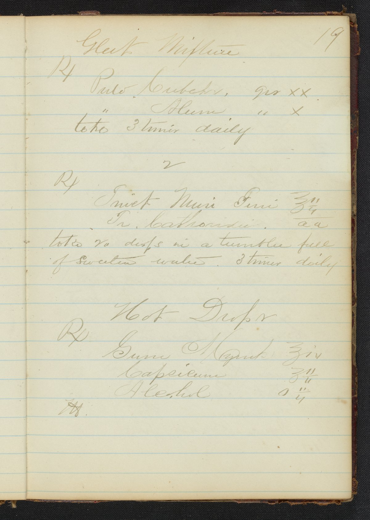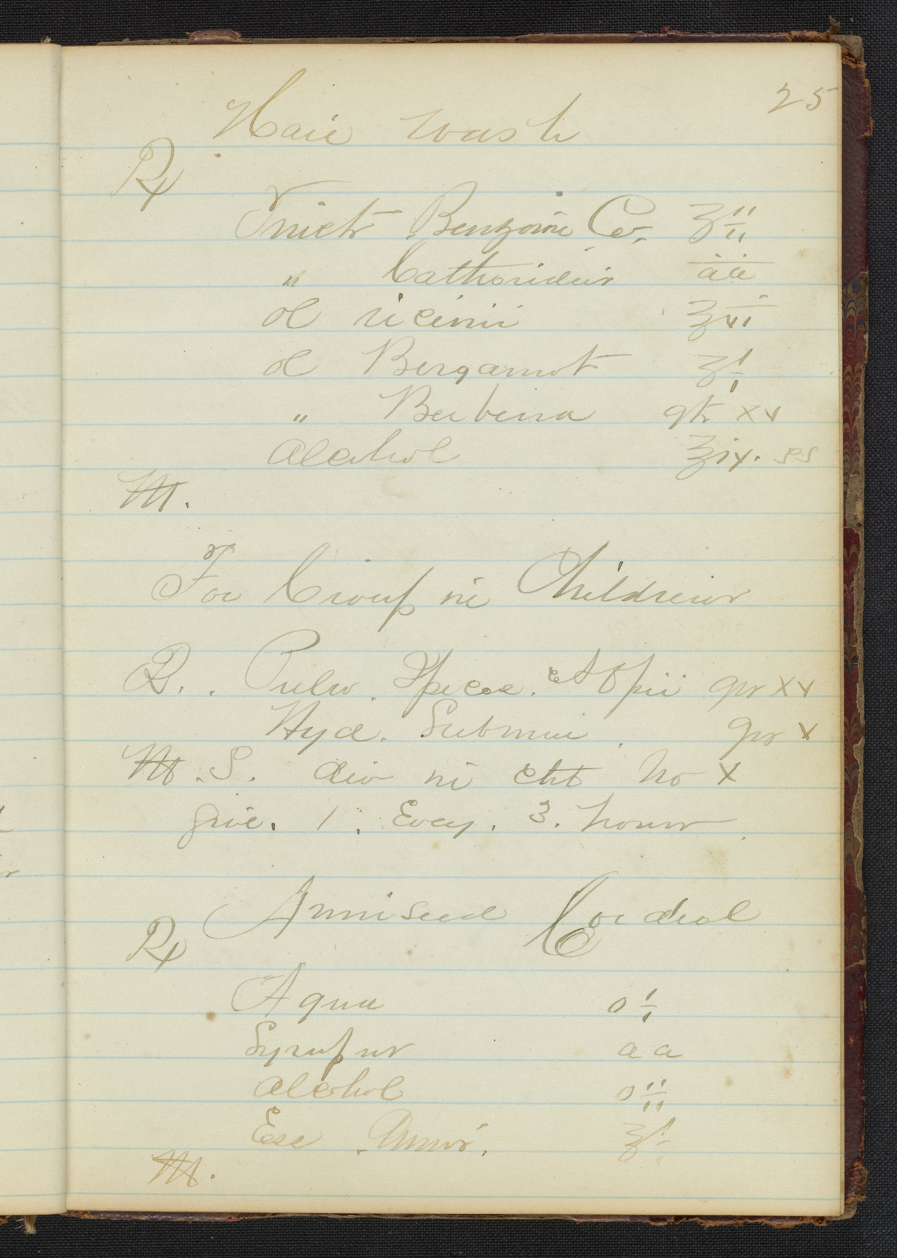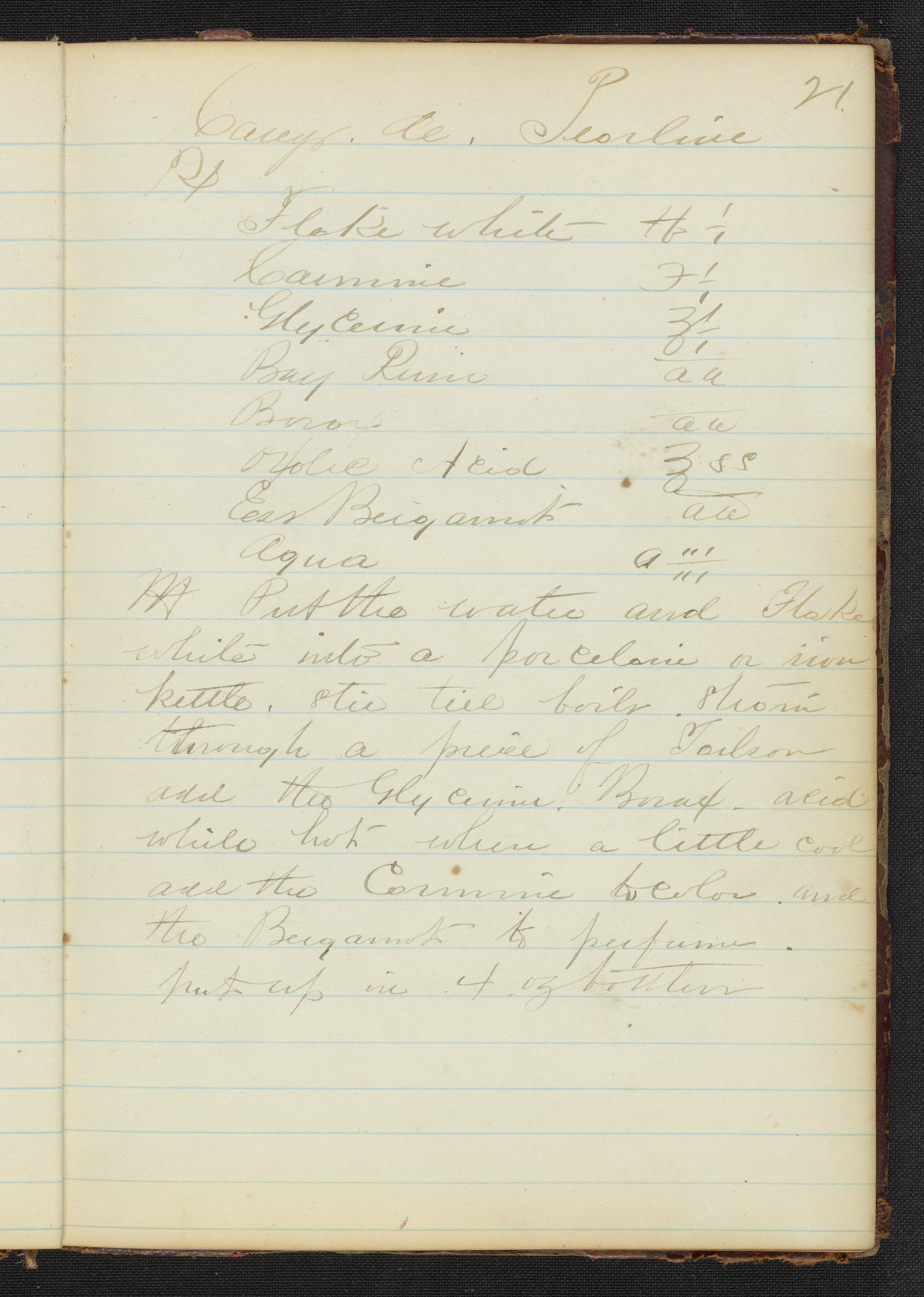Small JPG1200 x 1633px — 472 KBLarge JPG2880 x 3920px — 2.5 MBFull-sized JPG3588 x 4884px — 3.6 MBOriginal fileTIFF — 3588 x 4884px — 50.2 MBThis notebook contains recipes and formulas developed or copied by E. F. Carey while working as an assistant pharmacist in Rhode Island and as the owner operator of a pharmacy in Massachusetts between 1863 and 1875. Includes recipes for hair wash and dye, cough syrup, writing ink, coloring billiard balls, rheumatism relief, and more.