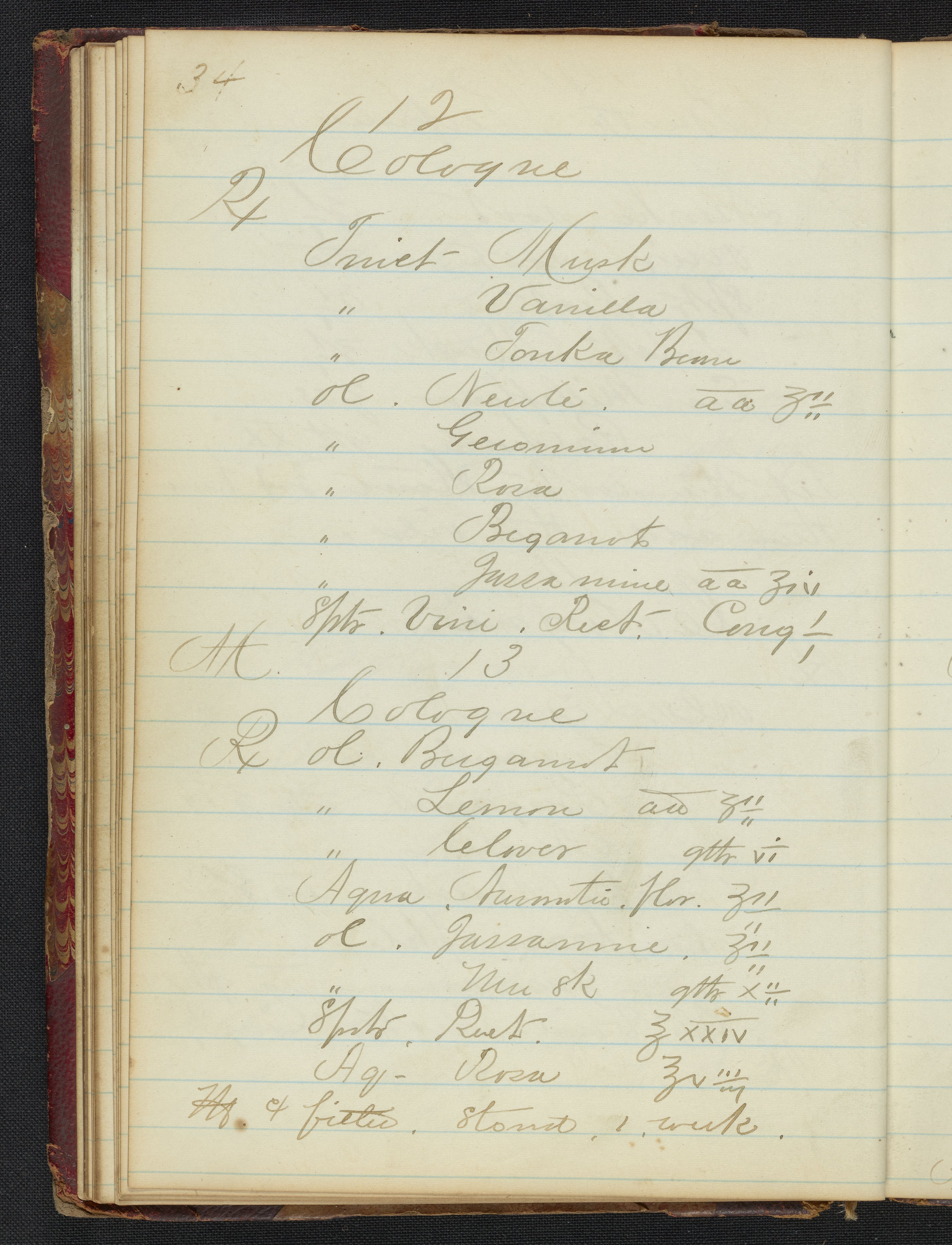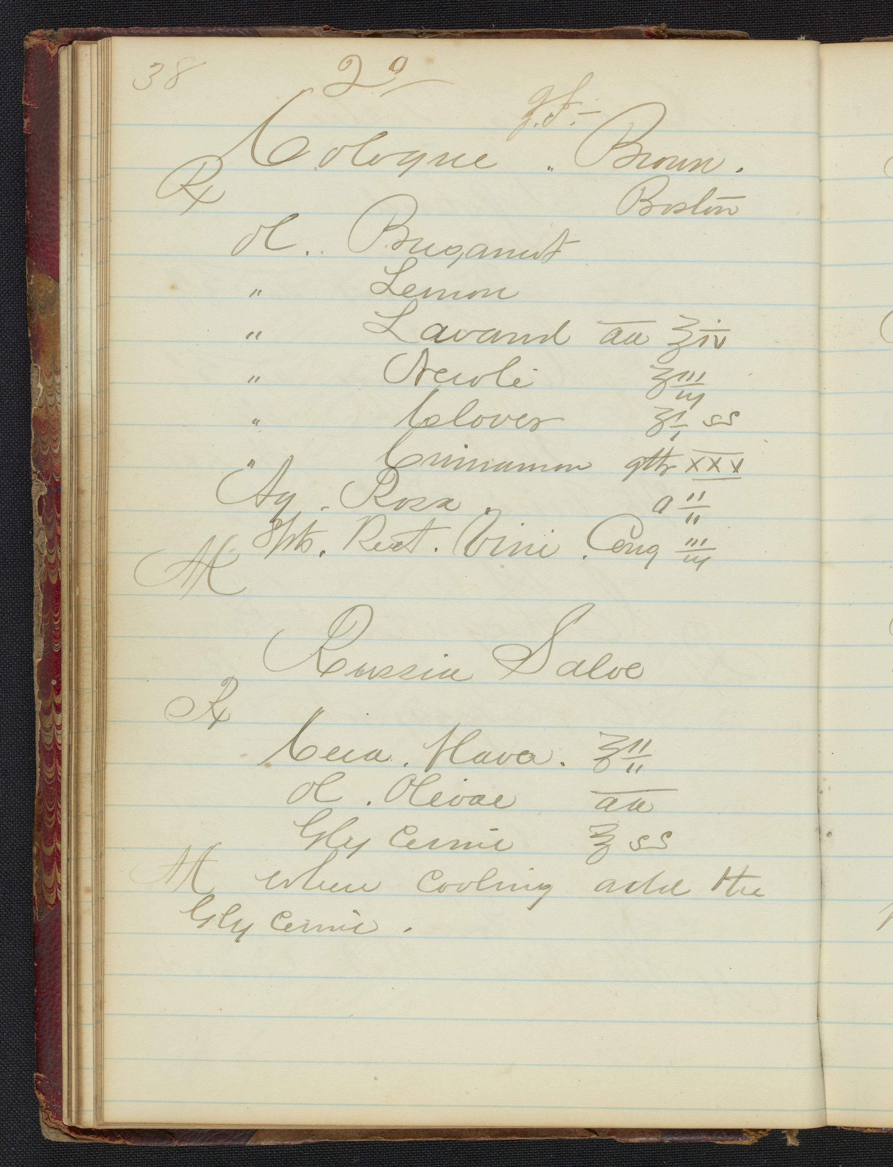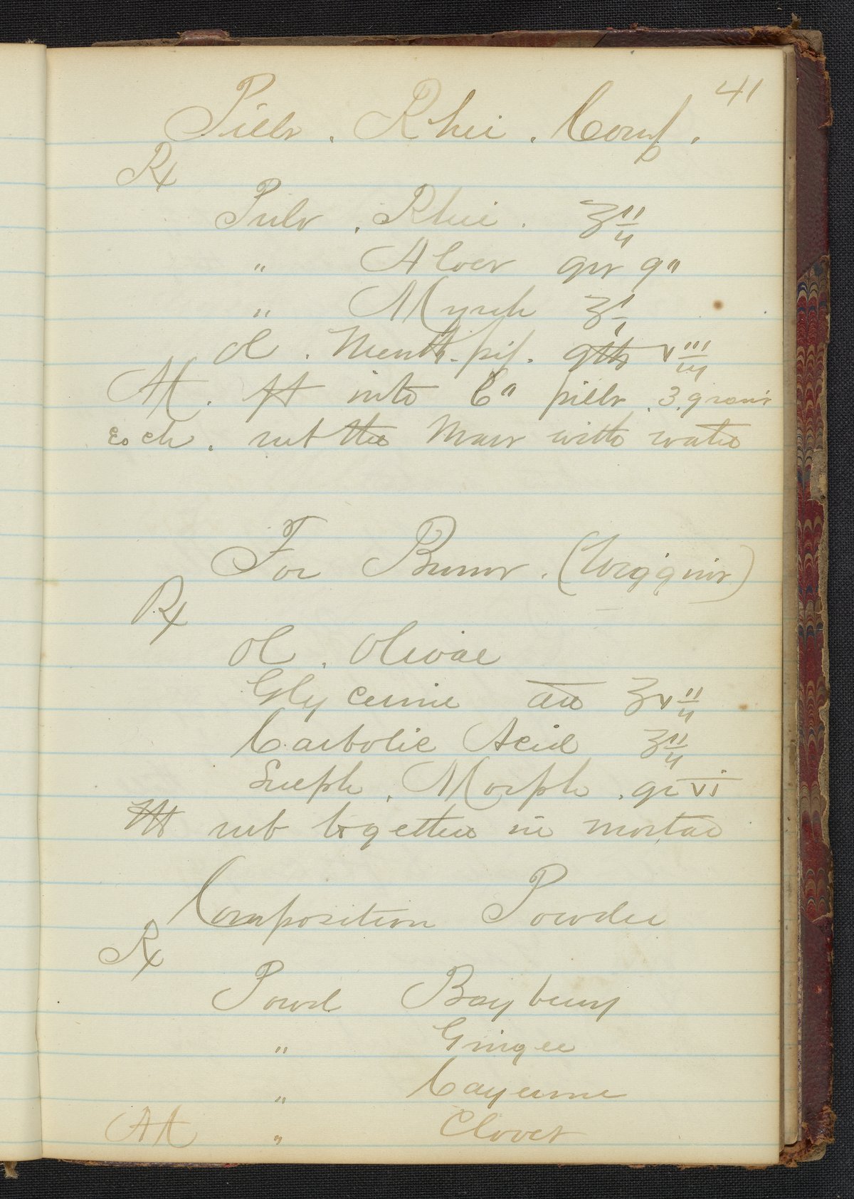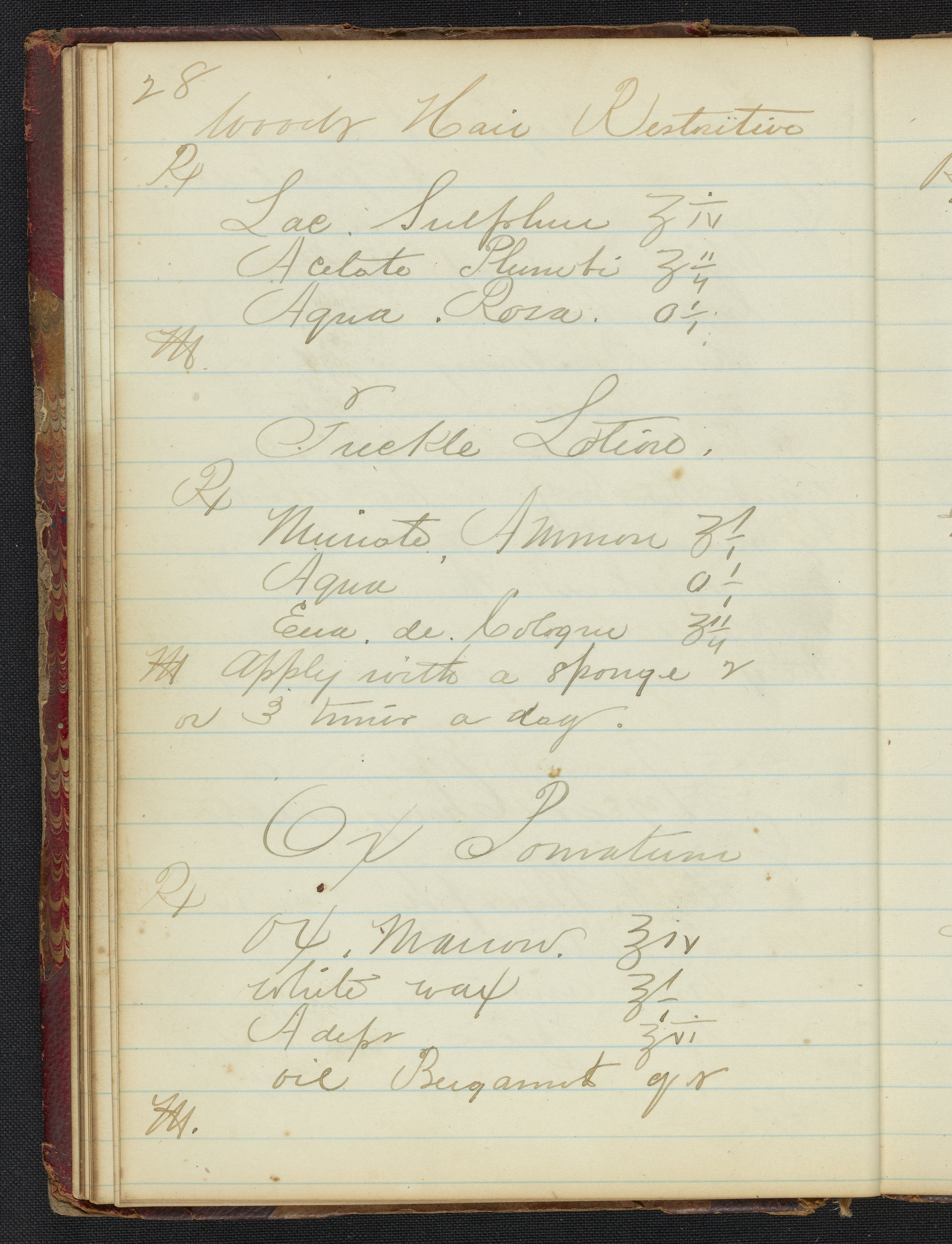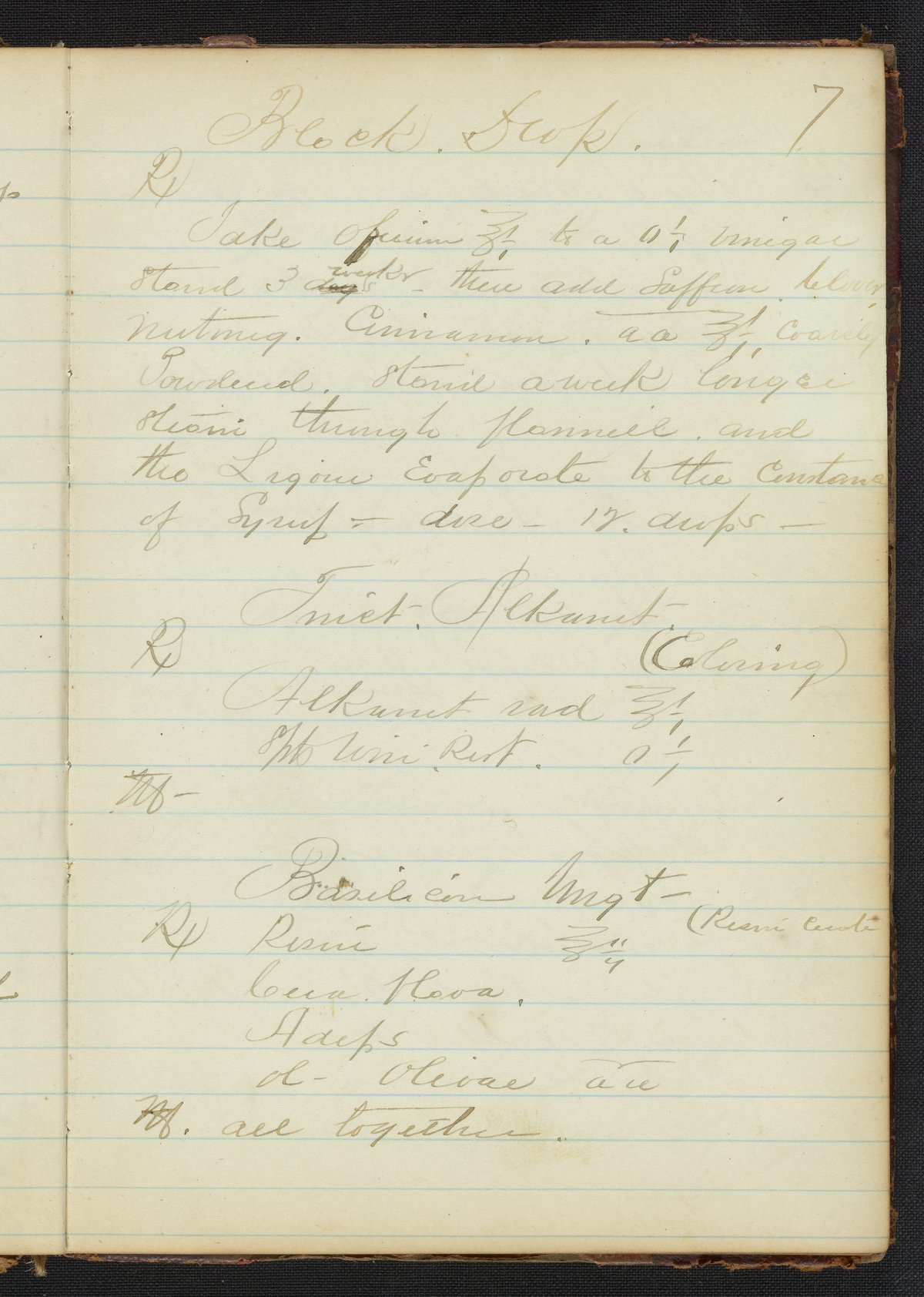 Small JPG1200 x 1633px — 472 KBLarge JPG2880 x 3920px — 2.5 MBFull-sized JPG3588 x 4884px — 3.6 MBOriginal fileTIFF — 3588 x 4884px — 50.2 MBThis notebook contains recipes and formulas developed or copied by E. F. Carey while working as an assistant pharmacist in Rhode Island and as the owner operator of a pharmacy in Massachusetts between 1863 and 1875. Includes recipes for hair wash and dye, cough syrup, writing ink, coloring billiard balls, rheumatism relief, and more.