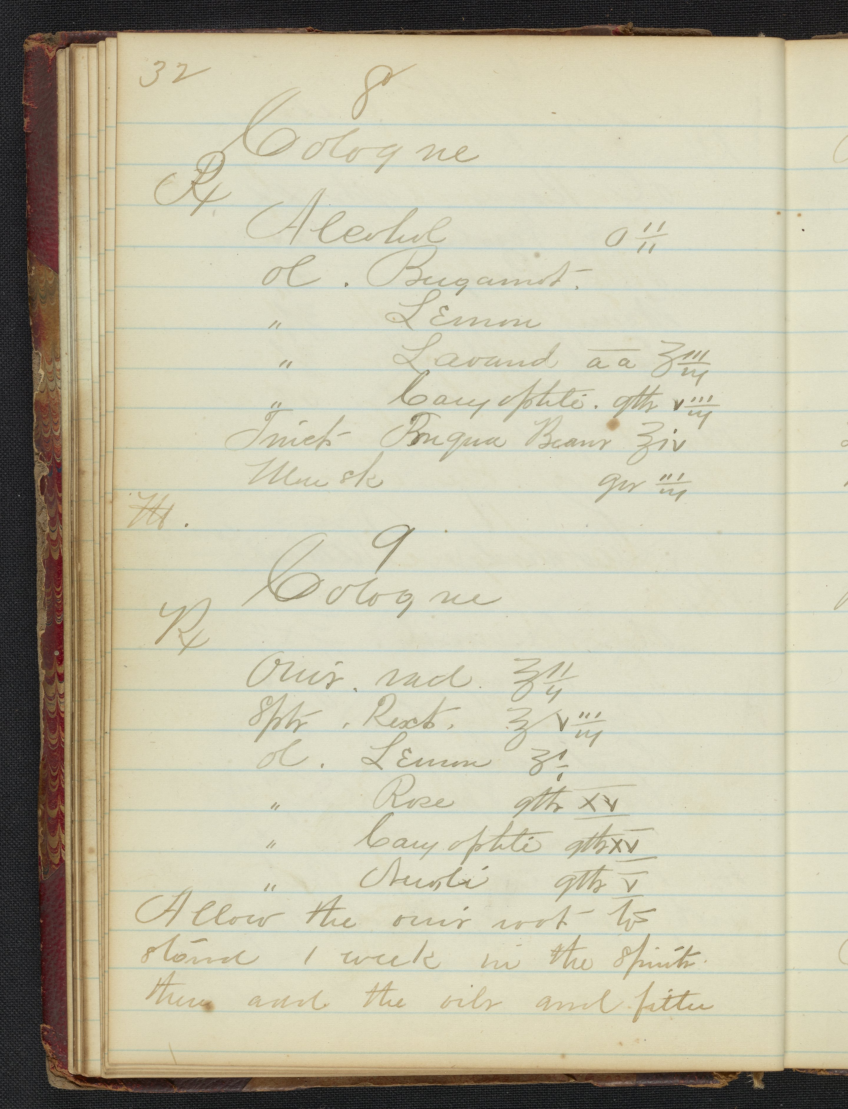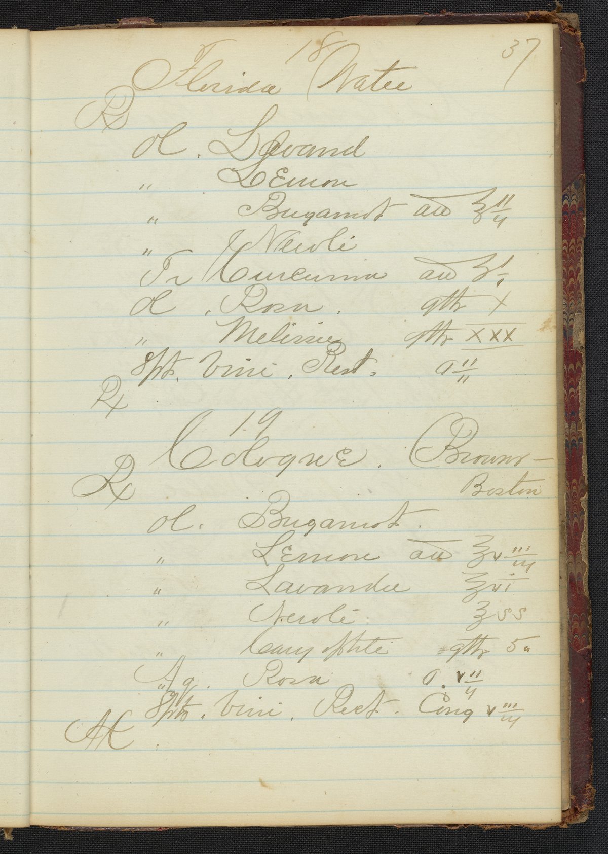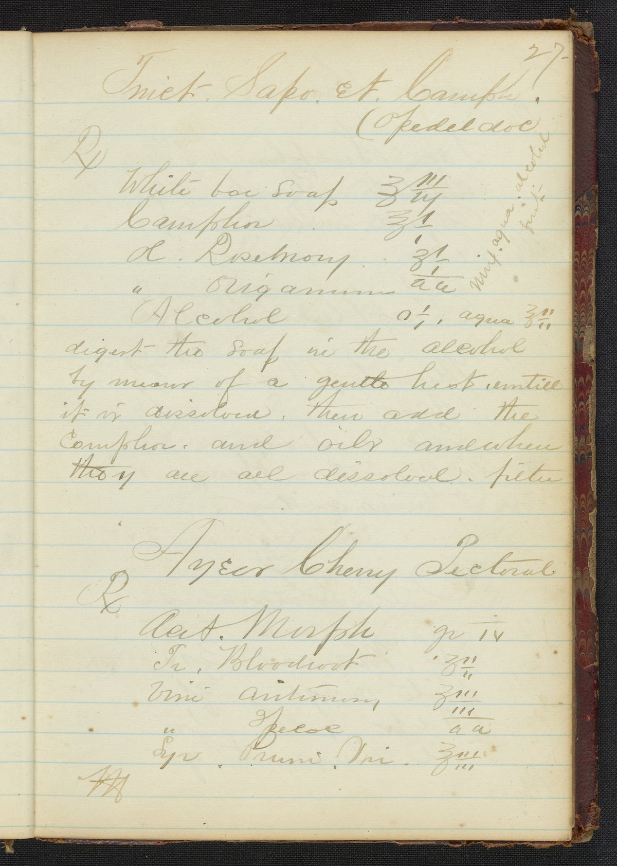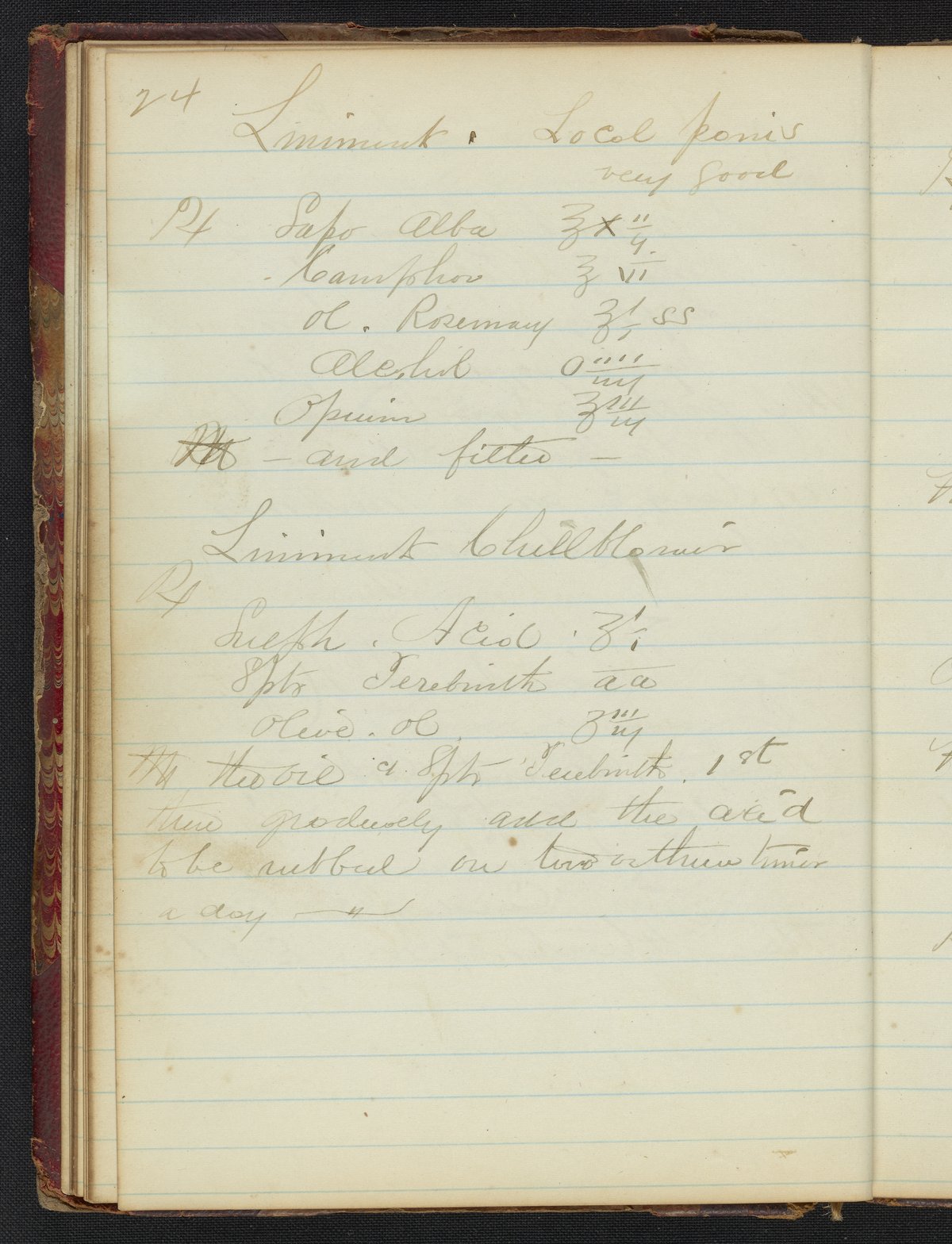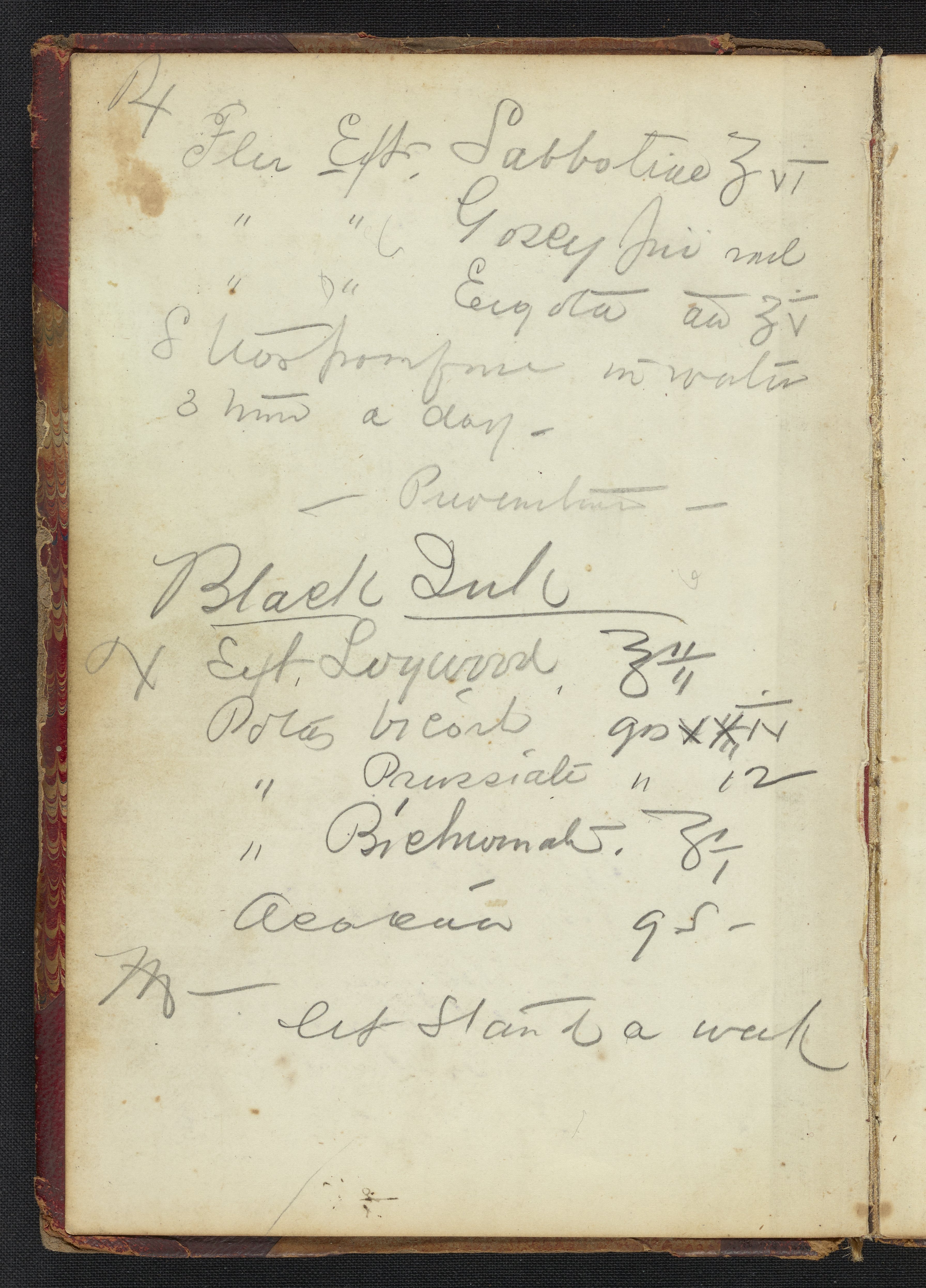 Small JPG1200 x 1633px — 472 KBLarge JPG2880 x 3920px — 2.5 MBFull-sized JPG3588 x 4884px — 3.6 MBOriginal fileTIFF — 3588 x 4884px — 50.2 MBThis notebook contains recipes and formulas developed or copied by E. F. Carey while working as an assistant pharmacist in Rhode Island and as the owner operator of a pharmacy in Massachusetts between 1863 and 1875. Includes recipes for hair wash and dye, cough syrup, writing ink, coloring billiard balls, rheumatism relief, and more.