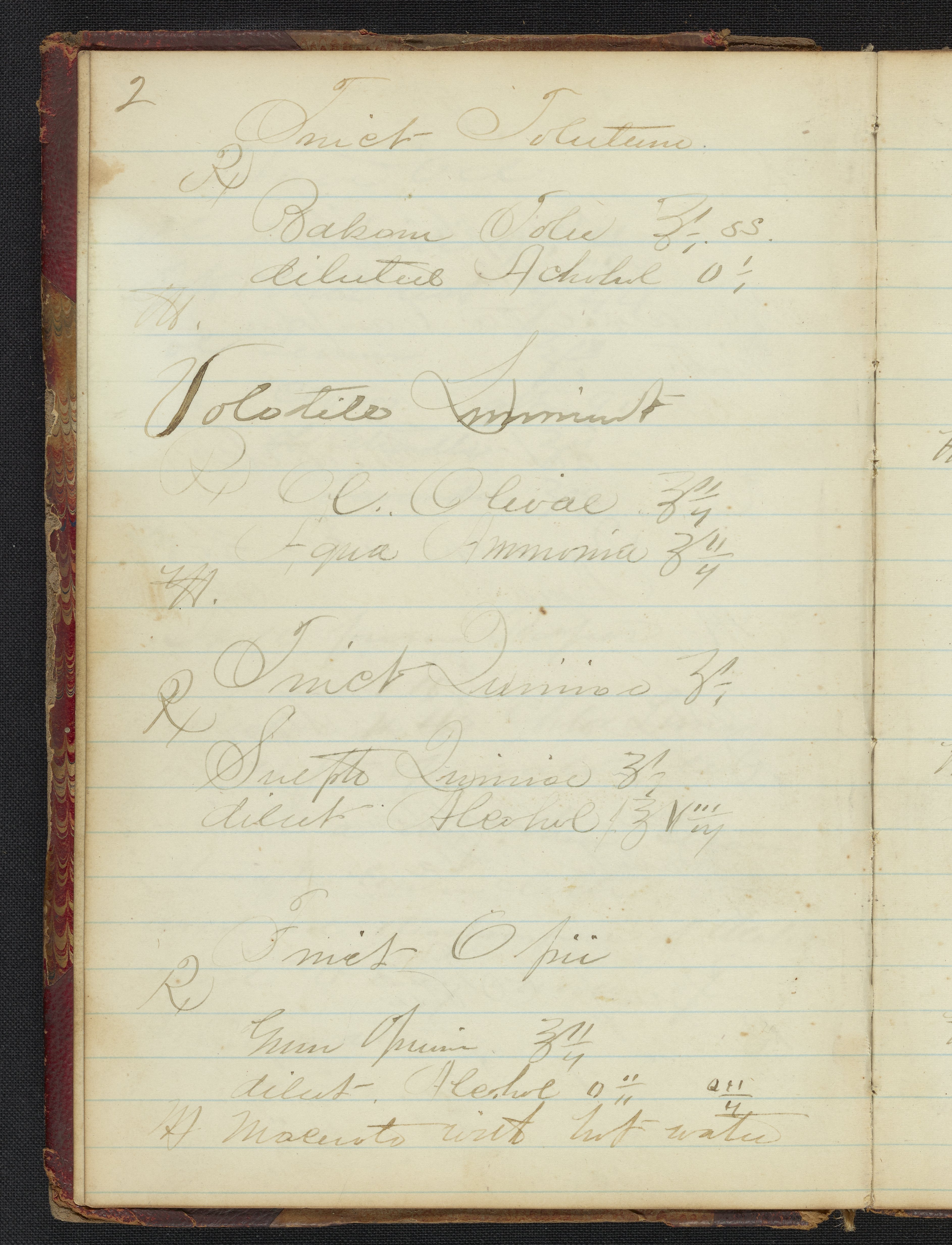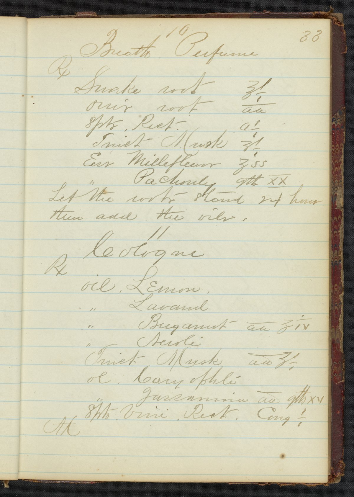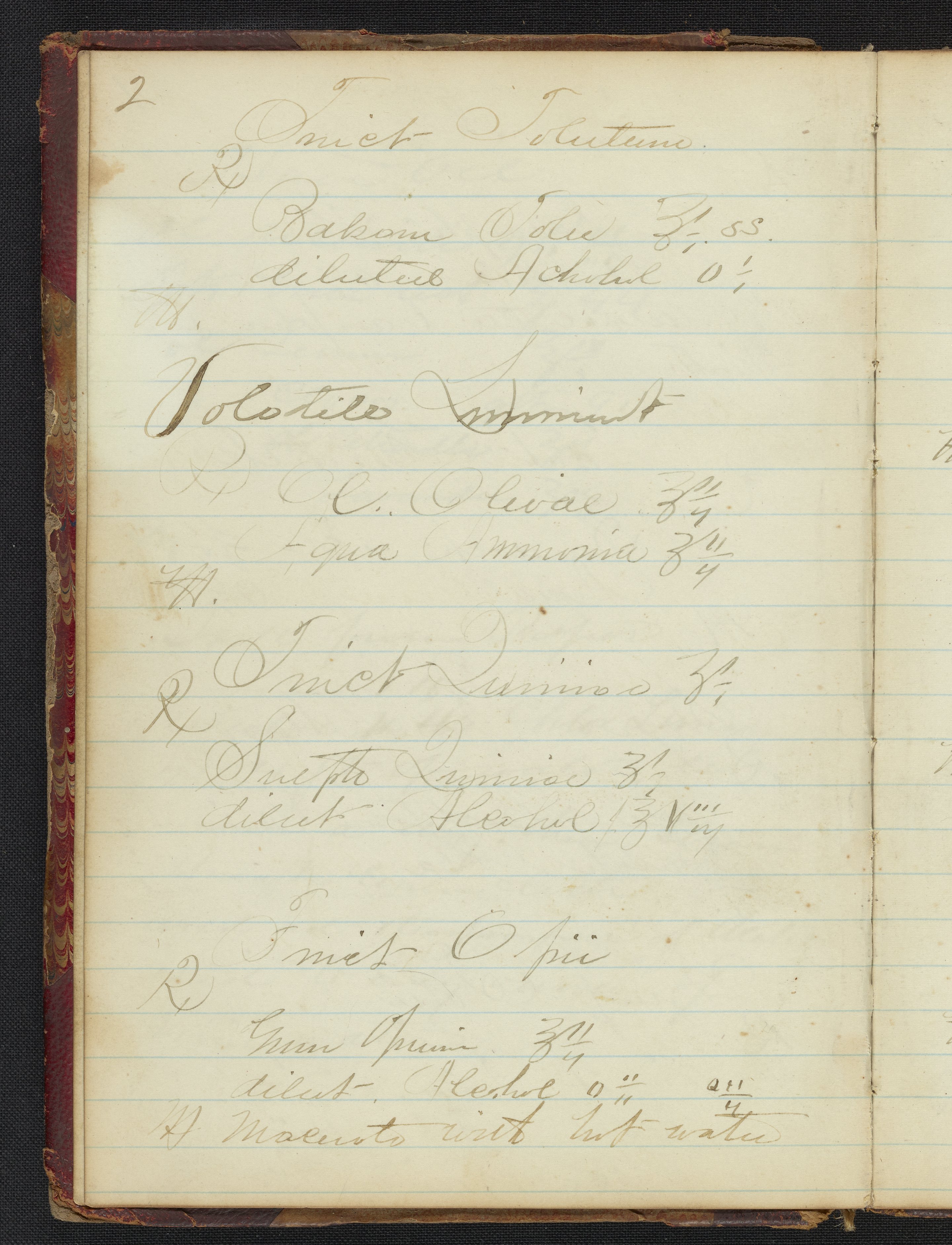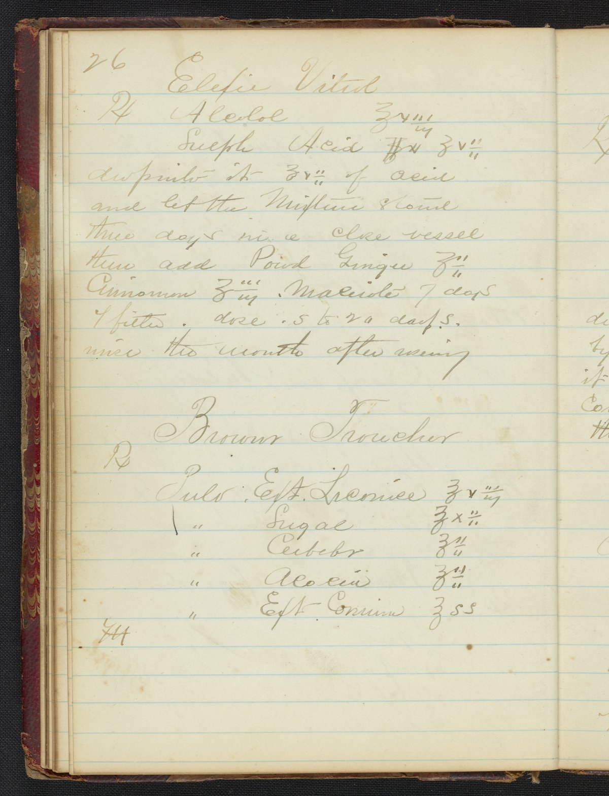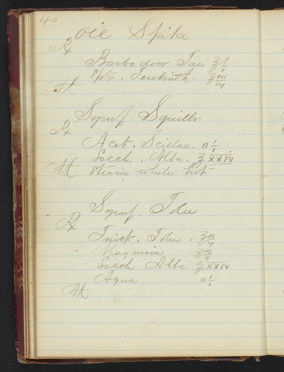 Small JPG1200 x 1633px — 472 KBLarge JPG2880 x 3920px — 2.5 MBFull-sized JPG3588 x 4884px — 3.6 MBOriginal fileTIFF — 3588 x 4884px — 50.2 MBThis notebook contains recipes and formulas developed or copied by E. F. Carey while working as an assistant pharmacist in Rhode Island and as the owner operator of a pharmacy in Massachusetts between 1863 and 1875. Includes recipes for hair wash and dye, cough syrup, writing ink, coloring billiard balls, rheumatism relief, and more.