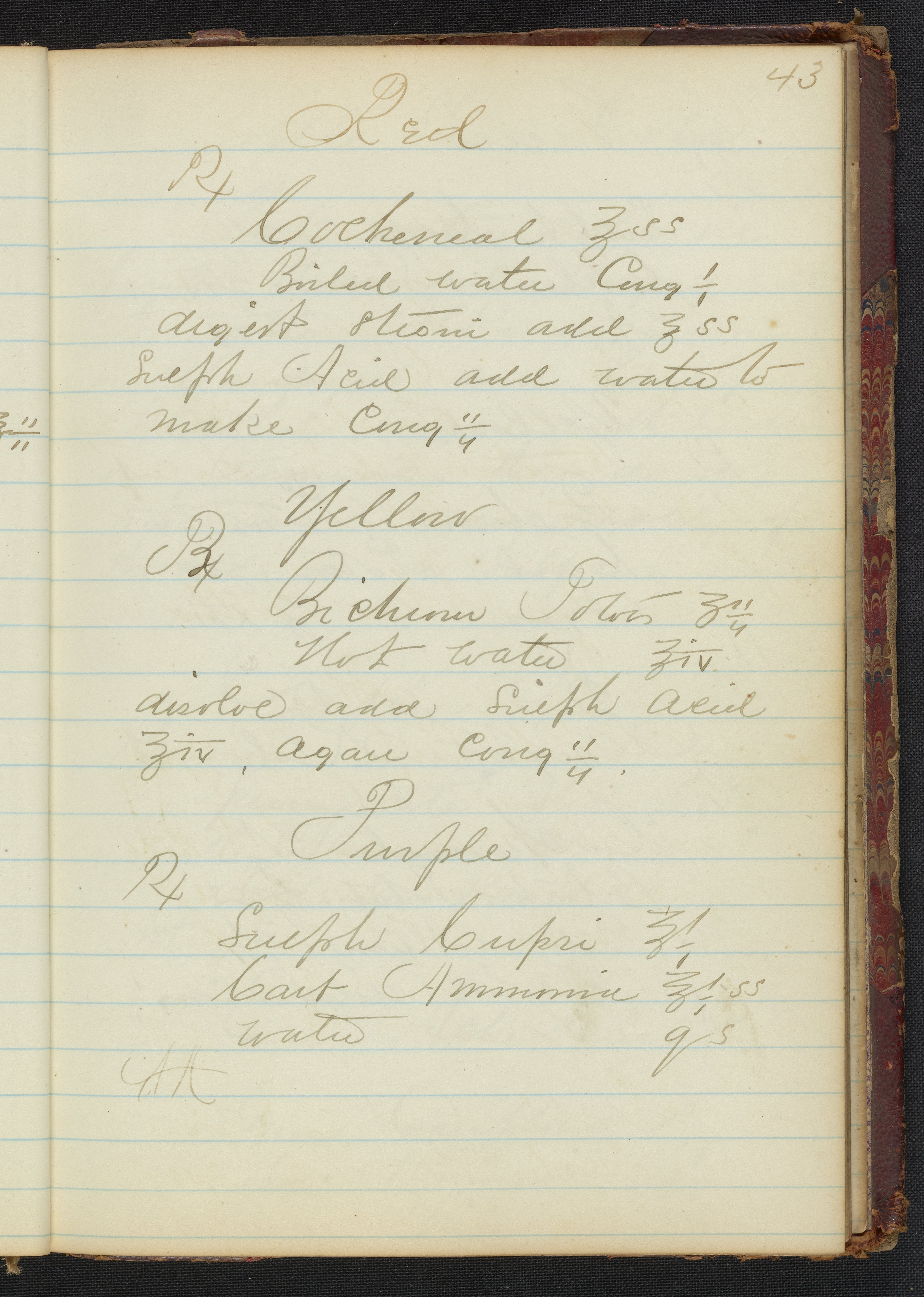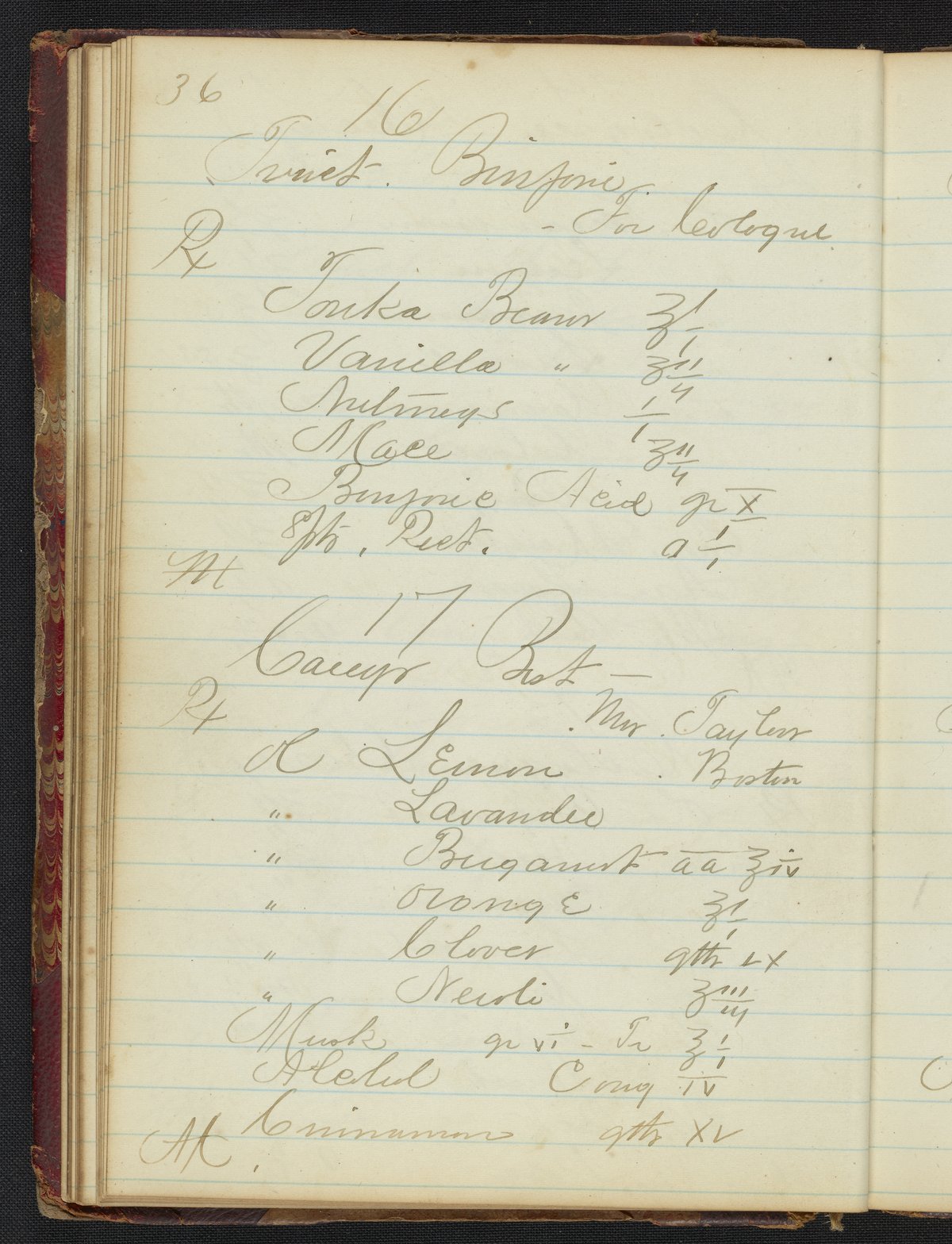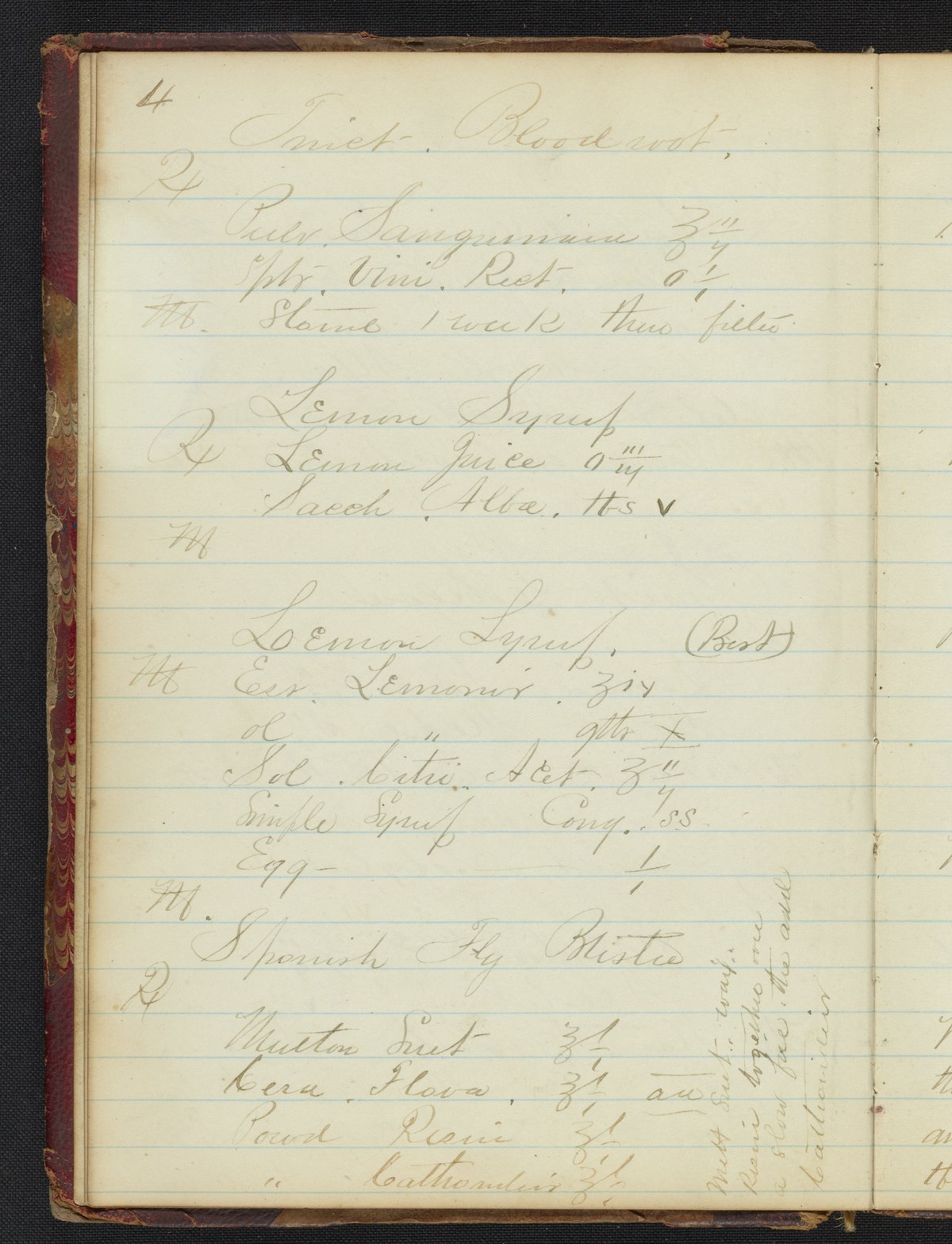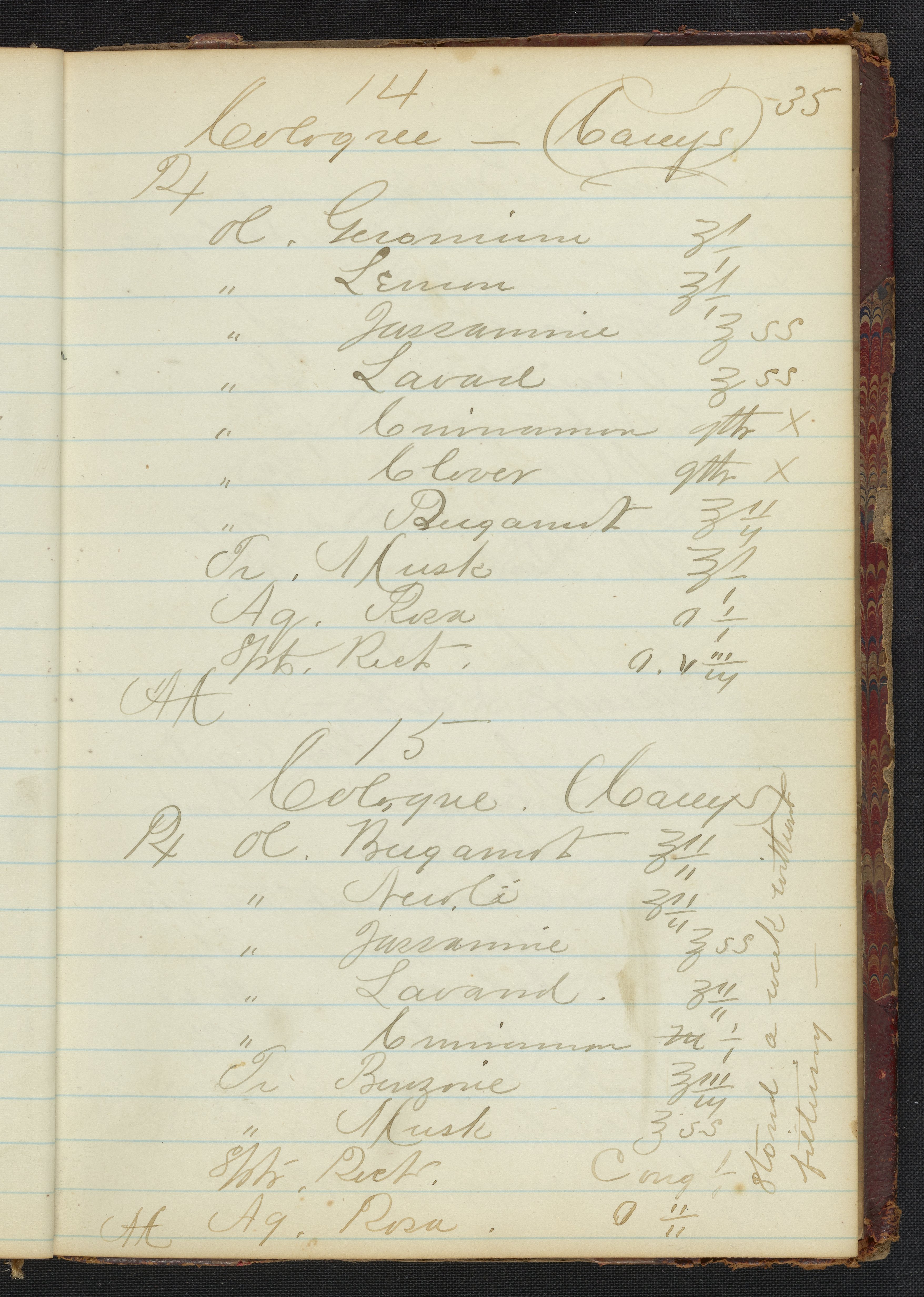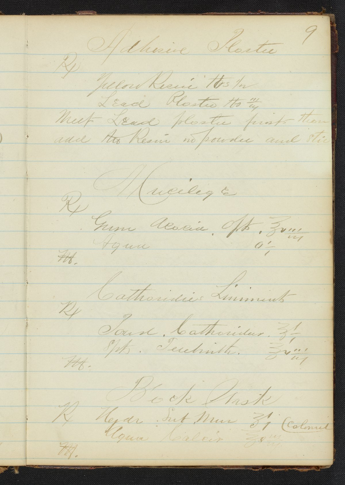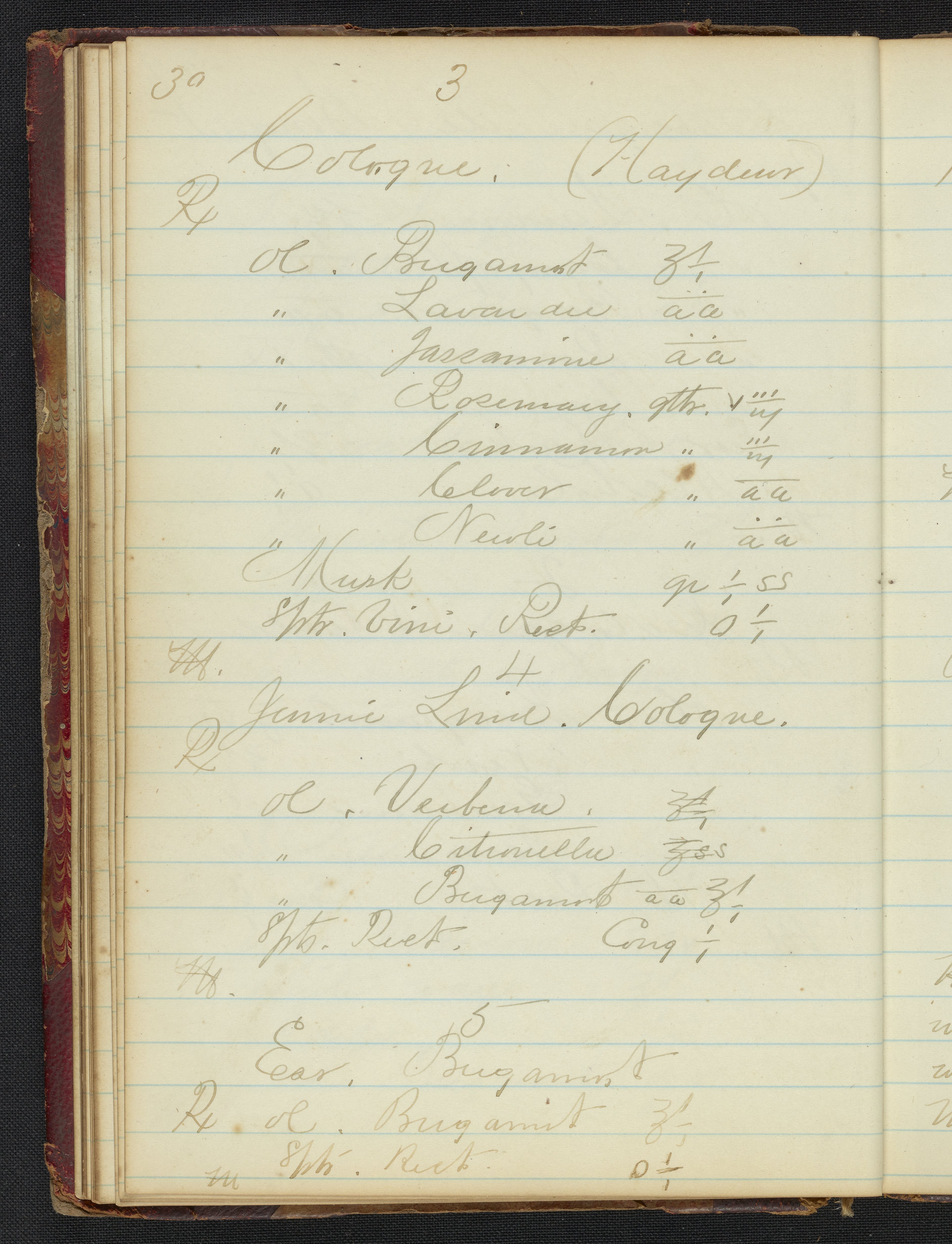 Small JPG1200 x 1633px — 472 KBLarge JPG2880 x 3920px — 2.5 MBFull-sized JPG3588 x 4884px — 3.6 MBOriginal fileTIFF — 3588 x 4884px — 50.2 MBThis notebook contains recipes and formulas developed or copied by E. F. Carey while working as an assistant pharmacist in Rhode Island and as the owner operator of a pharmacy in Massachusetts between 1863 and 1875. Includes recipes for hair wash and dye, cough syrup, writing ink, coloring billiard balls, rheumatism relief, and more.