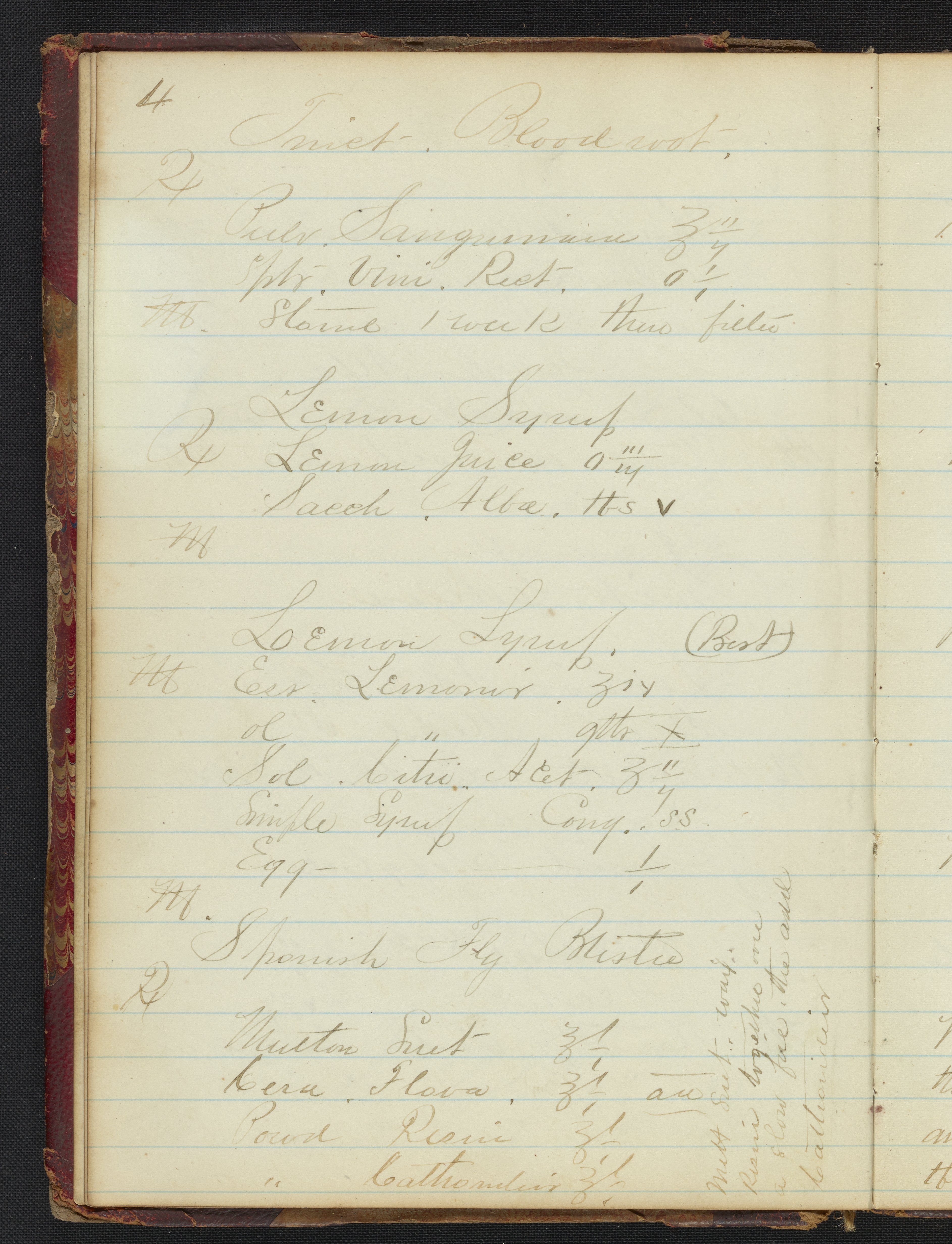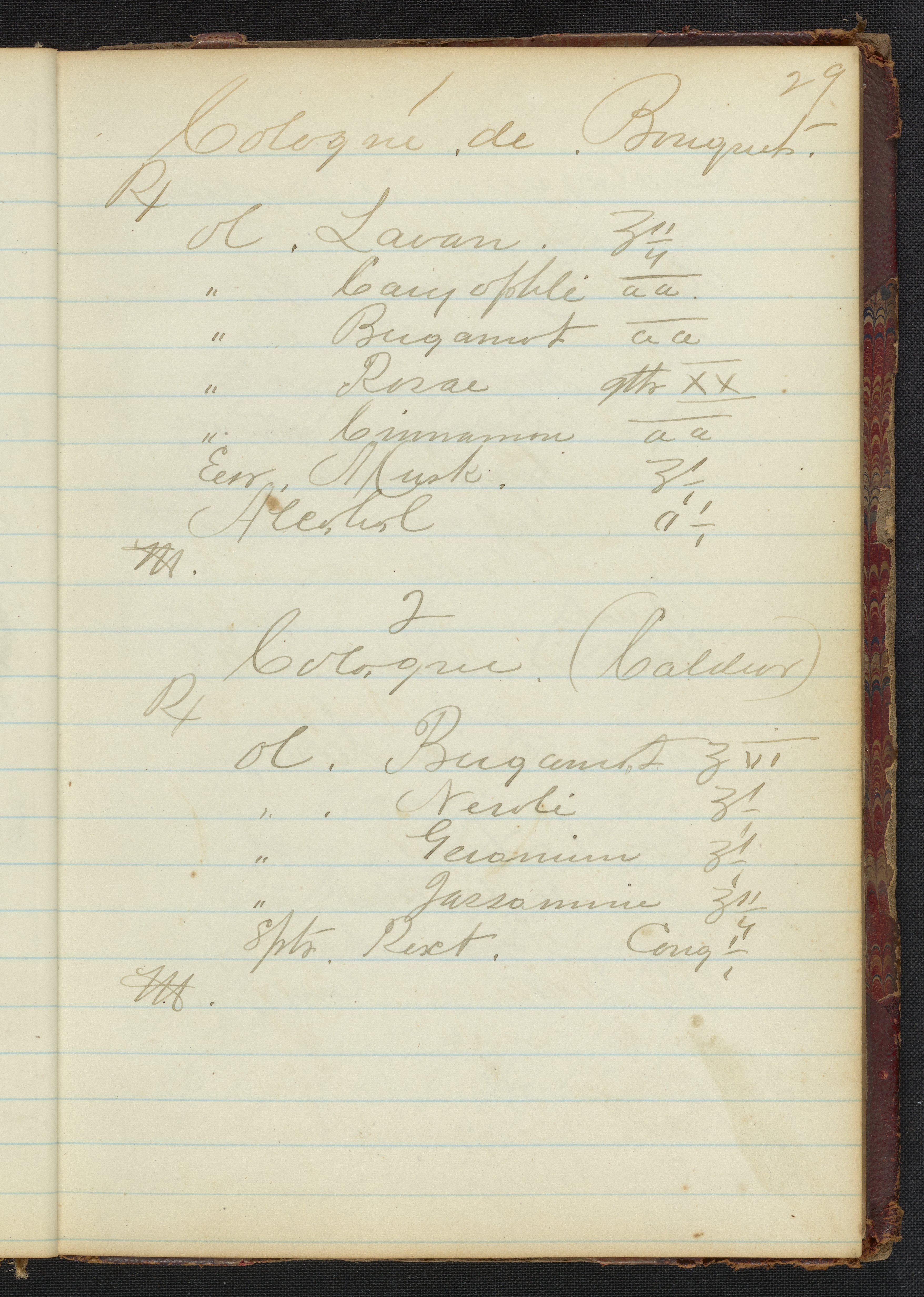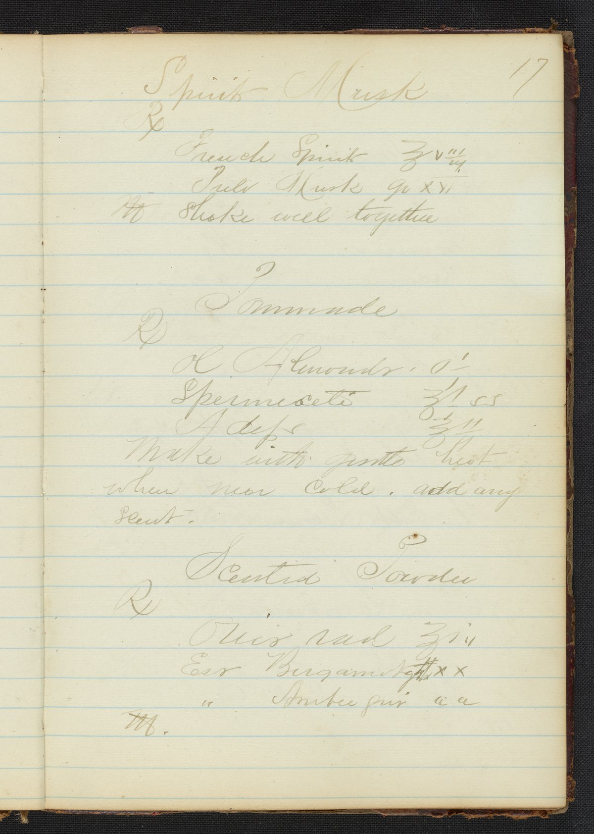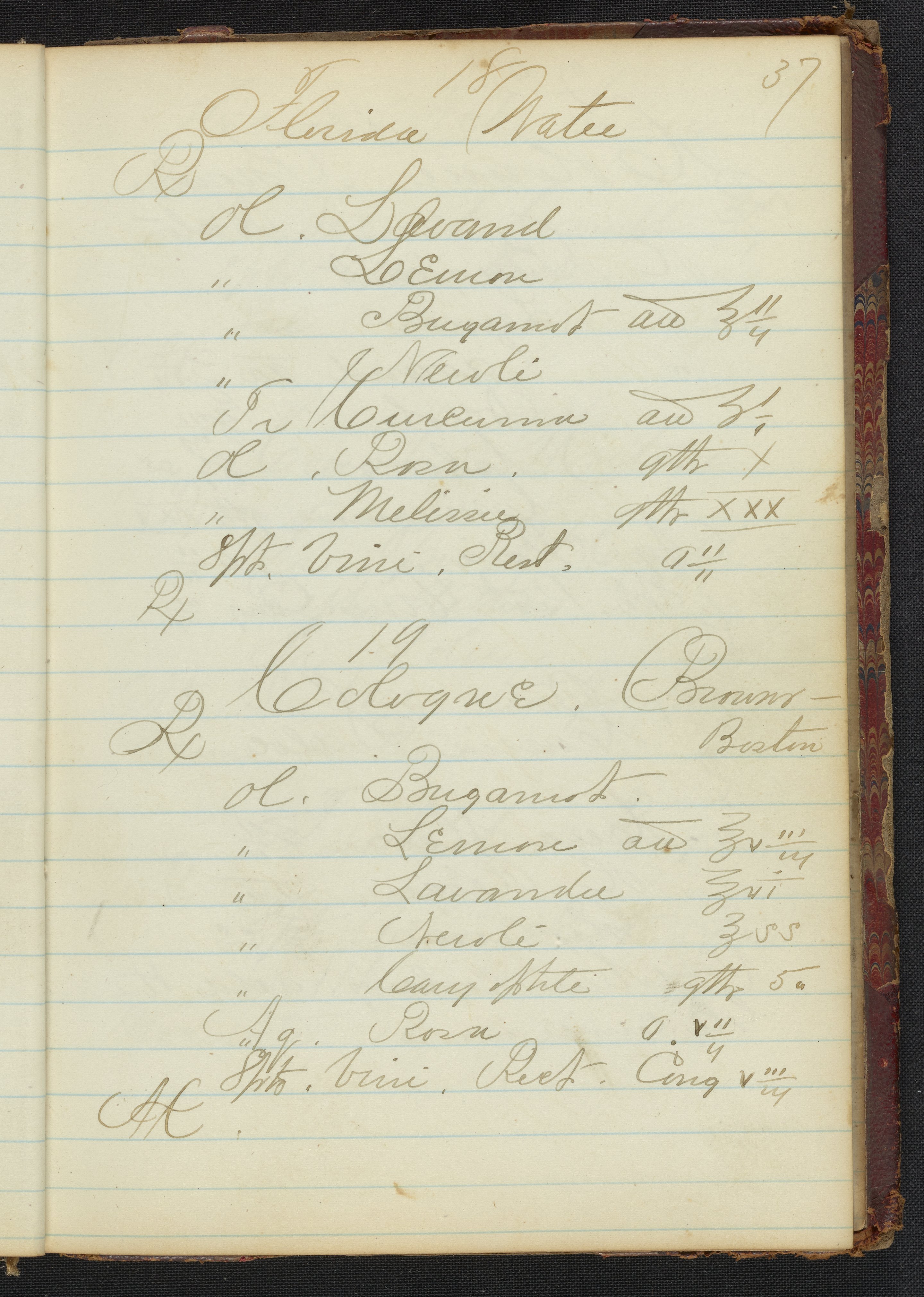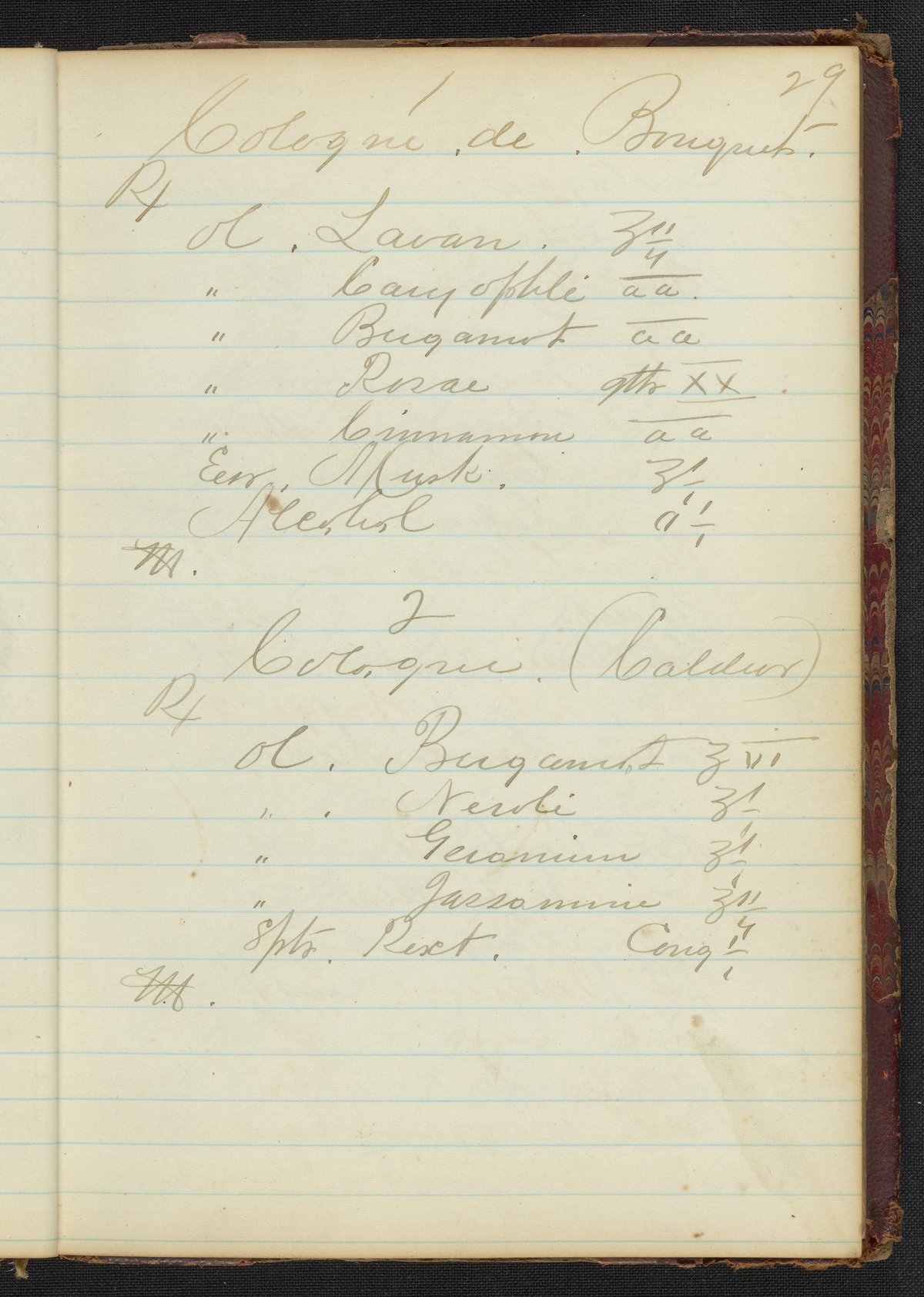 Small JPG1200 x 1633px — 472 KBLarge JPG2880 x 3920px — 2.5 MBFull-sized JPG3588 x 4884px — 3.6 MBOriginal fileTIFF — 3588 x 4884px — 50.2 MBThis notebook contains recipes and formulas developed or copied by E. F. Carey while working as an assistant pharmacist in Rhode Island and as the owner operator of a pharmacy in Massachusetts between 1863 and 1875. Includes recipes for hair wash and dye, cough syrup, writing ink, coloring billiard balls, rheumatism relief, and more.