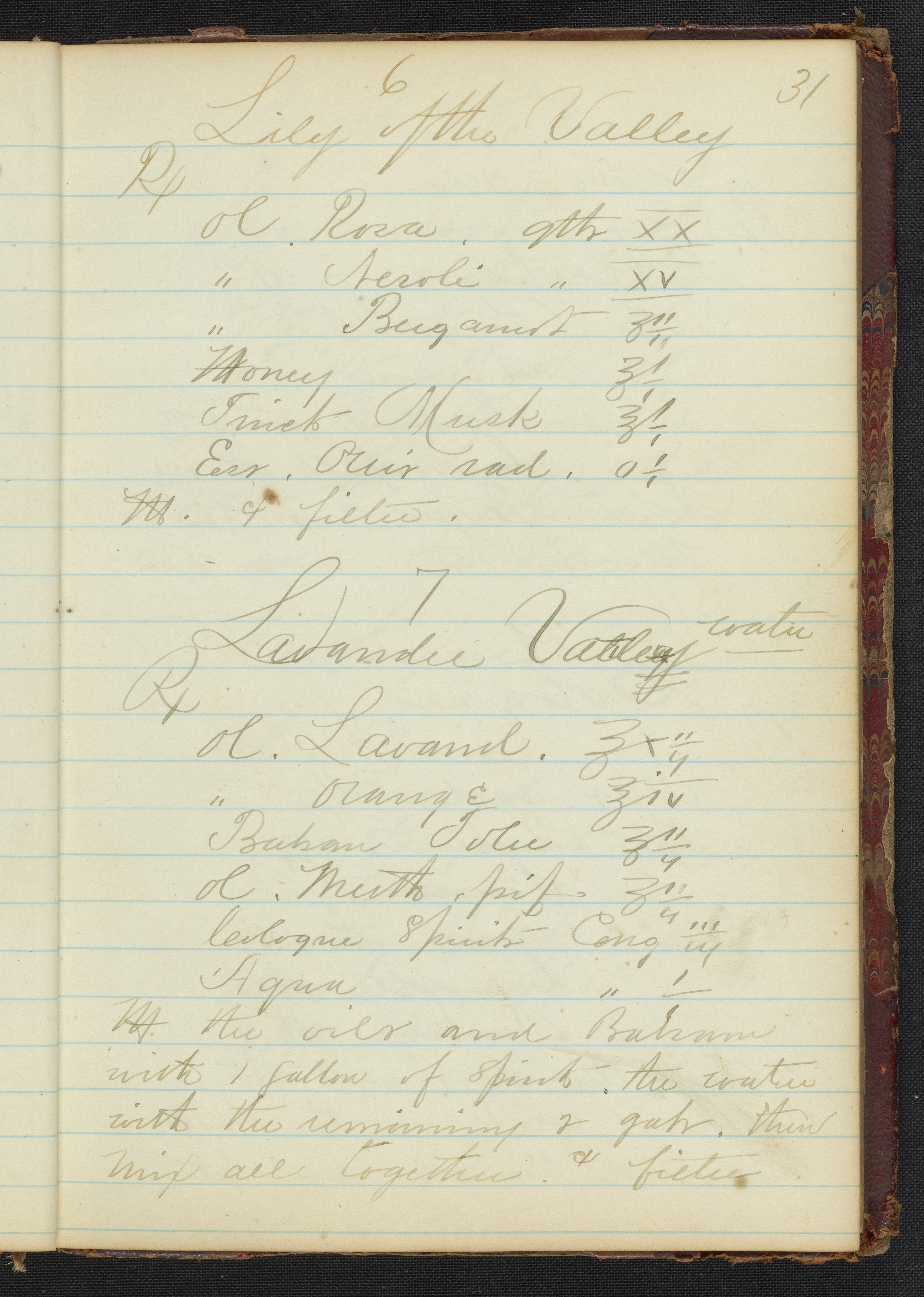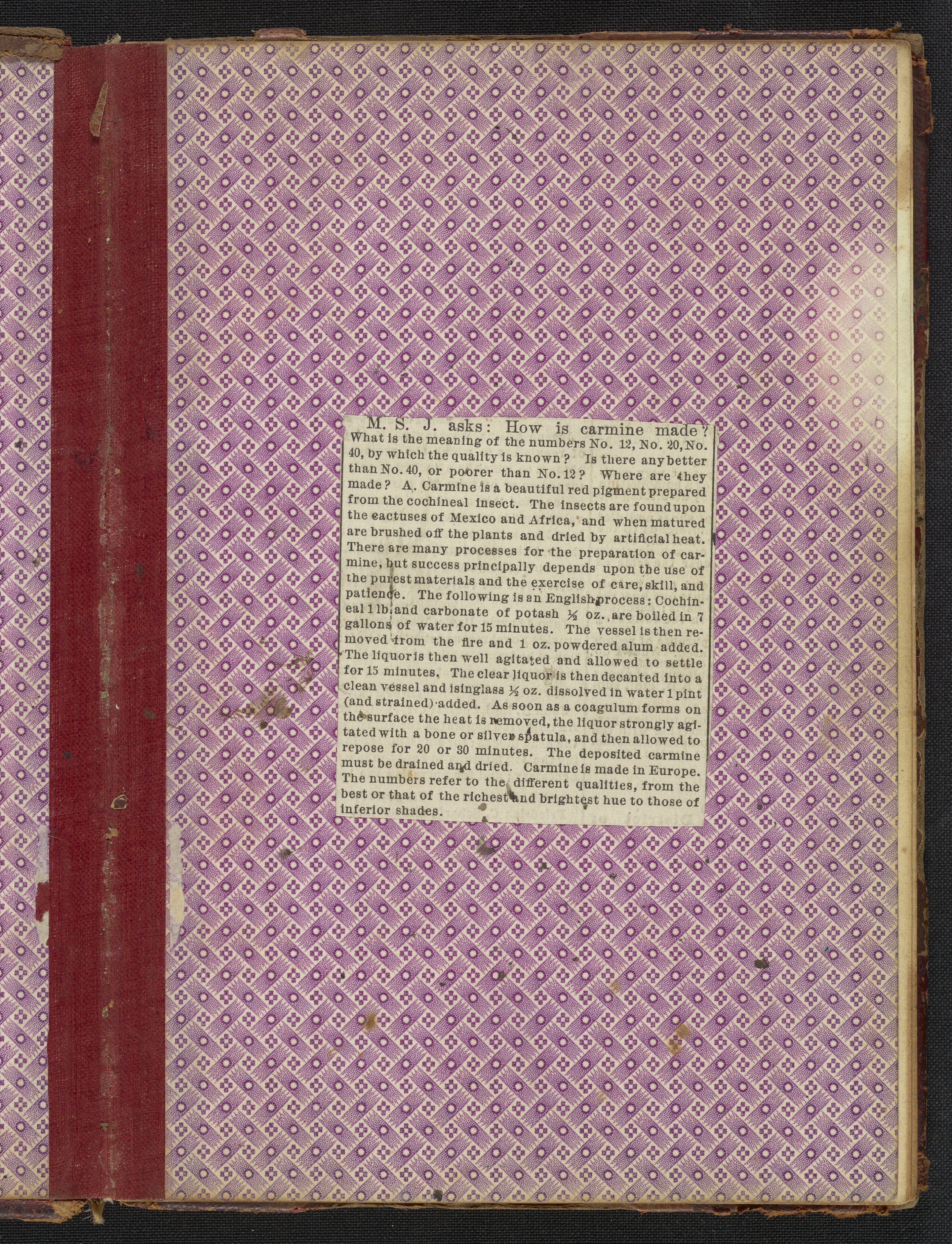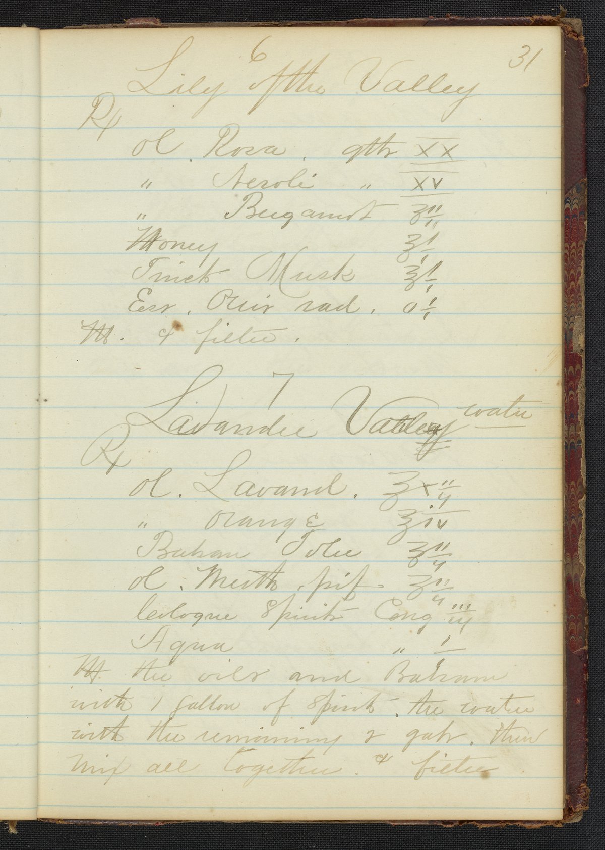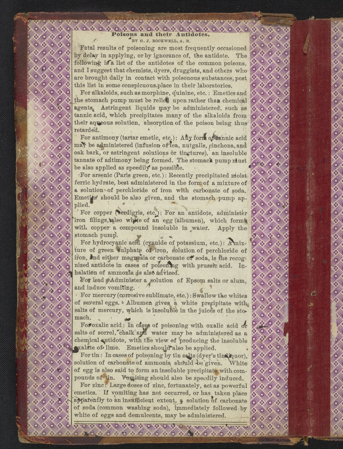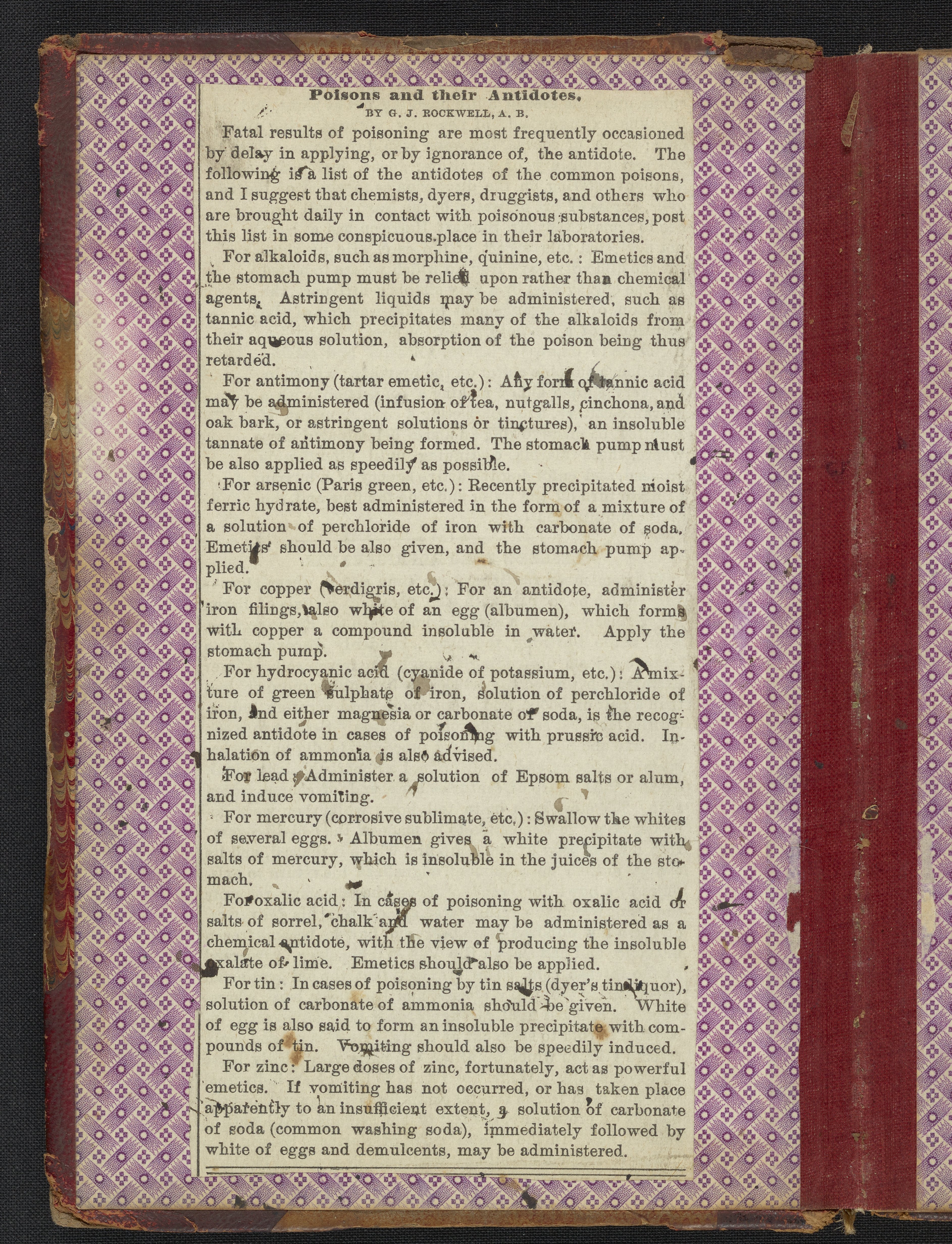 Small JPG1200 x 1633px — 472 KBLarge JPG2880 x 3920px — 2.5 MBFull-sized JPG3588 x 4884px — 3.6 MBOriginal fileTIFF — 3588 x 4884px — 50.2 MBThis notebook contains recipes and formulas developed or copied by E. F. Carey while working as an assistant pharmacist in Rhode Island and as the owner operator of a pharmacy in Massachusetts between 1863 and 1875. Includes recipes for hair wash and dye, cough syrup, writing ink, coloring billiard balls, rheumatism relief, and more.