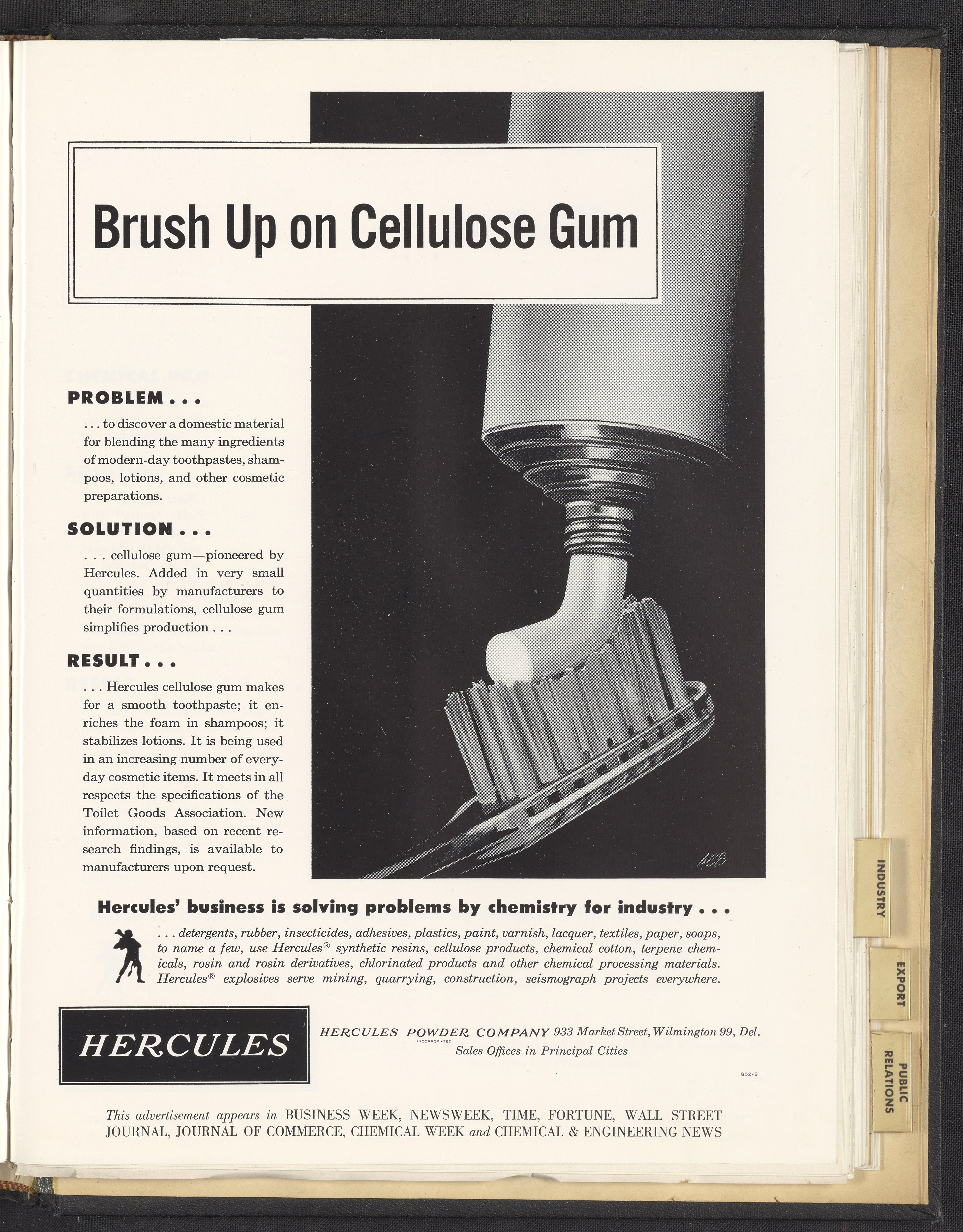 Print advertisement for cellulose gum, manufactured and sold by Hercules Powder Company as a stabilizer and thickening agent in consumer goods. The advertisement features a lifelike illustration of a toothpaste tube dispensing paste onto a toothbrush. The accompanying text describes the use of cellulose gum in "modern-day toothpastes, shampoos, lotions and other cosmetic preparations." This advertisement appeared in Business Week, Newsweek, Time, Fortune, Wall Street Journal, Journal of Commerce, Chemical Week and Chemical & Engineering News.
