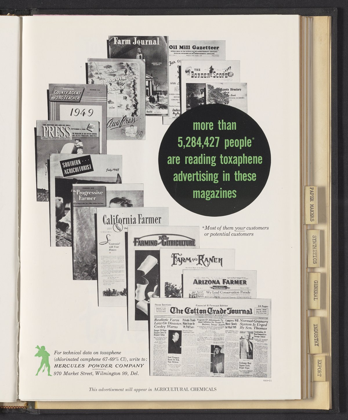 Hercules Incorporated. “More Than 5,284,427 People Are Reading Toxaphene Advertising in These Magazines.” 1949 Hercules Advertisements, 1949. Records of Hercules Incorporated, Volume 1949. Science History Institute. Philadelphia. https://digital.sciencehistory.org/works/4m90dw30g.