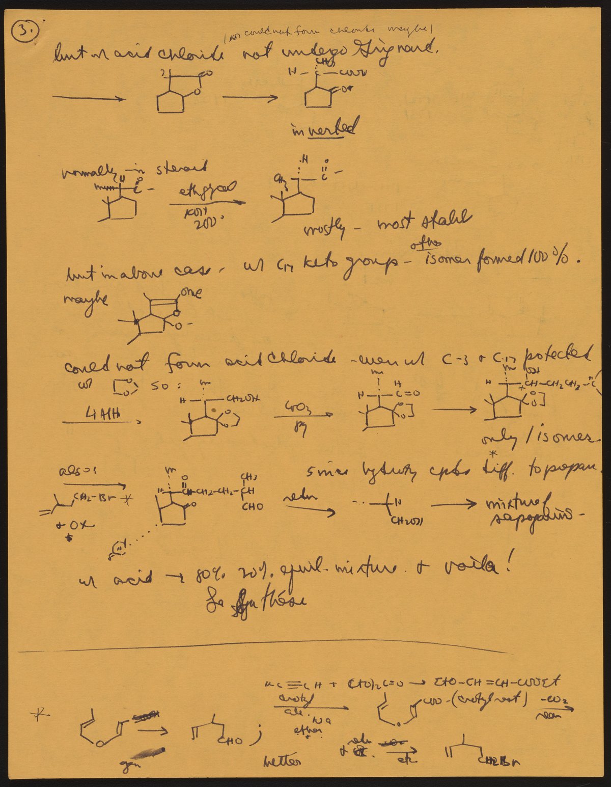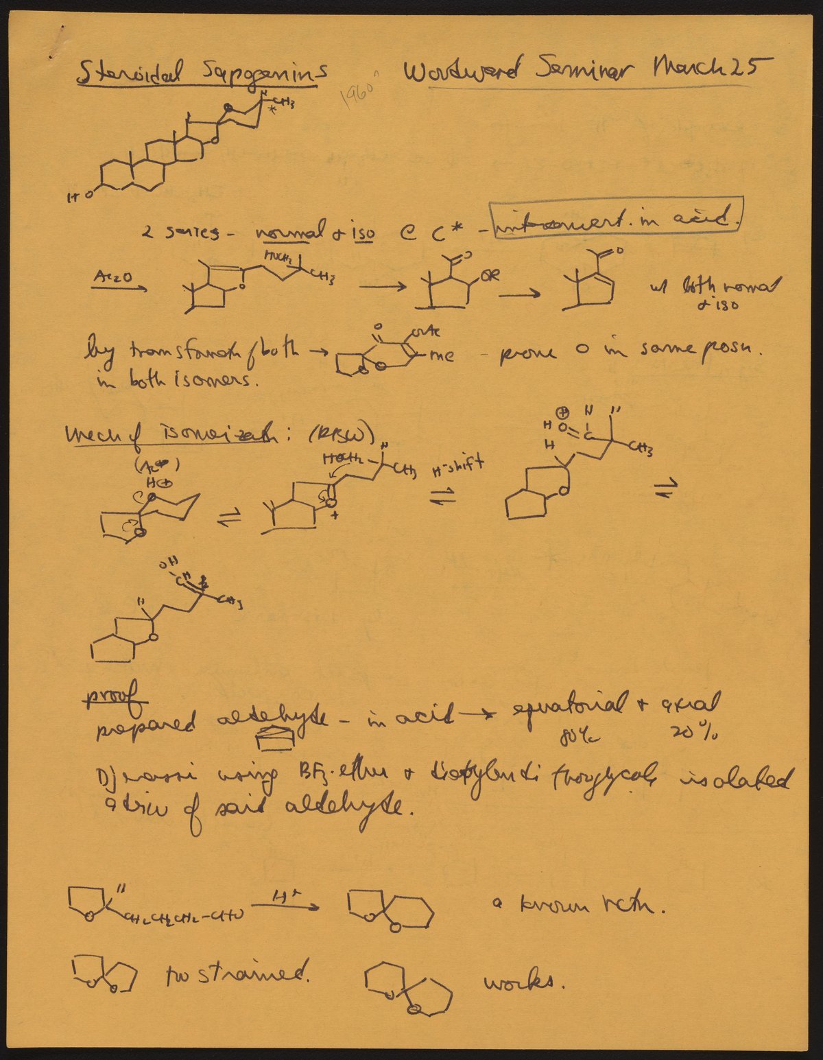 Kohler, Robert E. “R. B. (Robert Burns) Woodward Seminar Entitled ‘Steroidal Sapogenins.’” Notes from R. B. (Robert Burns) Woodward's Seminars, circa 1959–1966. Folder 2. Science History Institute. Philadelphia. https://digital.sciencehistory.org/works/4m90dw517.