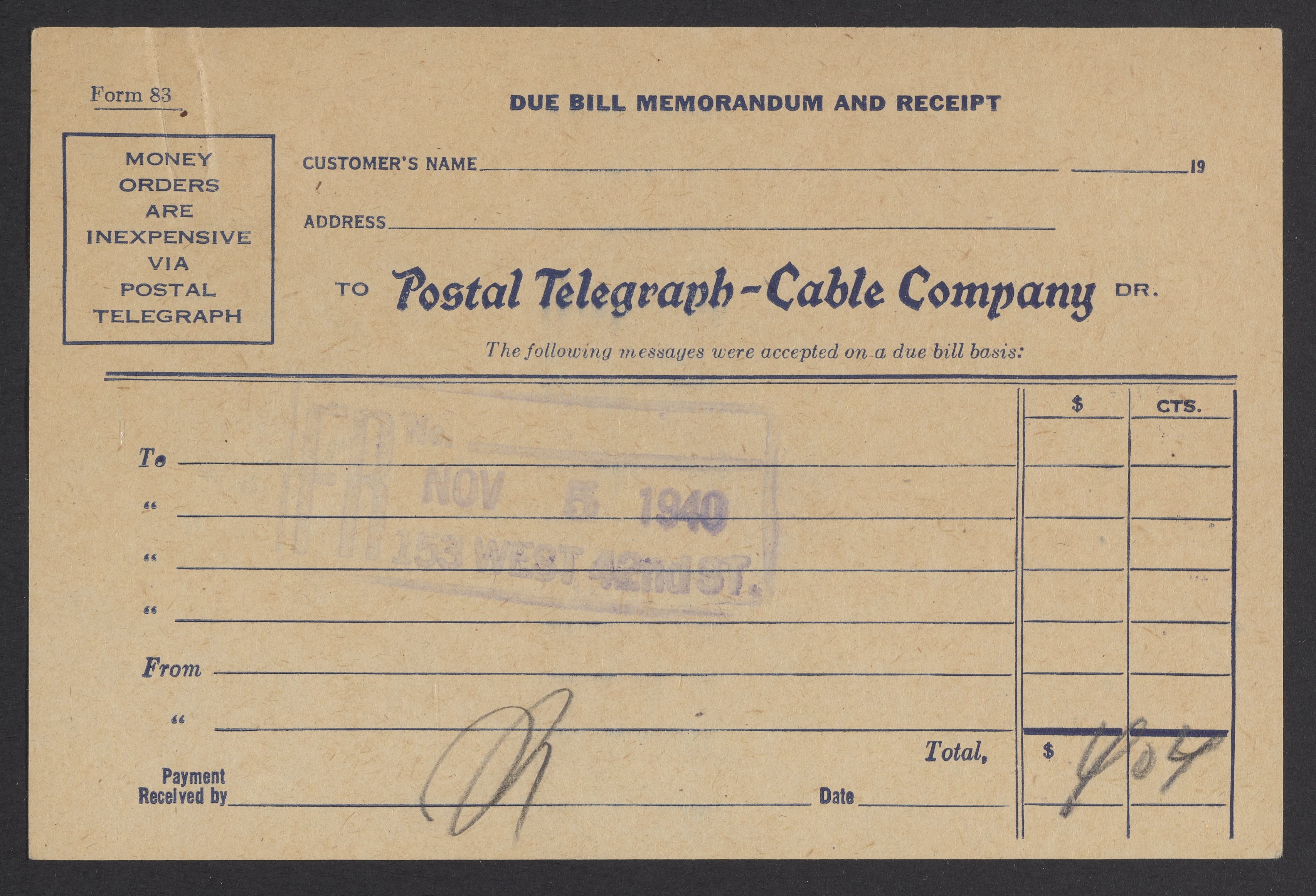 Money order form for the Postal Telegraph-Cable Company