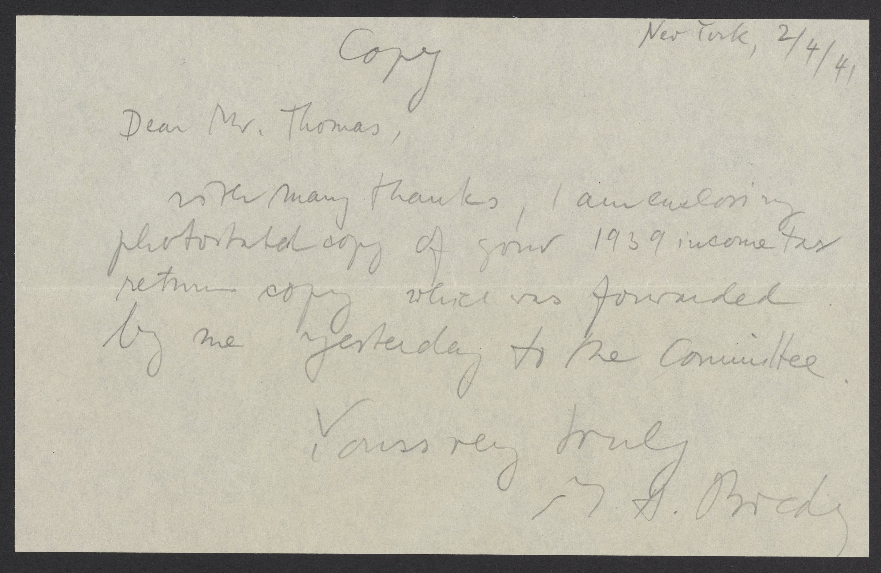 Letter marked "copy" from Max Bredig (1902-1977) to Abel Cary Thomas. The letter thanks Thomas for sending him copies of his 1939, income tax returns.