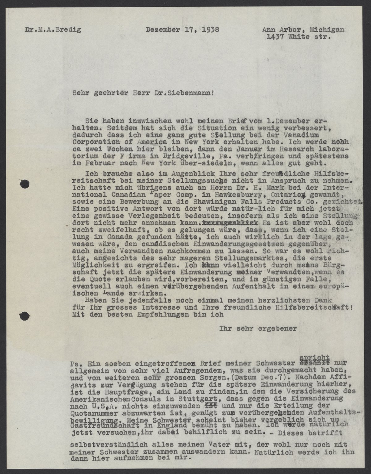 Sie haben inzwischen wohl meinen Brief vom 1. Dezember erhalten. Seitdem hat sich die Situation ein wenig verbessert, dadurch dass ich eine ganz gute Stellung bei der Vanadium Corporation of America in New York erhalten habe. Ich werde noch ca zwei Wochen hier bleiben, dann den Januar im Research laboratorium der Firma in Bridgeville, Pa. verbringen und spätestens im Februar nach New York übersiedeln, wenn alles gut geht.