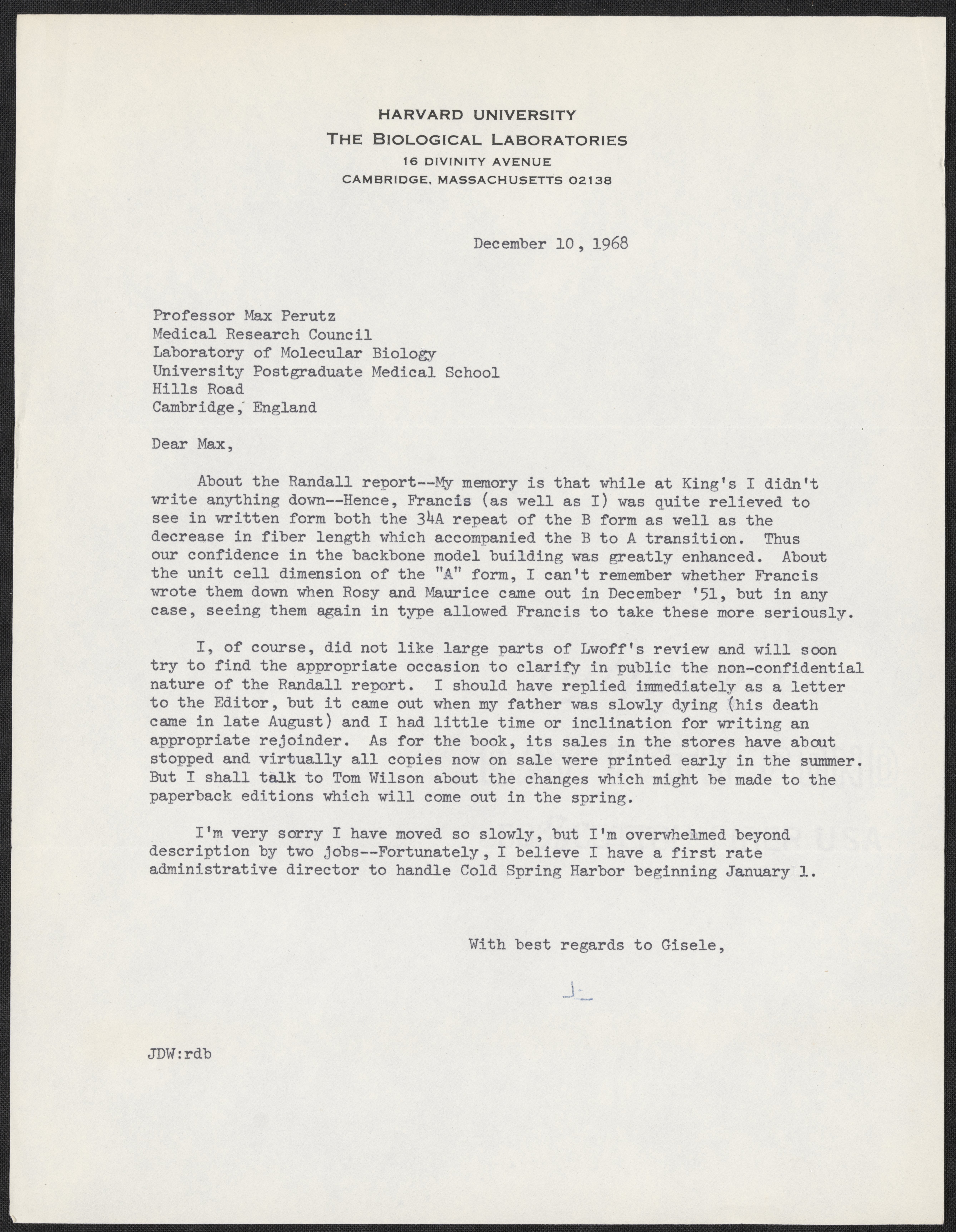Letter from James D. Watson to Max Perutz, December 10, 1968