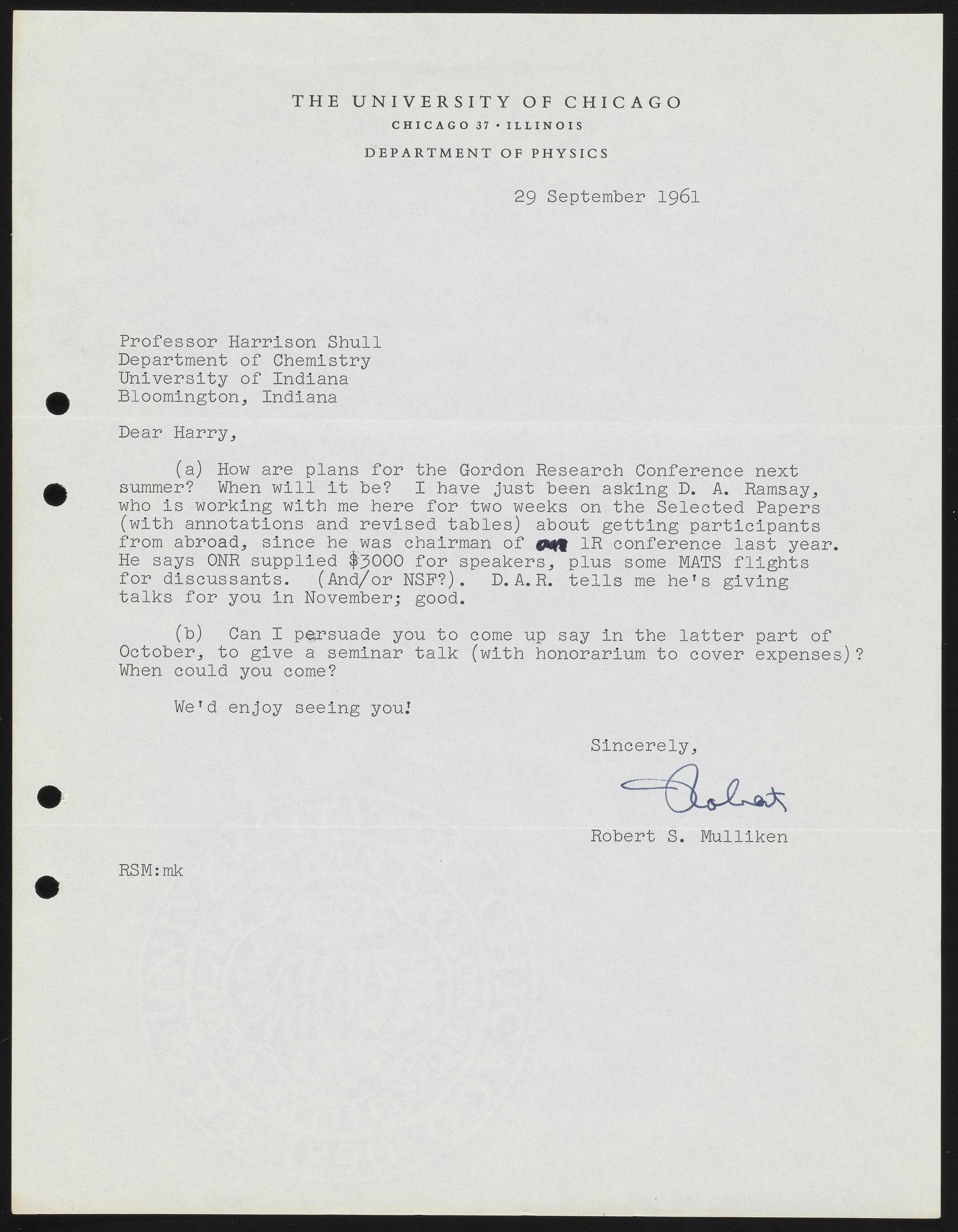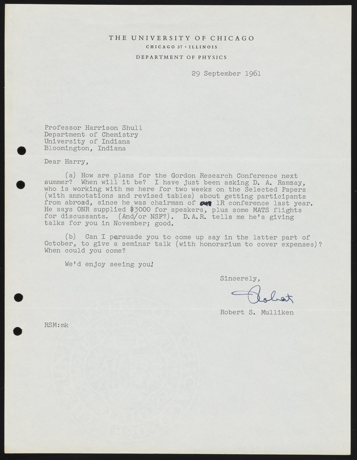 Letter from Robert S. Mulliken to Harrison Shull, 1961