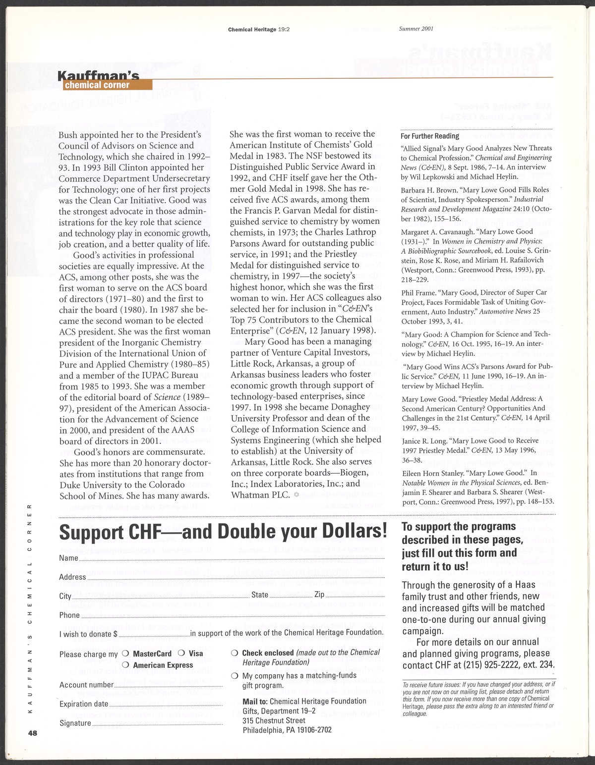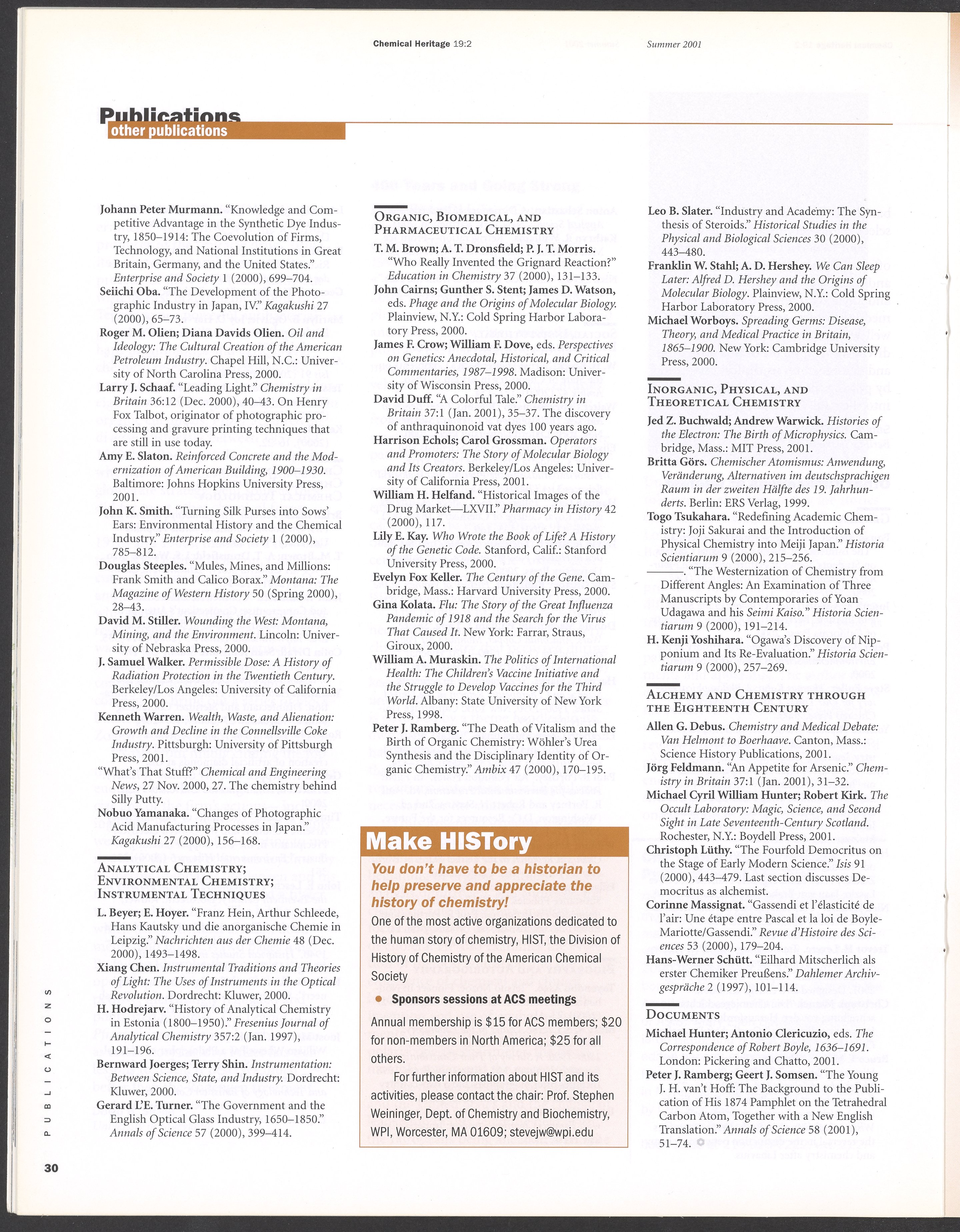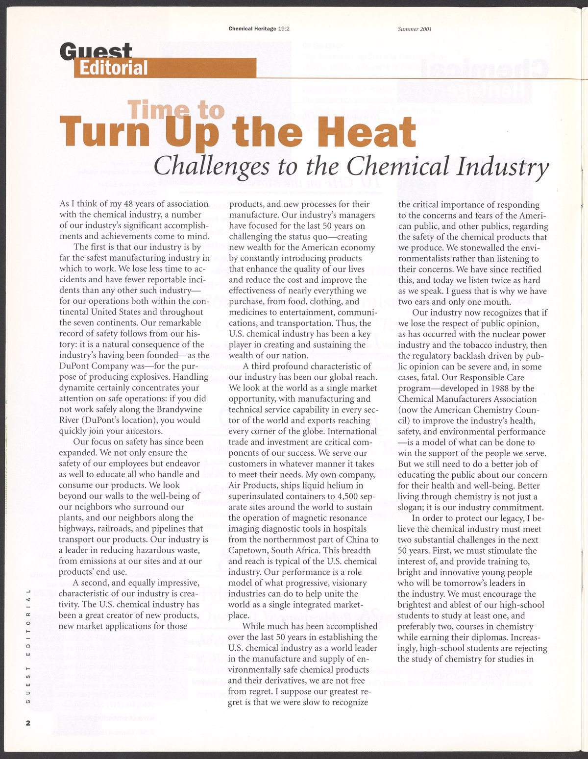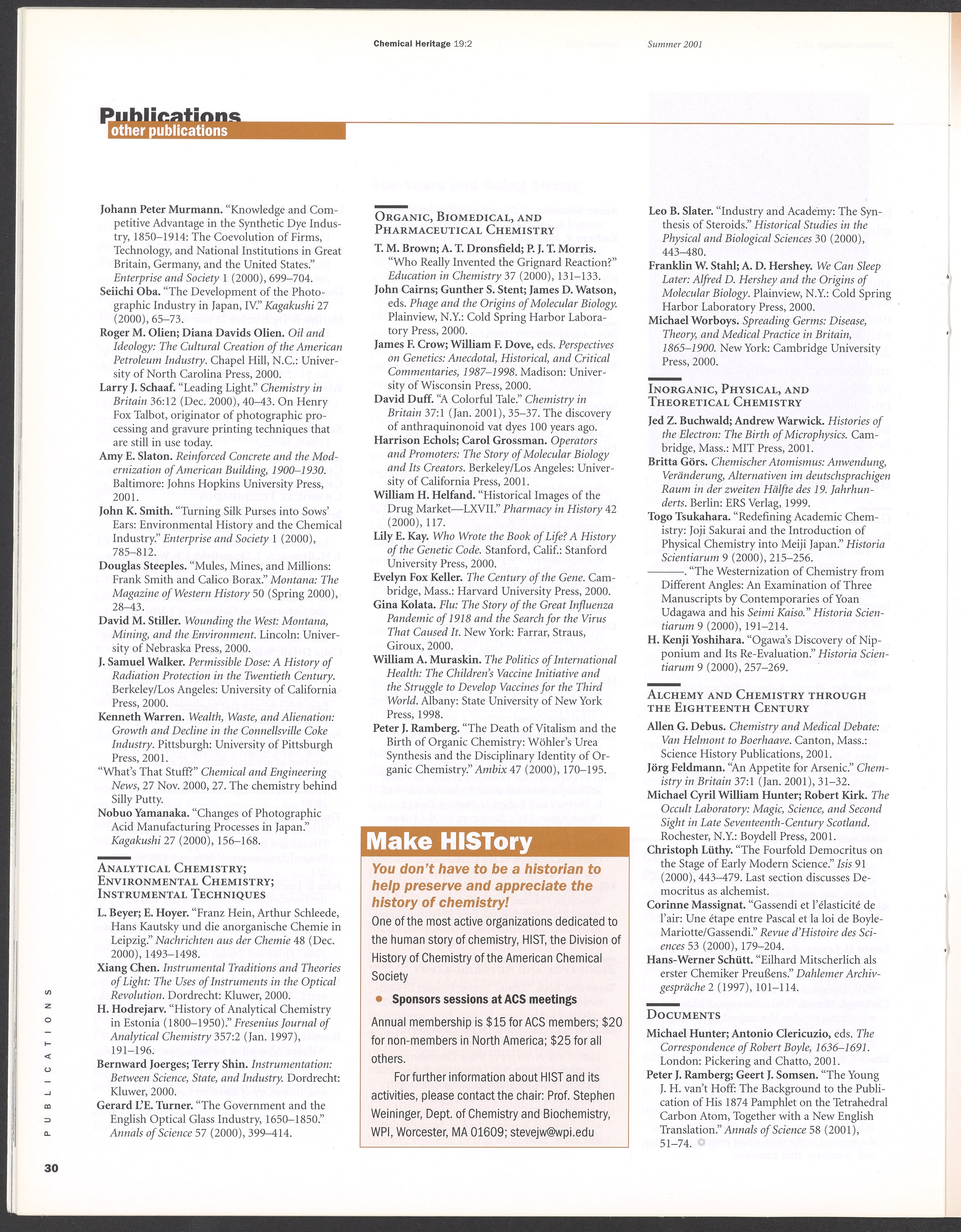 “Chemical Heritage, Volume 19 Number 2.” Philadelphia, Pennsylvania: Chemical Heritage Foundation, 2001. 099C001. Science History Institute. Philadelphia. https://digital.sciencehistory.org/works/4qr25ck.