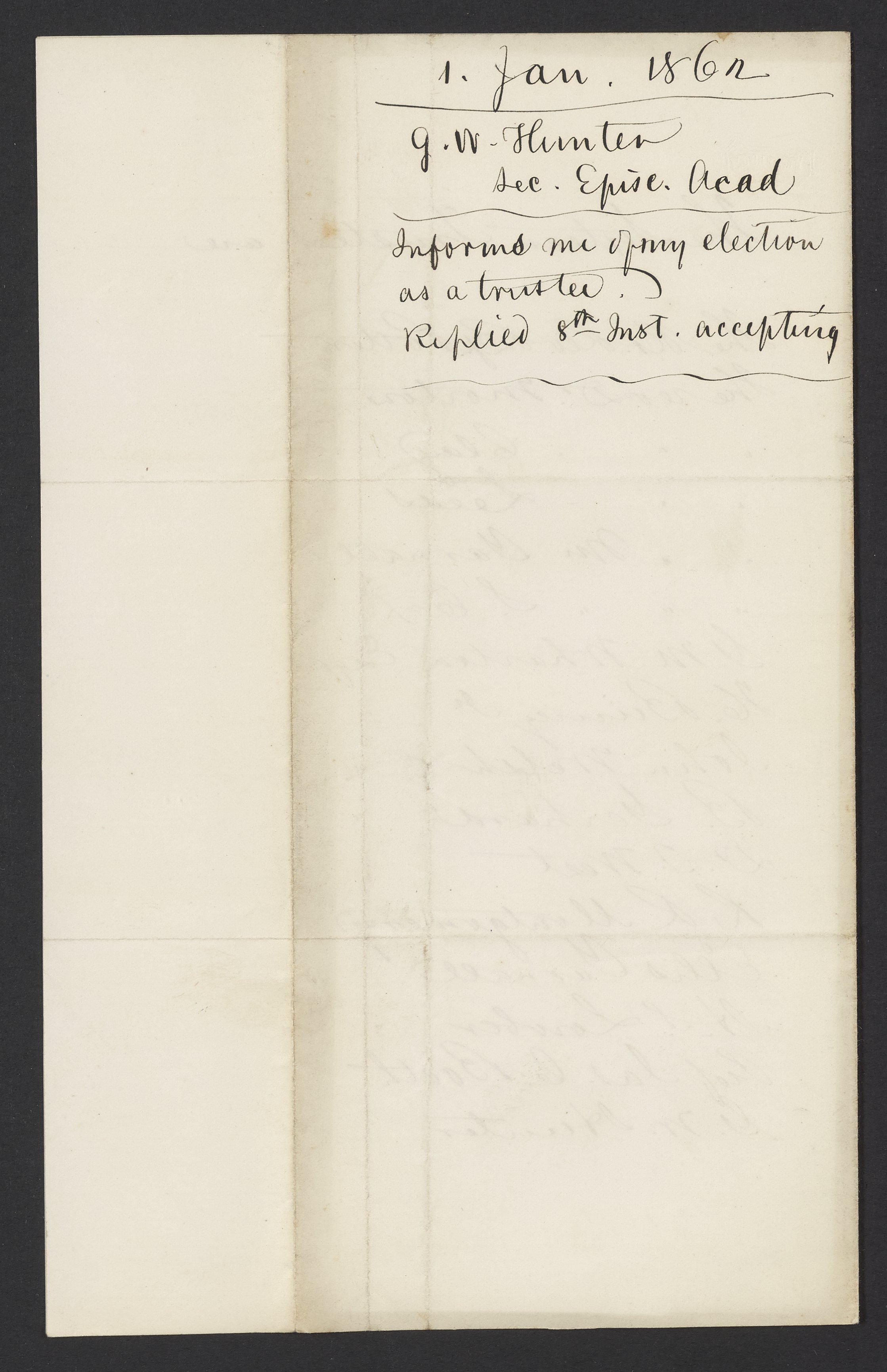 Small JPG1200 x 1843px — 247 KBFull-sized JPG2238 x 3438px — 776 KBOriginal fileTIFF — 2238 x 3438px — 22.1 MBG. W. Hunter, Secretary of the Academy of the Protestant Episcopal Church, informs James Curtis Booth (1810-1888) that he has been unanimously elected a Trustee of the Academy.