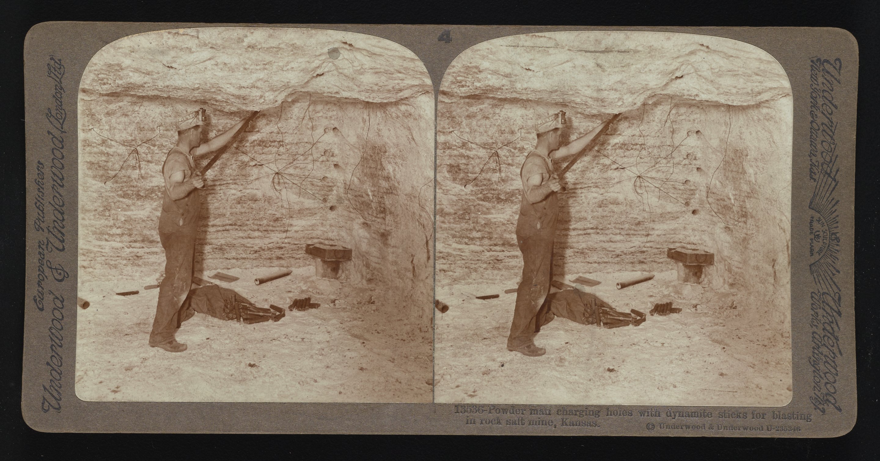Powder man charging holes with dynamite sticks for blasting in rock salt mine, Kansas