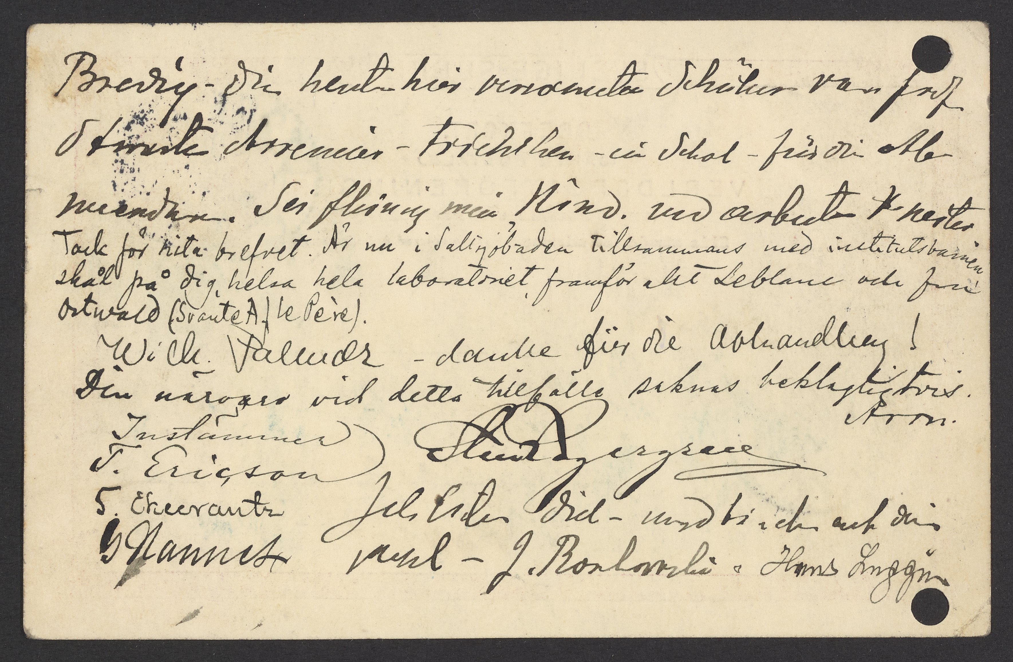 Luggins, Hans. “Postcard from Colleagues to Georg Bredig, March 1896,” March 30, 1896. Papers of Georg and Max Bredig, Box 2, Folder 28. Science History Institute. Philadelphia. https://digital.sciencehistory.org/works/4u9x210.