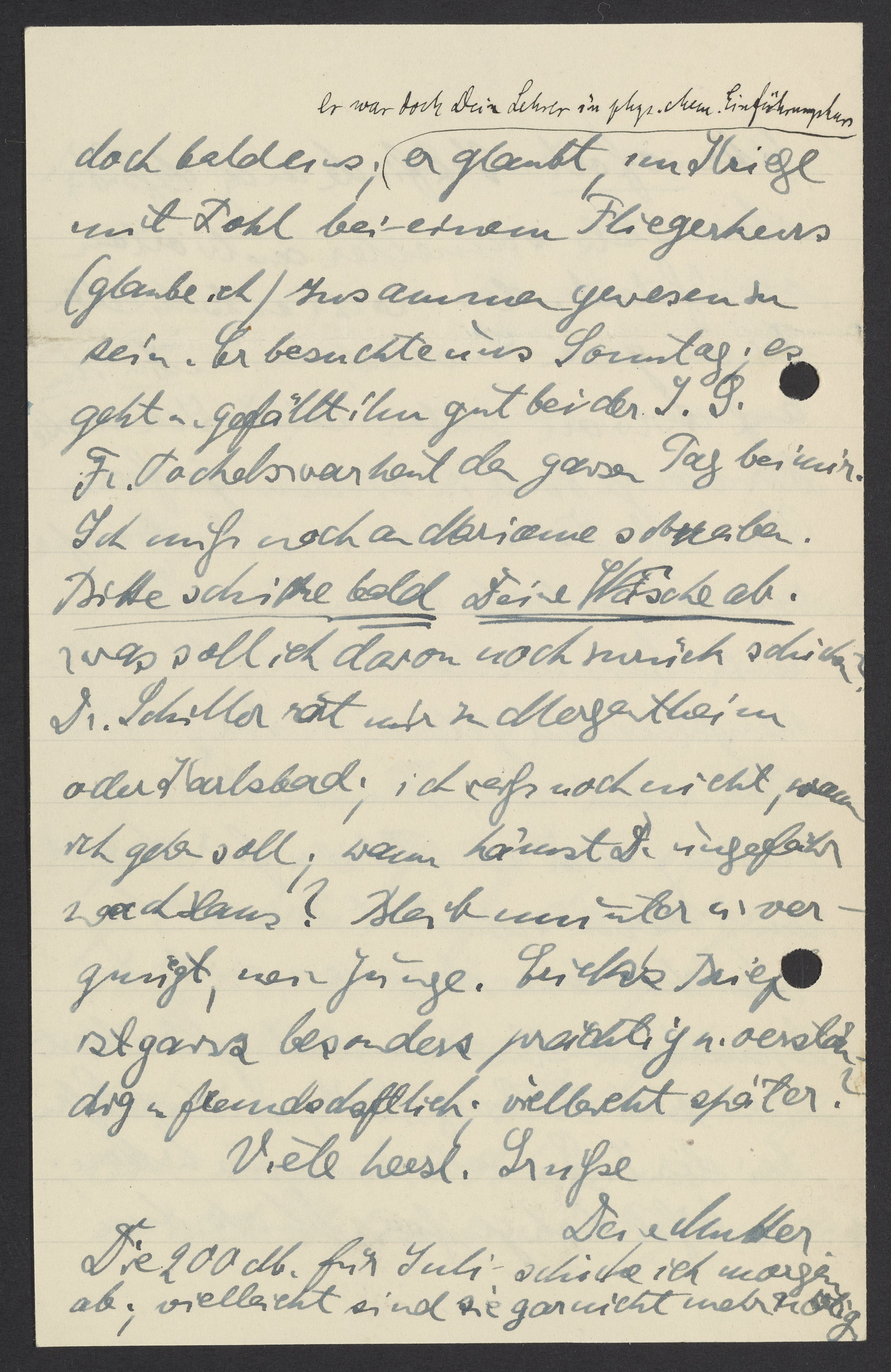doch bald eins; [Georg Bredig’s hand: er war doch Dein Lehrer im physikalischen chemischen Einführungskurs] er glaubt, im Kriege mit Pohl bei einem Fliegerkurs (glaube ich) zusammengewesen zu sein. Er besuchte uns Sonntag; es geht u.[nd] gefällt ihm gut bei der I. G. Frau Pockels war heut den ganzen Tag bei mir. Ich muß noch an Marianne schreiben. Bitte schicke bald Deine Wäsche ab.Was soll ich davon noch zurück schicken? Dr. Schiller rät mir zu Mergentheim oder Karlsbad; ich weiß noch nicht, wann ich gehen soll; wann kämst Du ungefähr nach Haus? Bleib munter u.vergnügt, mein Junge. Eulers Brief ist ganz besonders prächtig u. verständig u. freundschaftlich; vielleicht später?