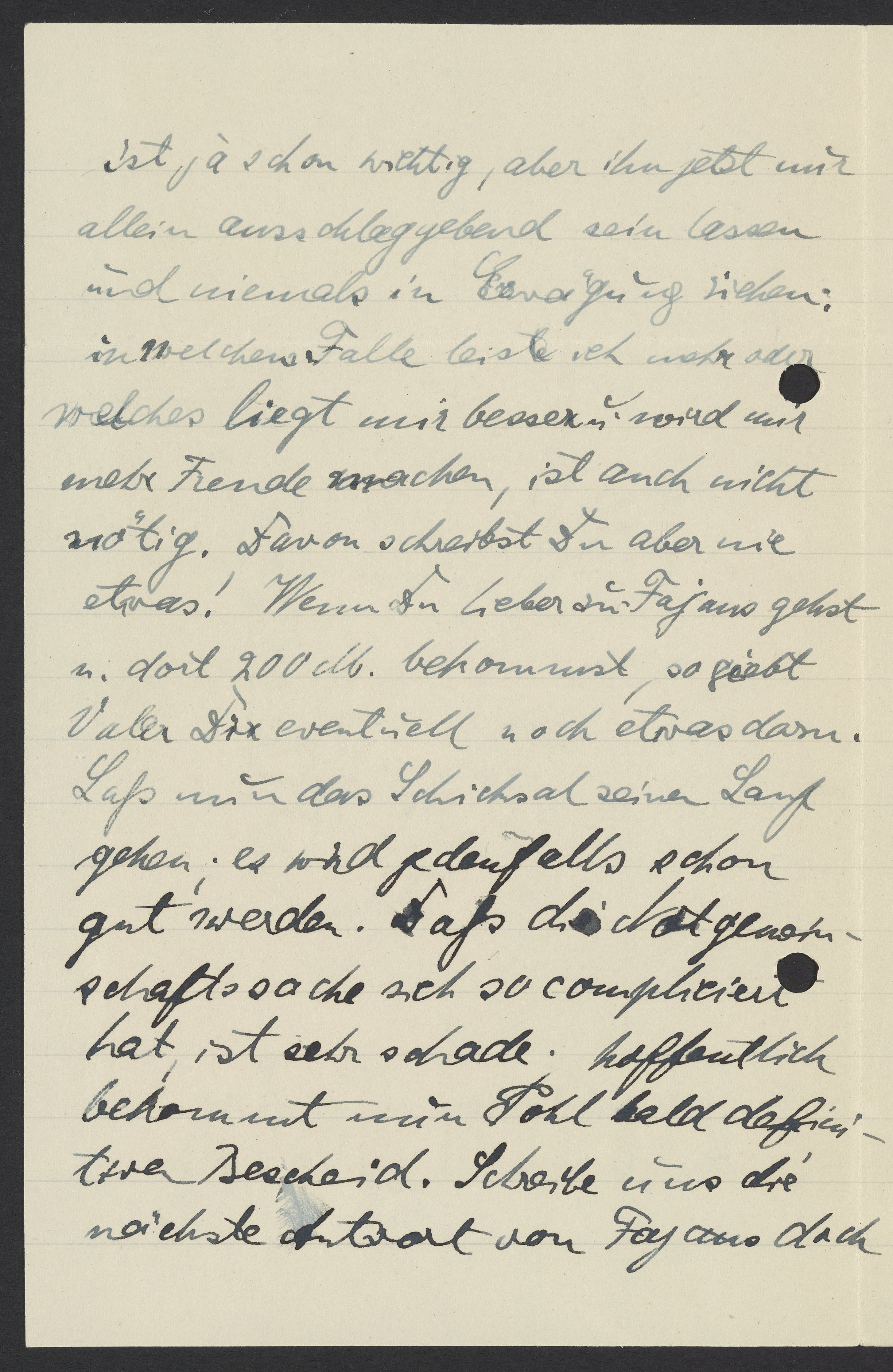 ist ja schon wichtig, aber ihn jetzt nur allein ausschlaggebend sein lassen und niemals in Erwägung ziehen: in welchem Falle leiste ich mehr oder welches liegt mir besser u. wird mir mehr Freude machen, ist auch nicht nötig. Davon schreibst Du aber nie etwas! Wenn Du lieber zu Fajans gehst u. dort 200 M. bekommst, so giebt Vater Dir eventuell noch etwas dazu. Laß nun das Schicksal seinen Lauf gehen; es wird jedenfalls schon gut werden. Daß die Notgemeinschaftssache sich so compliciert hat, ist sehr schade. Hoffentlich bekommt nun Pohl bald definitiven Bescheid. Schreibe uns die nächste Antwort von Fajans doch