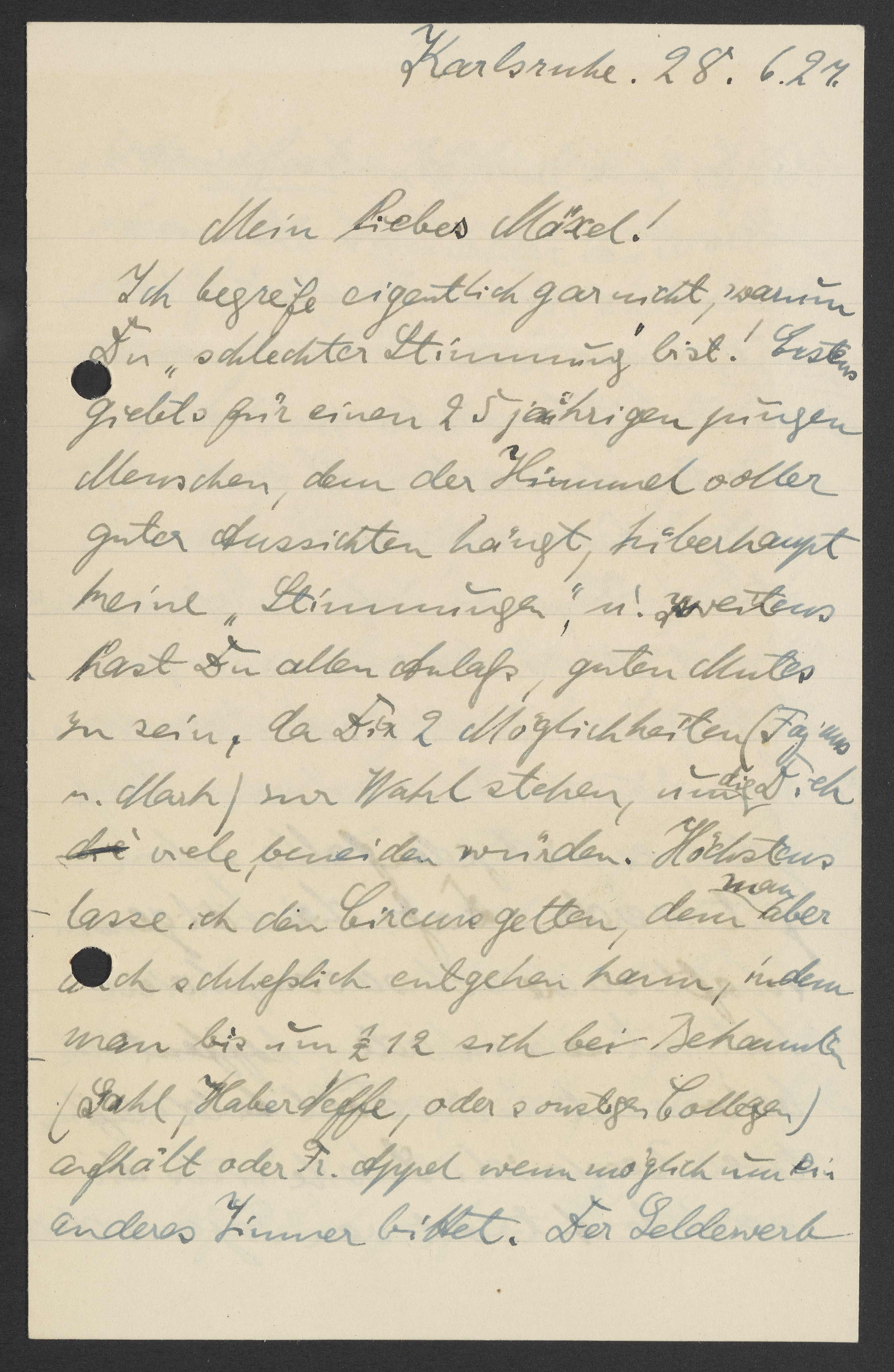 Ich begreife eigentlich gar nicht, warum Du „schlechter Stimmung“ bist! Erstens giebts für einen 25[-]jährigen jungen Menschen, dem der Himmel voller guter Aussichten hängt, überhaupt keine „Stimmungen“, u. zweitens hast Du allen Anlaß, guten Mutes zu sein, da Dir 2 Möglichkeiten (Fajans u. Mark) zur Wahl stehen, um die Dich viele beneiden würden. Höchstens lasse ich den Circus gelten, dem man aber auch schließlich entgehen kann, indem man bis um ½ 12 sich bei Bekannten (Gahl, Haber-Neffe, oder sonstigen Collegen) aufhält oder Frau Appel wenn möglich um ein anderes Zimmer bittet. Der Gelderwerb
