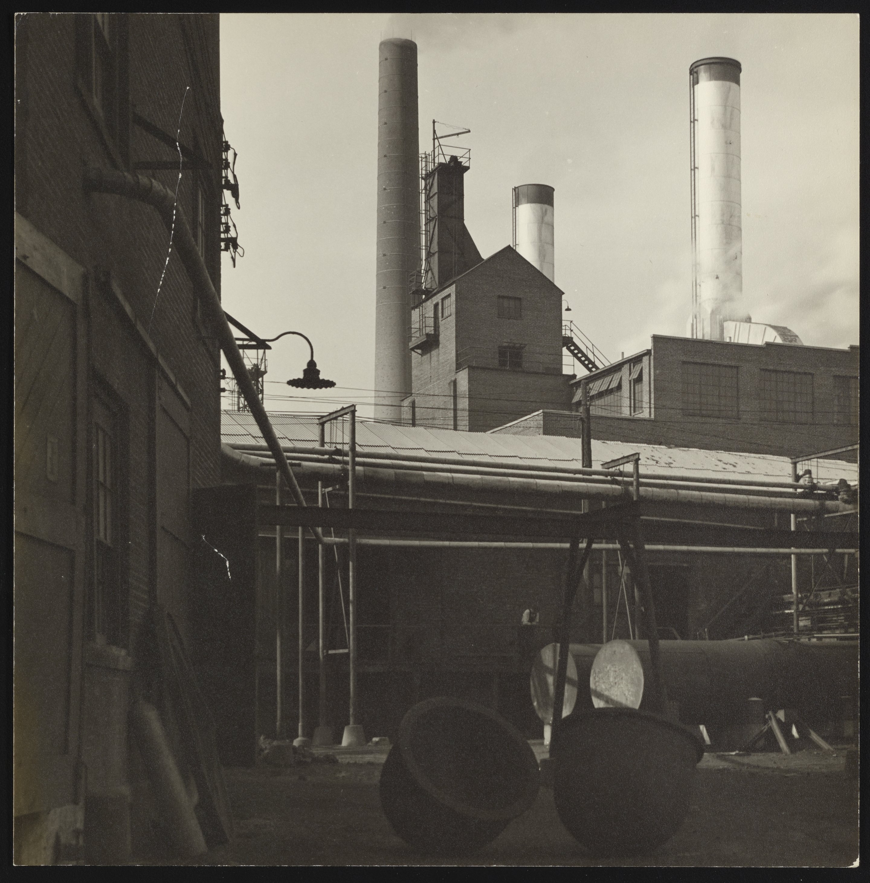 General view of a section of the exterior of the Cliffs Dow wood distillation plant located in Marquette, Michigan. Seeking a source of raw material for its new plastic, ethylcellulose, the Dow Chemical Company joined with the Cleveland-Cliffs Iron Company to form the Cliffs Dow Chemical Company in April 1935. The Cliffs Dow plant in Marquette primarily produced charcoal used in the manufacture of pig iron, as well as a range of chemical by-products including acetic acid, calcium acetate, wood alcohol, and ethyl alcohol. Notably, when the Marquette plant ceased operations in 1969, it was the last wood distillation plant in the United States.