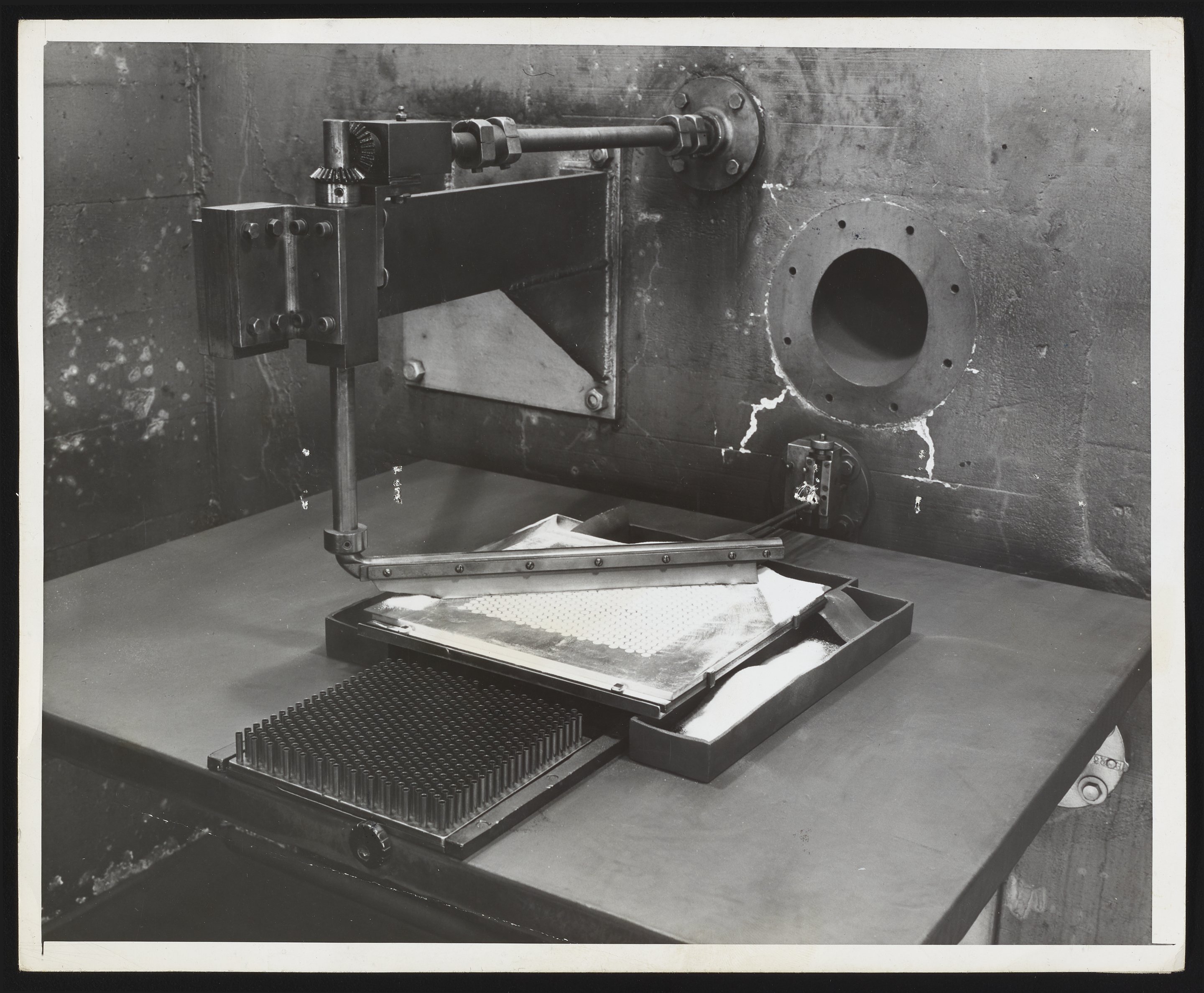 Hercules Incorporated. “Charge and Press Machine at Hercules Port Ewen Plant,” March 1945. Photographs from the Records & Ephemera of Hercules Incorporated, Box 2, Folder 36. Science History Institute. Philadelphia. https://digital.sciencehistory.org/works/4x51hj57p.