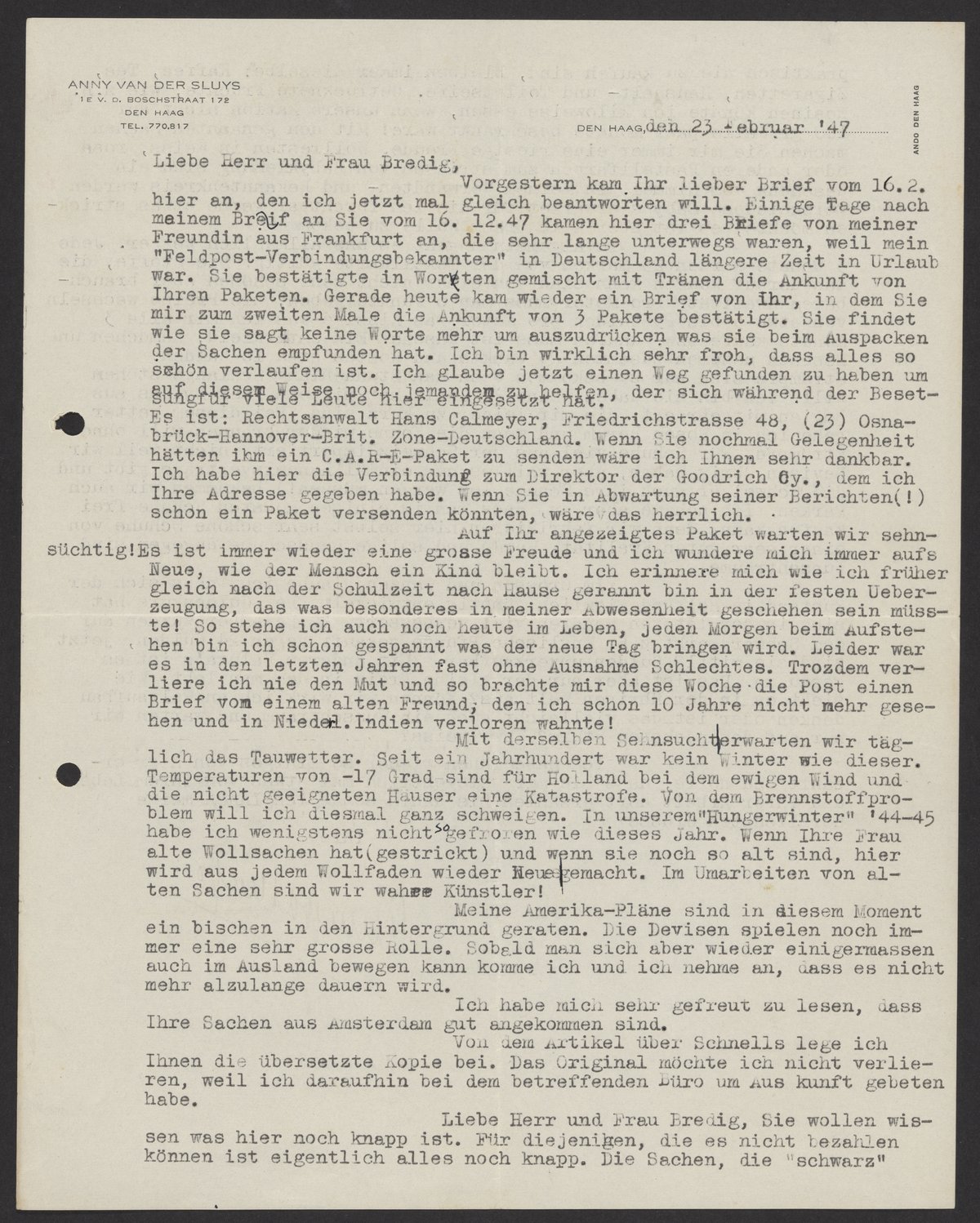 Letter from Anny van der Sluys to Lydia and Max Bredig, February 23, 1947