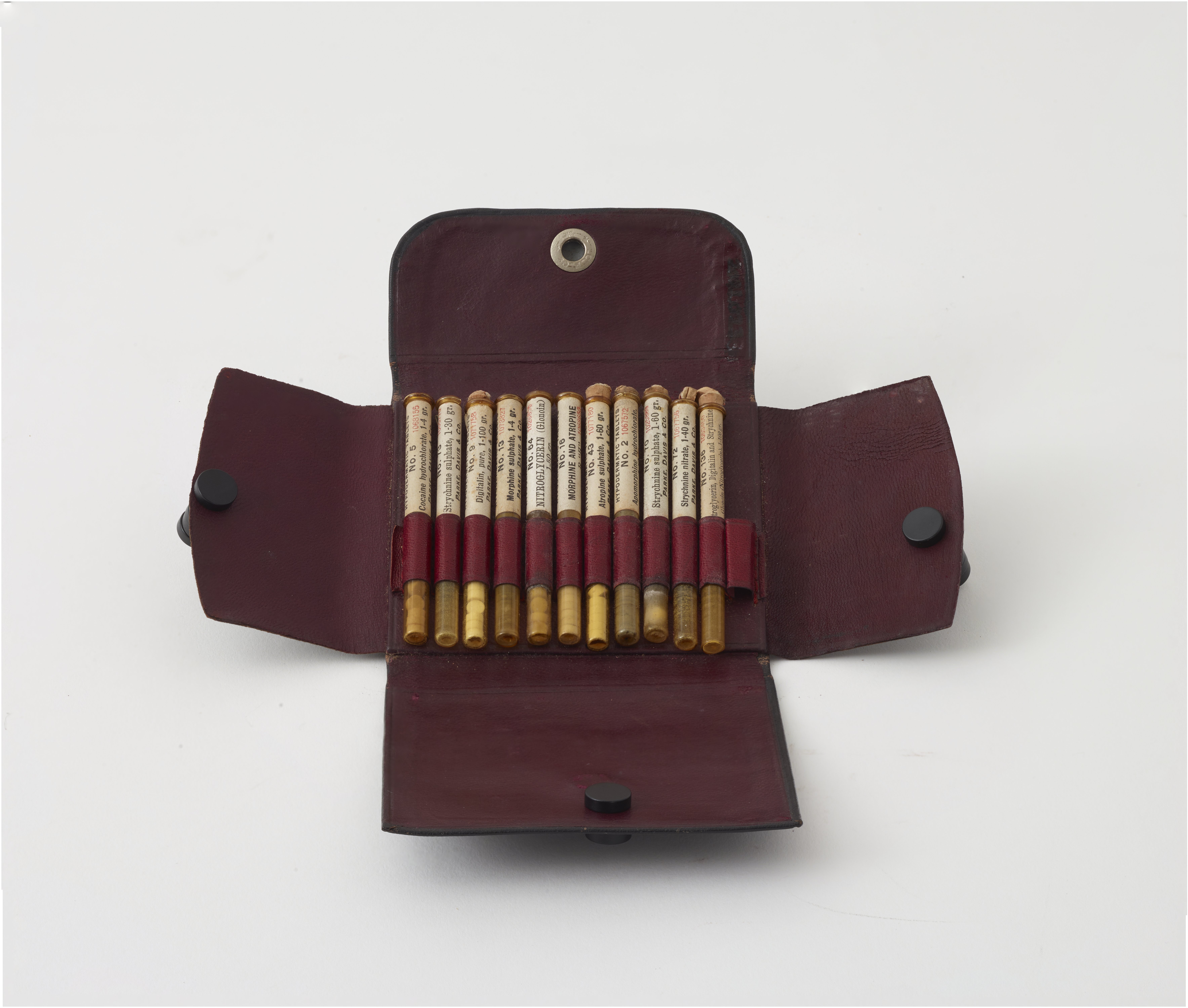 Small JPG1200 x 1019px — 92.7 KBLarge JPG2880 x 2444px — 428 KBFull-sized JPG7069 x 6000px — 2.1 MBOriginal fileTIFF — 7069 x 6000px — 121 MBA black leather pouch containing 11 vials of various pharmaceutical tablets. Five vials are empty, and one is missing.