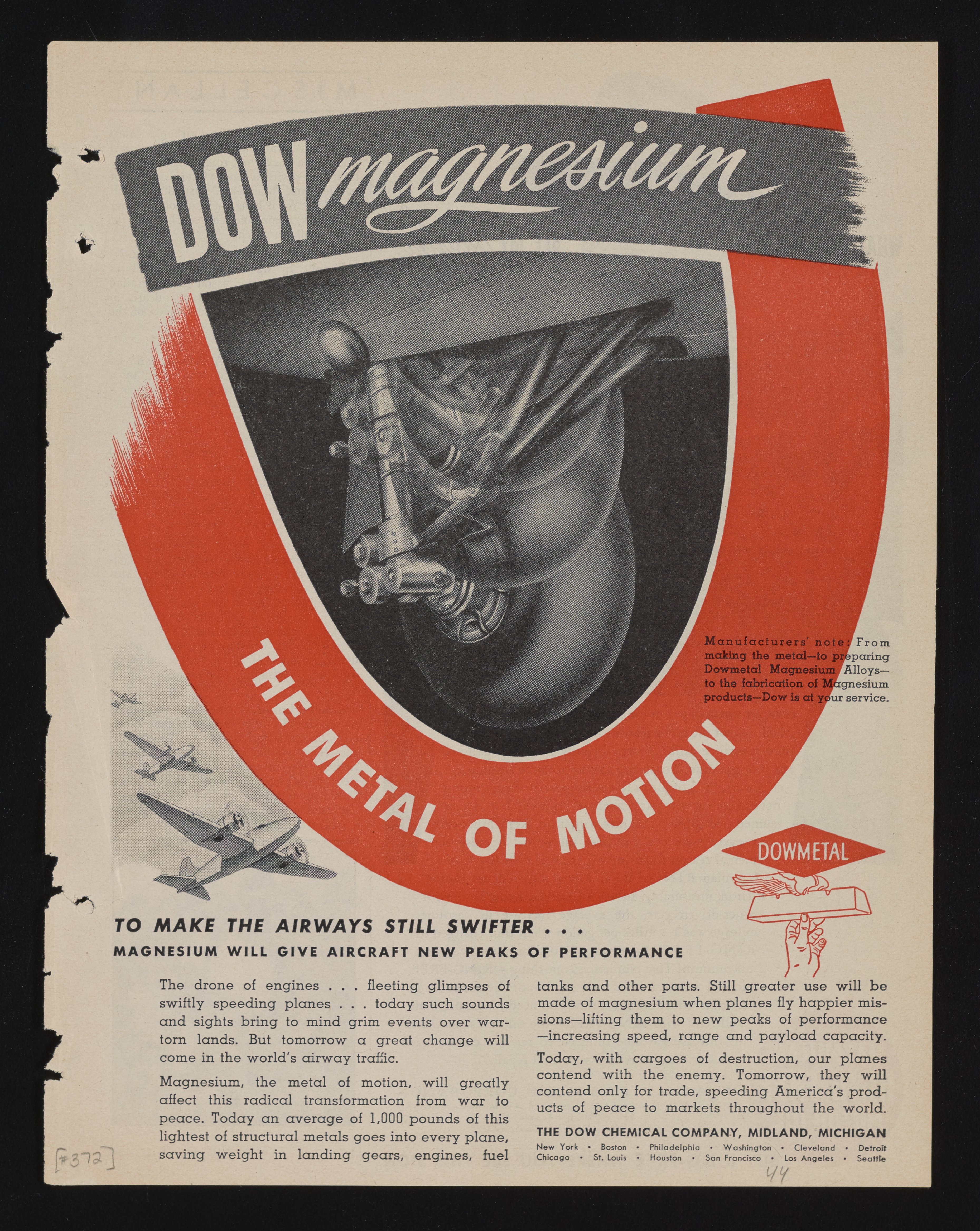 Dow Chemical Company. “Dow Magnesium: The Metal of Motion,” March 27, 1944. Advertisements from the Dow Chemical Historical Collection, Box 8. Science History Institute. Philadelphia. https://digital.sciencehistory.org/works/529t1bx.