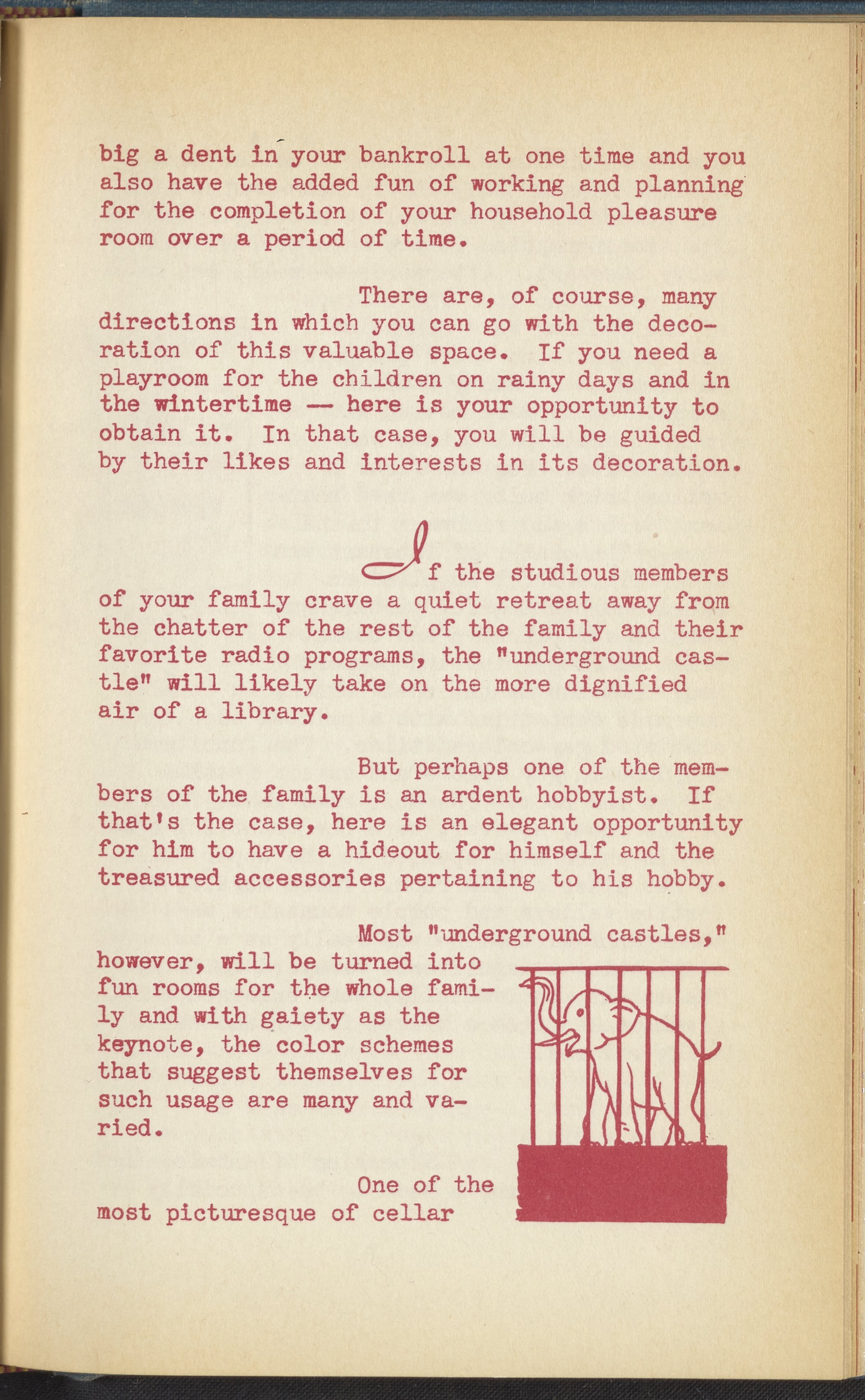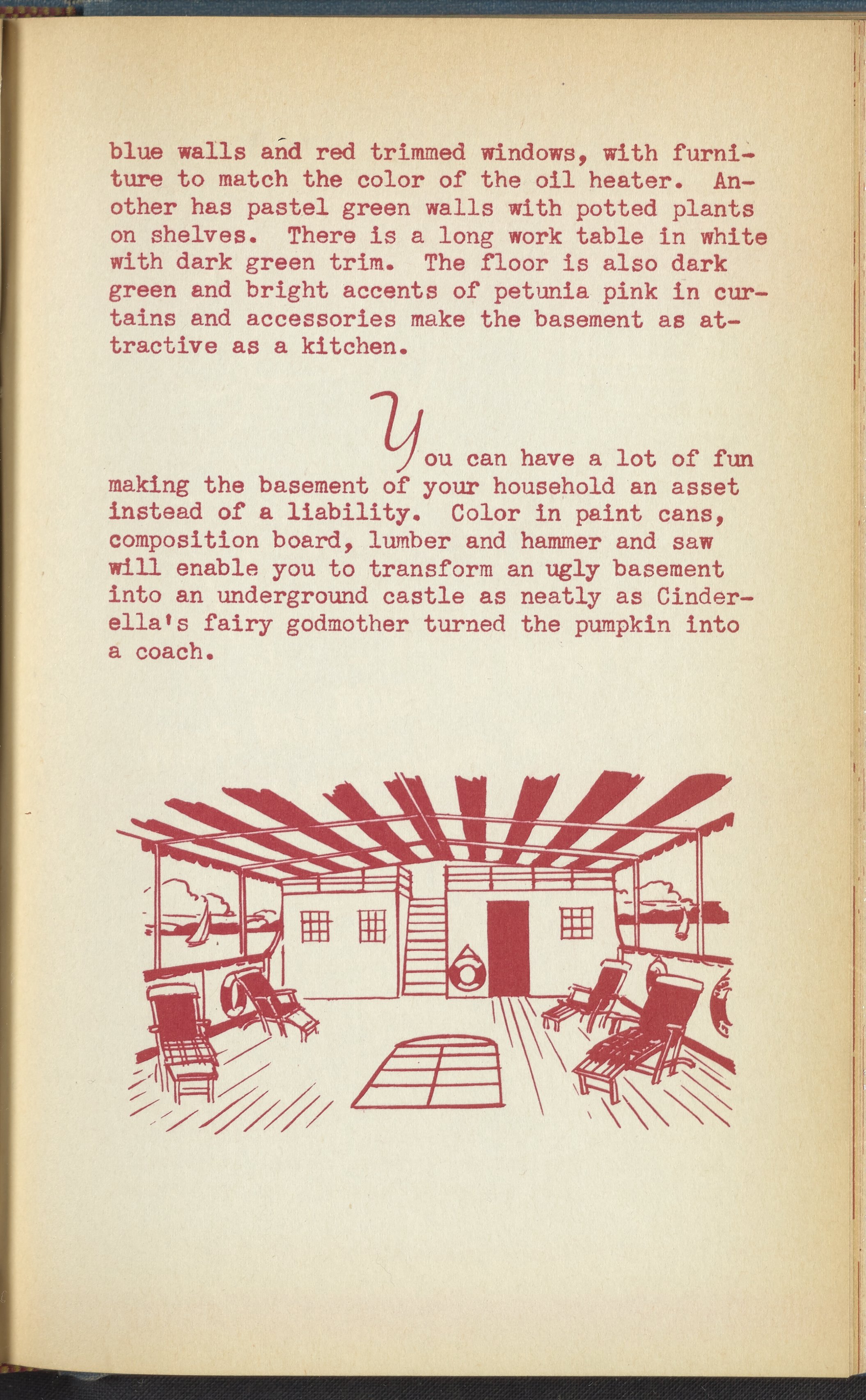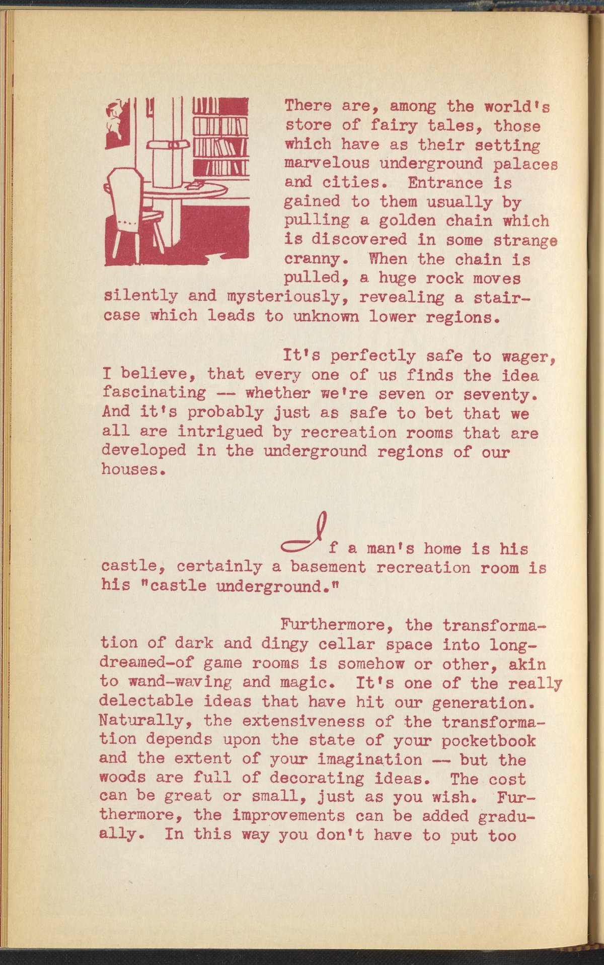 Booklet corresponding to a radio broadcast program created by the National Paint, Varnish, and Lacquer Association. The booklet discusses how to transform a home's basement or cellar into a recreation room, or "underground castle". Describes several different basement recreation rooms to inspire the reader, and provides tips for decorating a recreation room. Tips include painting a mural, adding improvements gradually, and decorating the room according to a theme or desired utility. Includes small stylized illustrations throughout and decorated covers.