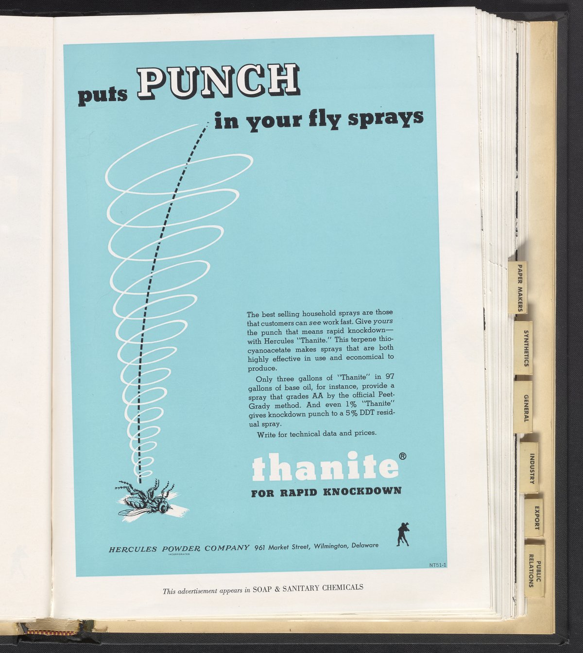 Hercules Incorporated. “Puts Punch in Your Fly Sprays.” 1951 Hercules Advertisements, 1951. Records of Hercules Incorporated, Volume 1951. Science History Institute. Philadelphia. https://digital.sciencehistory.org/works/5425kb54n.